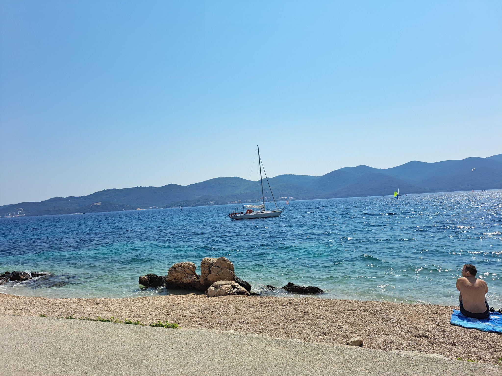 The apartment's exterior offers ample opportunities for relaxation and enjoyment. A sheltered terrace beckons for meals outdoors or simply unwinding throughout the day. For sun enthusiasts, an additional terrace with sun loungers provides spectacular views of the Pelješac channel and the neighboring island of Korcula. Exclusive for our guests, the garden invites for sole use, and an outdoor grill is provided for delightful barbecue evenings. Additionally, we offer a storage space for surfing equipment, conveniently located mere meters from the beach.