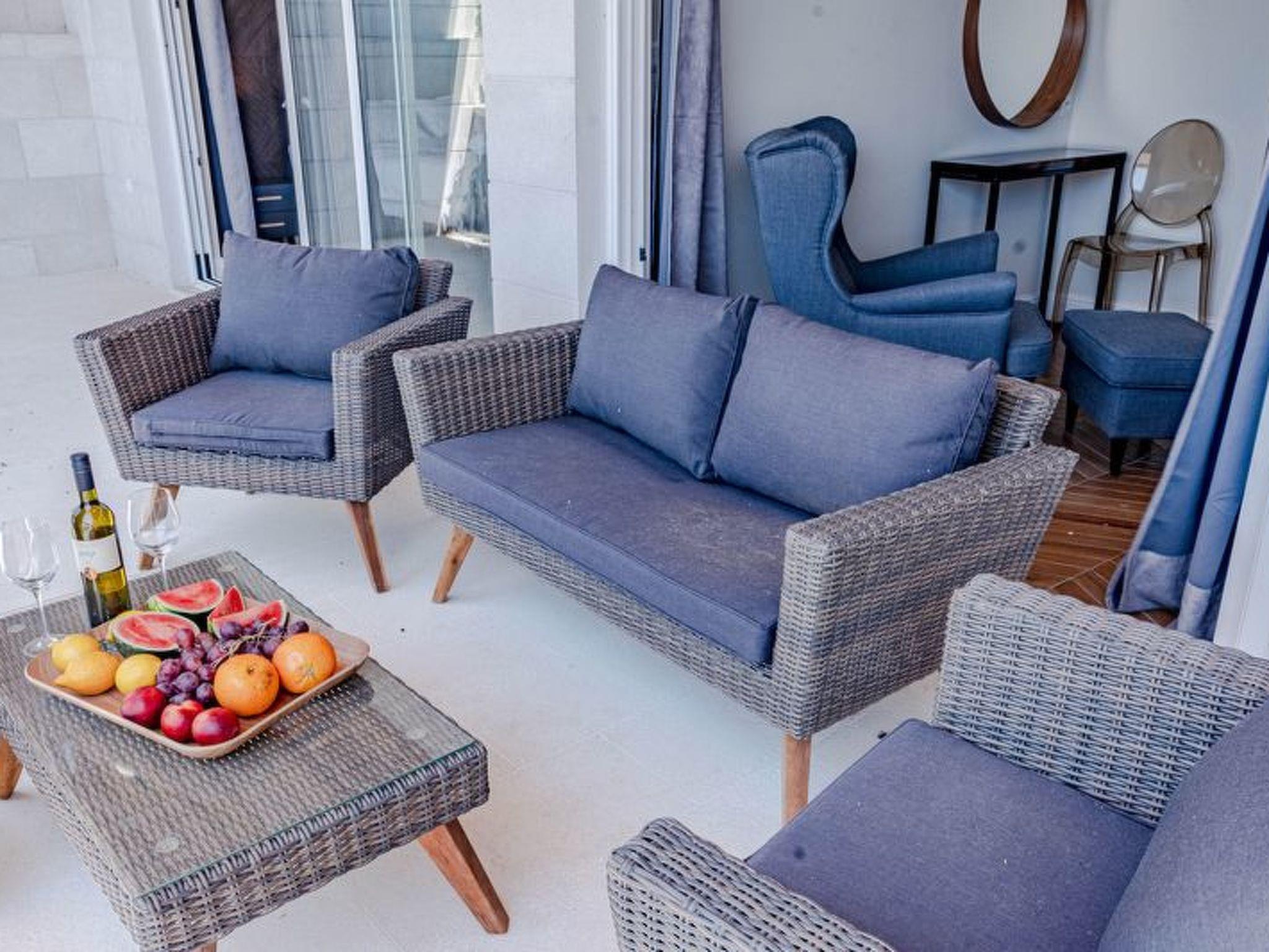 The apartment provides guests with a terrace, sea views, a seating area, a flat-screen TV, a fully equipped kitchen with a dishwasher and an oven, and a private bathroom with shower and a hair dryer. A microwave, a toaster and fridge are also featured, as well as a kettle. At the apartment complex, the units are equipped with bed linen and towels. Guests can take advantage of the warm weather with the property's barbecue facilities and enjoy the outdoor swimming pool and garden at the apartment.