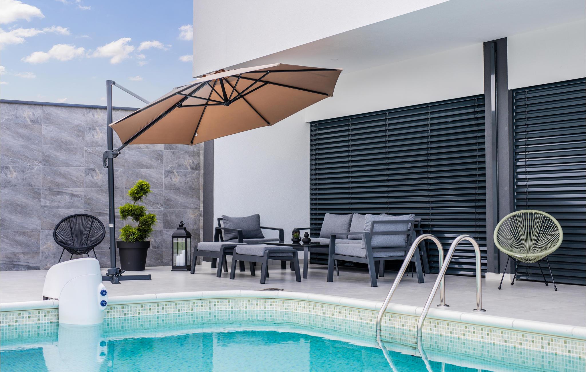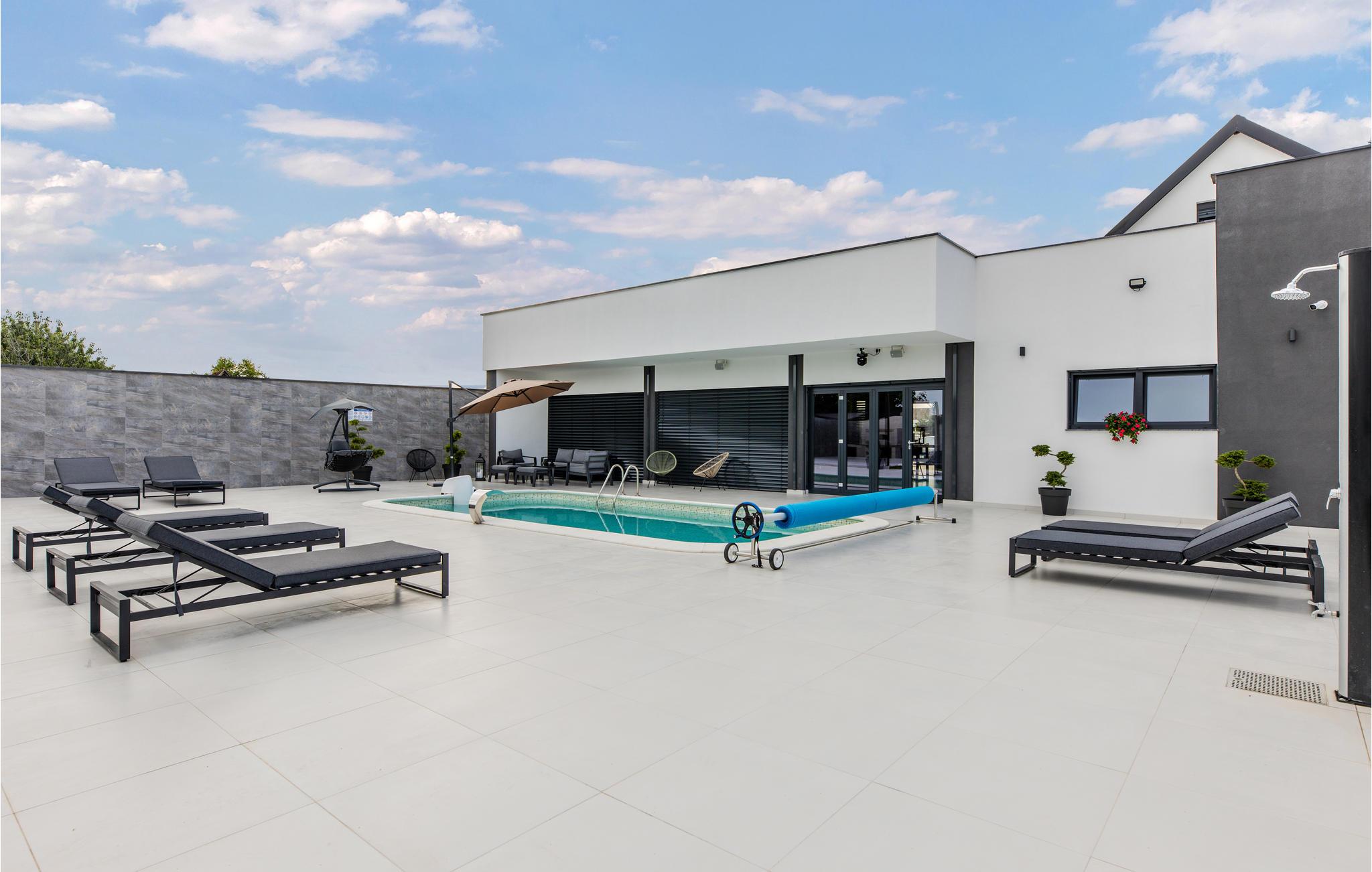 Allerede når I kører ind på gårdspladsen med bilen, kan I kun sige "wow". Her har I plads til jeres køretøjer og kan parkere dem. Når I træder ind i det fantastiske hus, vil I blive imponeret over den moderne og stilfulde indretning. De mange siddepladser indbyder til hyggelige middage. Fra den store opholdsstue kan I træde ud på den lyst indrettede terrasse med stilfulde havemøbler. Poolen inviterer jer til at tage den første svømmetur om morgenen efter at I er stået op. Murstensgrillen giver jer masser af plads til at tilberede mad om aftenen og mætte alle.