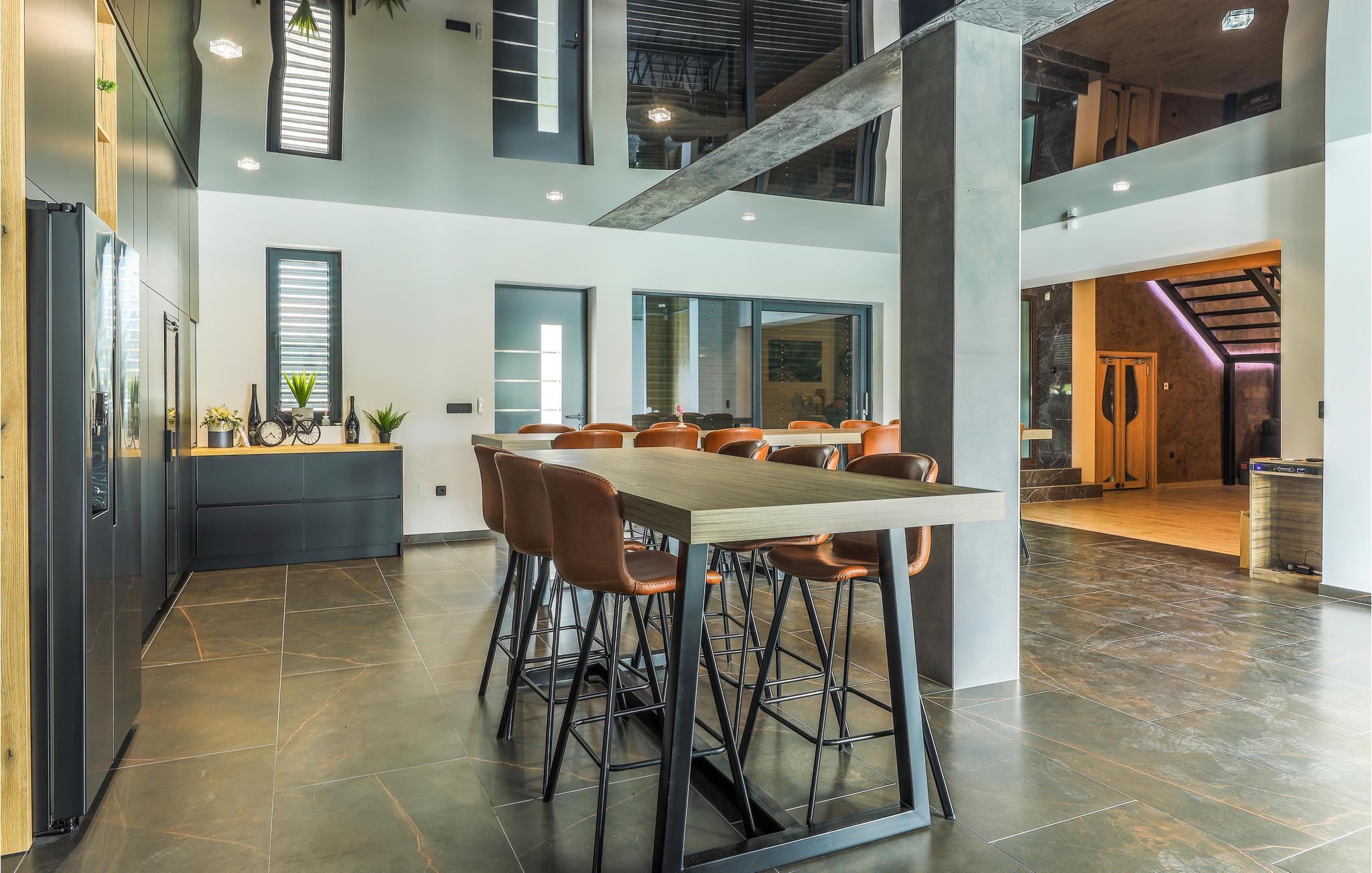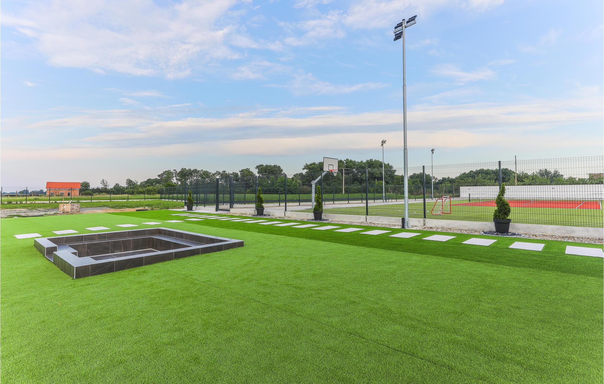 Sportspladsen ved siden af terrassen er husets særlige højdepunkt. Det giver jer den perfekte mulighed for at træne under ferien og udfordre hinanden til basketball-, fodbold- eller tenniskampe. Bagefter kan I slappe af i husets wellnessområde. Her opfyldes alle ønsker, og saunaen og boblebadet bidrager til jeres velbefindende. Det store antal badeværelser garanterer privatlivets fred, hvis I ønsker et langt bad i fred og ro.