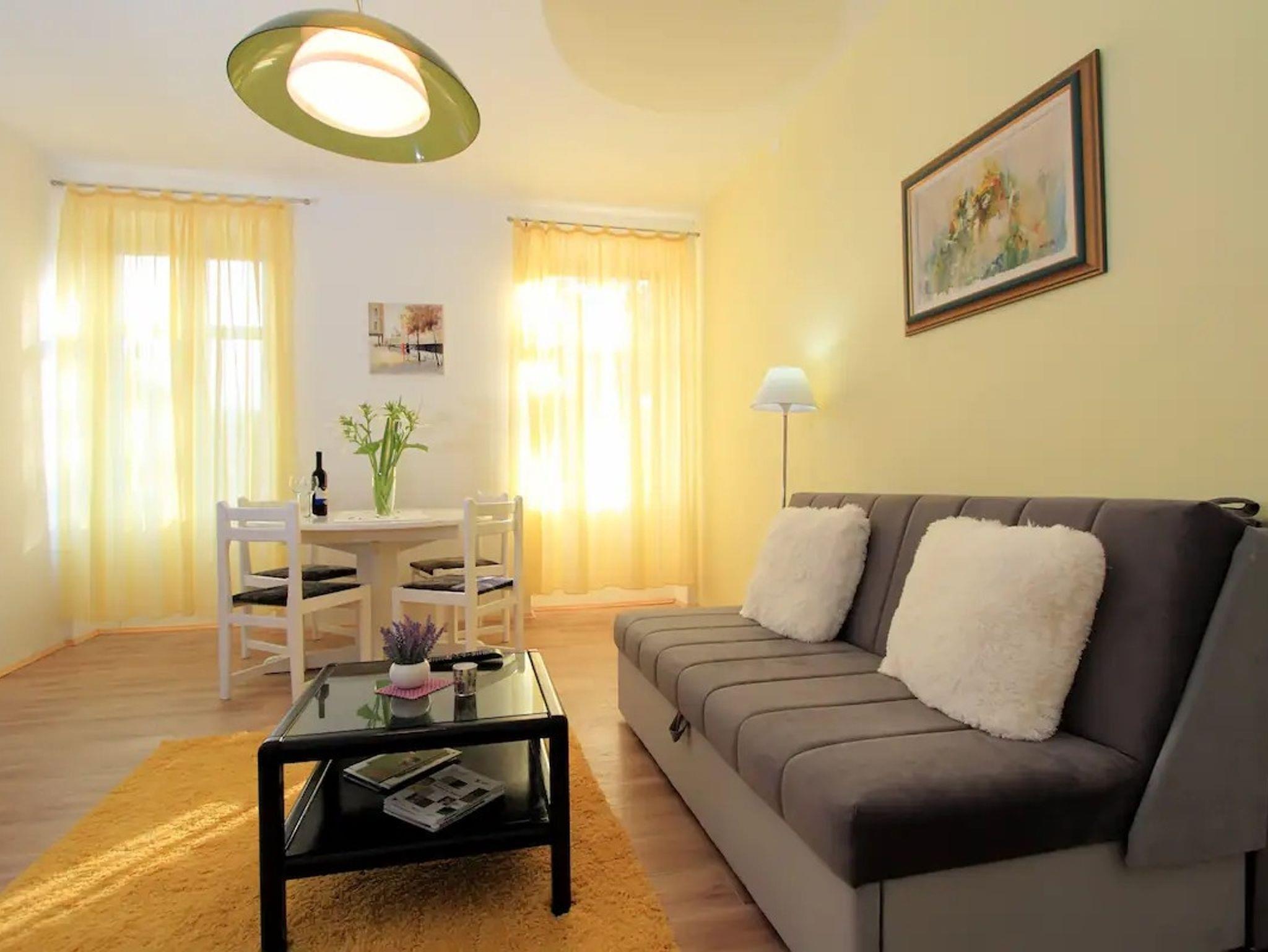 Ferienwohnung bietet Platz für 6 Gäste. Die Betten sind in Schlafzimmern, die es 2 gibt, und in Wohnzimmer, innerhalb einer Gesamtfläche von 68m2, angeordnet. Es ist erlaubt, Speisen auf dem Gemeinschafts-Grill vorzubereiten. Die reservierte Unterkunftseinheit hat keinen Balkon und keine Terrasse. IM PREIS INBEGRIFFEN: Kurtaxe, Endreinigung, Zentralheizung, Parkplatz, Internet, Kinderbett, Bügeleisen, Föhn. Die Verfügbarkeit zusätzlicher Dienstleistungen in Ihrem reservierten Termin und die Preise derselben (falls nicht aufgeführt) müssen im Voraus überprüft werden. Zusätzliche Dienstleistungen die in der Zahlungsaufforderung nicht aufgeführt sind werden direkt beim Vermieter bezahlt, angenommen der Gast nutzt auch diese.