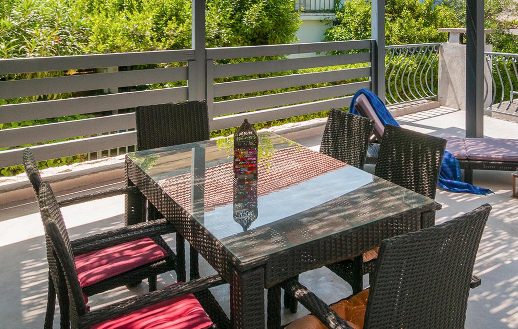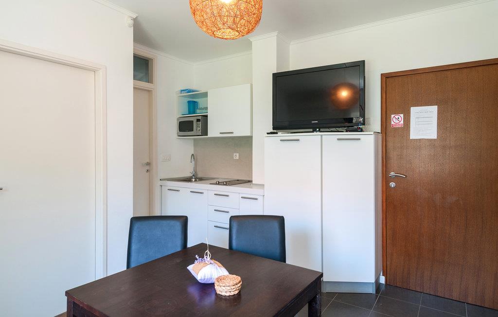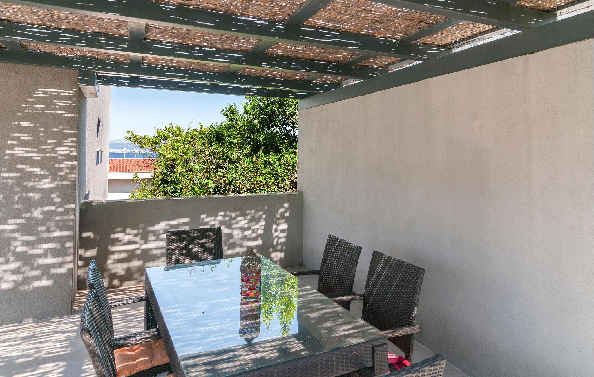 Denne lyse bolig tilbyder jer alt, hvad I har brug for til en sjov og afslappende ferie. Interiøret er indbydende og imponerer med udvalget af moderne og stilfulde dekorationer og møbler. På køligere dage kan I føle jer godt tilpas inde på sofaen og hygge jer med jeres medbragte spil eller en god bog, eller I kan bruge den åbne terrasse til at nyde feriens måltider i det fri. I har også adgang til et udekøkken, der deles med husets øvrige lejligheder.