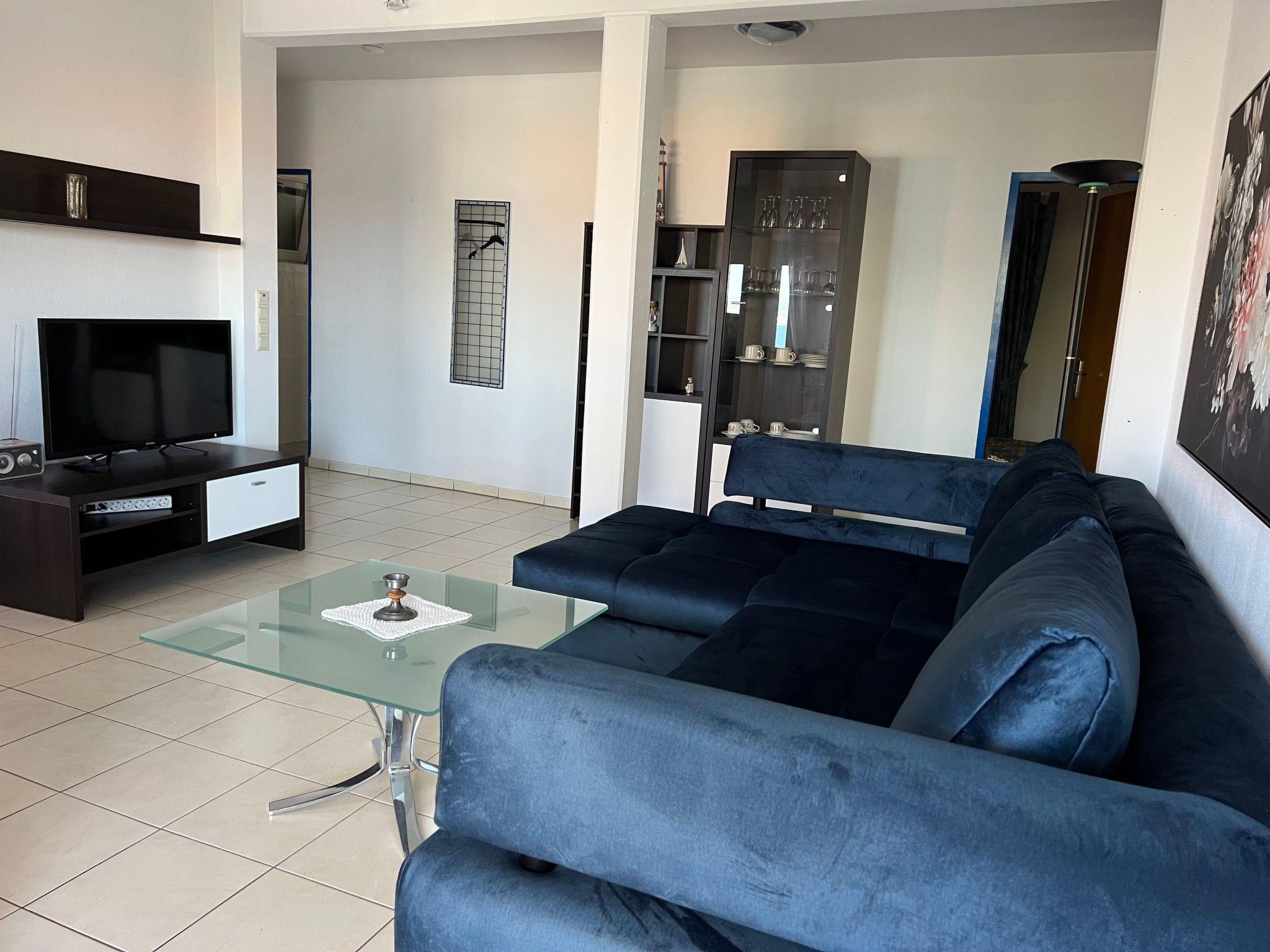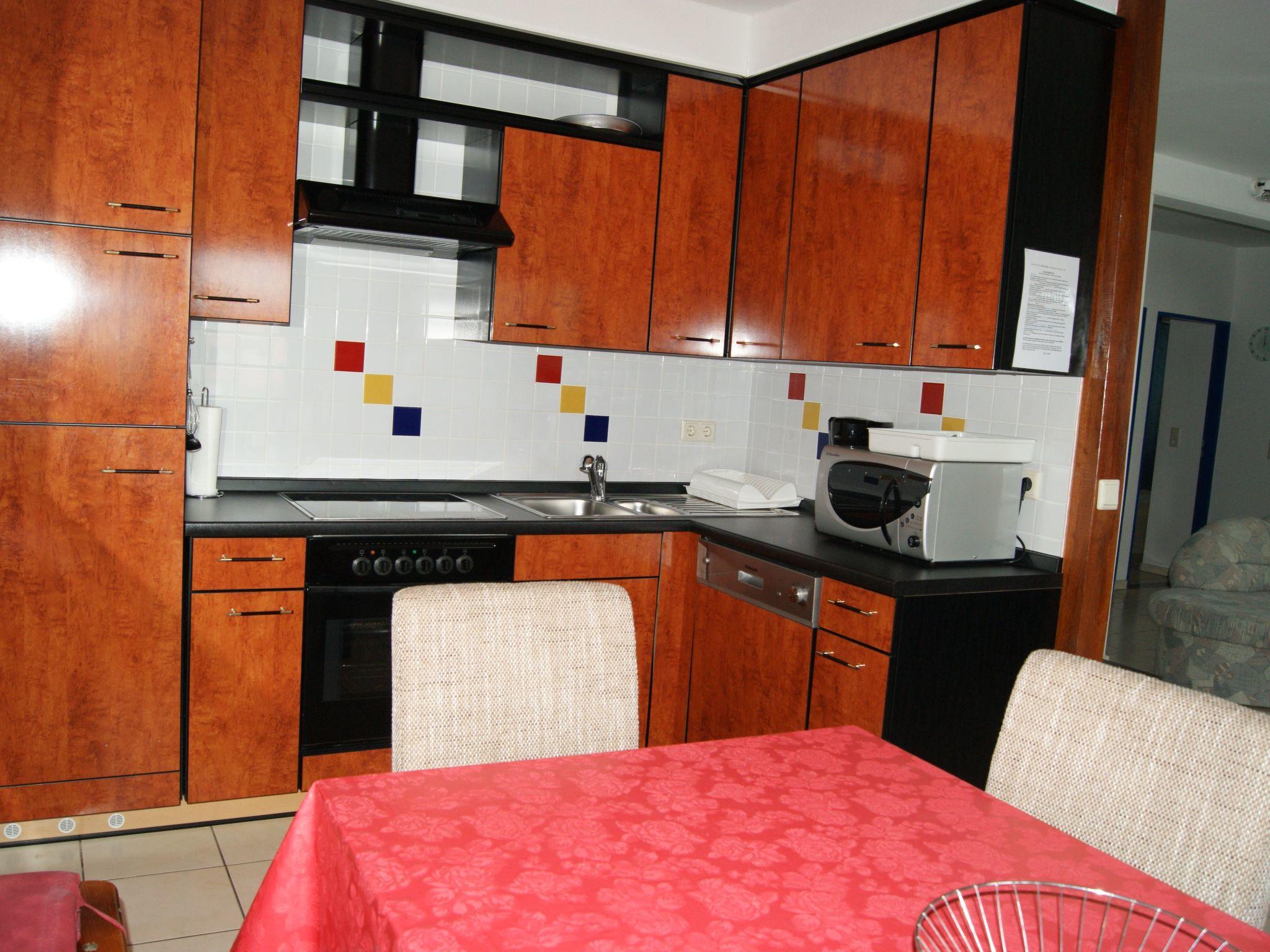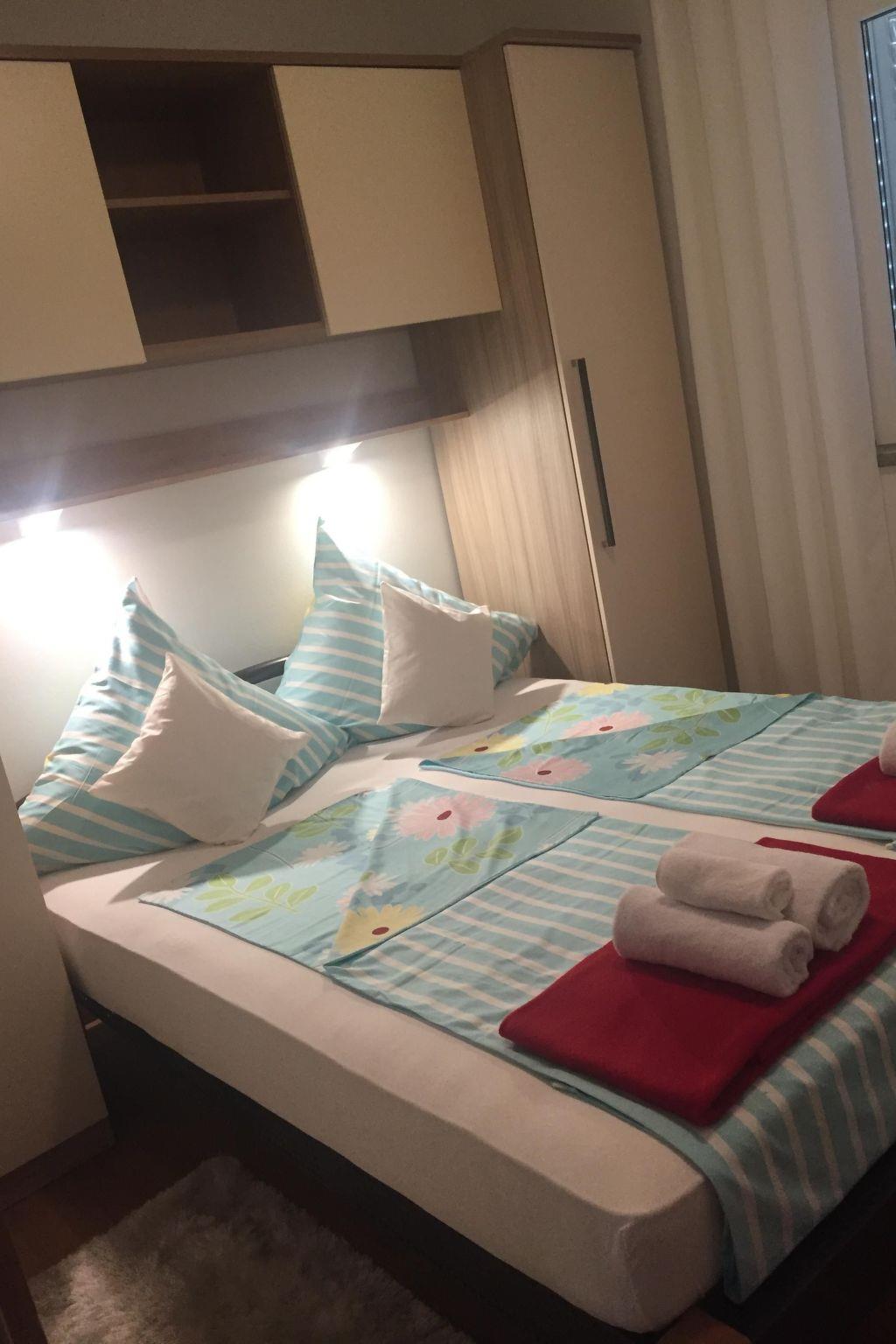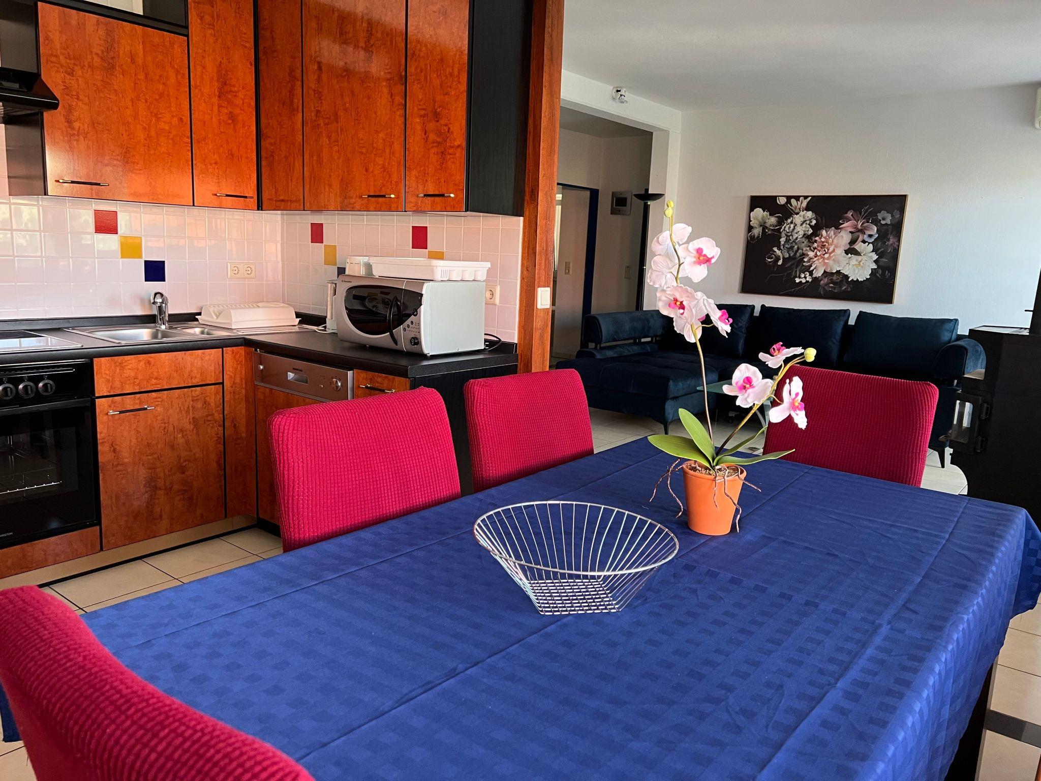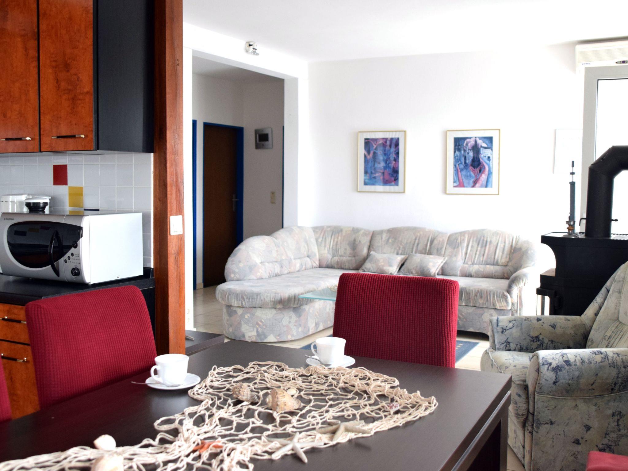 The holiday apartment of around 100m² is on the ground floor. All the windows are fitted with insect screens. The big living room with a suite, fireplace stove and satellite TV invite you to enjoy leisurely gatherings. It also has an open-plan kitchen equipped with all the necessary kitchen utensils, along with a coffee machine, dishwasher, microwave, oven, fridge, freezer, ceramic hob and toaster. You can enjoy meals together at the big dining table. Three separate bedrooms offer all guests ample space to retreat. The first is furnished with a kingsize bed (160 x 200cm), the second with a kingsize bed the same size and a sofa bed (140 x 200cm) for one person, the third with two single beds. Two modern shower rooms with a WC round off the accommodation.