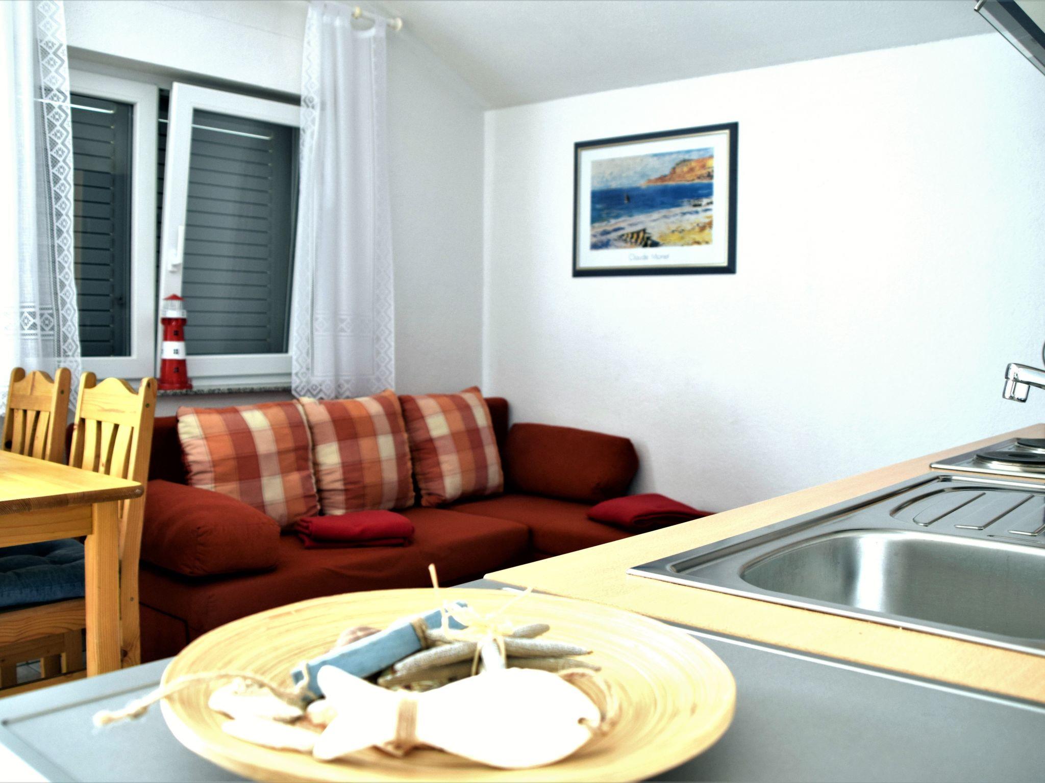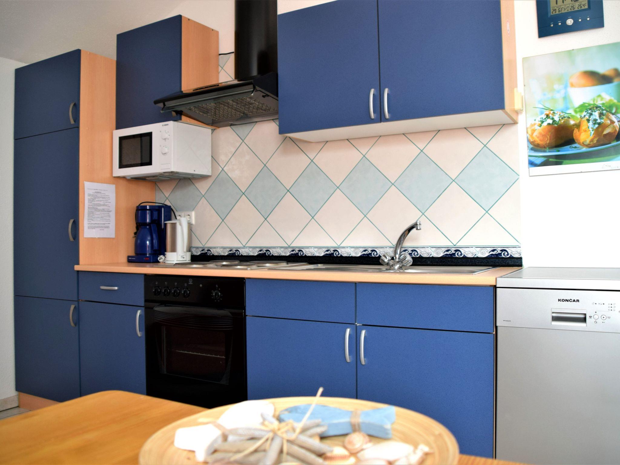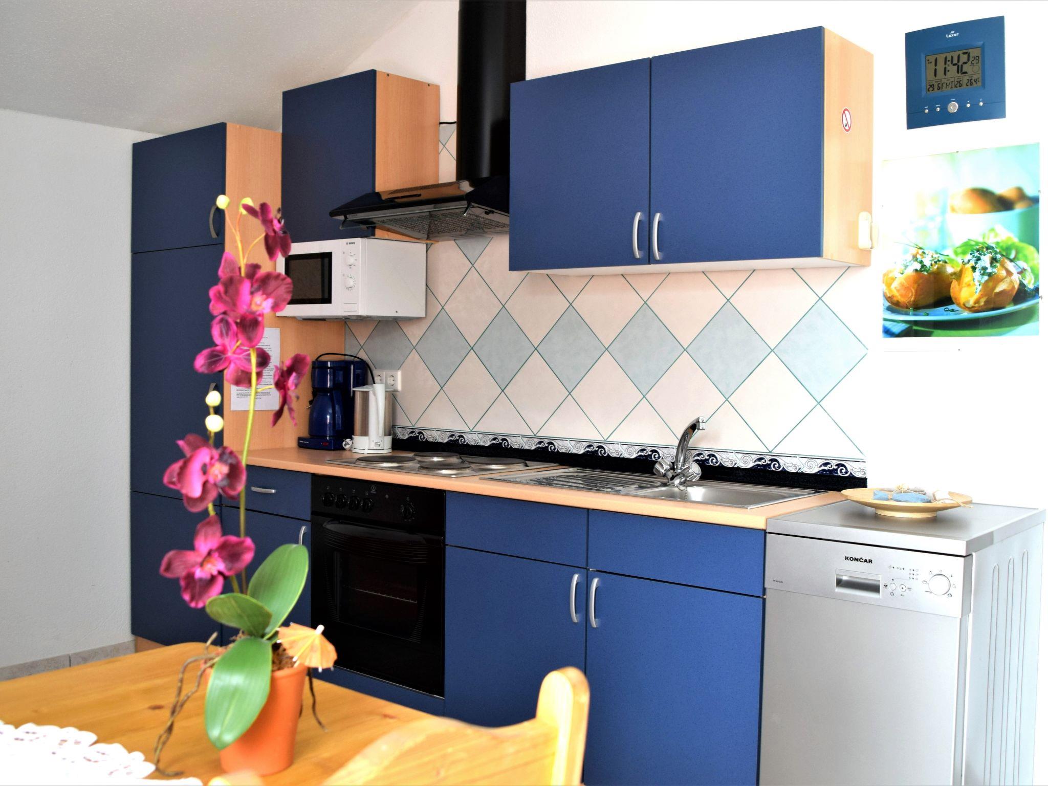 The 50m² holiday apartment is on the first floor. Two separate bedrooms provide all guests with plenty of space to retreat. The first is furnished with a kingsize bed (160 x 200cm), the second with two single beds. The hallway leads to the light living and dining room with a open-plan kitchen for self-catering, equipped with all the essential kitchen utensils, along with a coffee machine, dishwasher, microwave, oven, fridge, freezer, ceramic hob and toaster. A dining table, a sofa and satellite/cable TV, as well as a radio invite you to relax and enjoy sociable togetherness. The sofa can also be used as a bed (140 x 200cm) for one person. All the windows are fitted with fly screens. A modern shower room with a WC and hairdryer rounds off the accommodation.