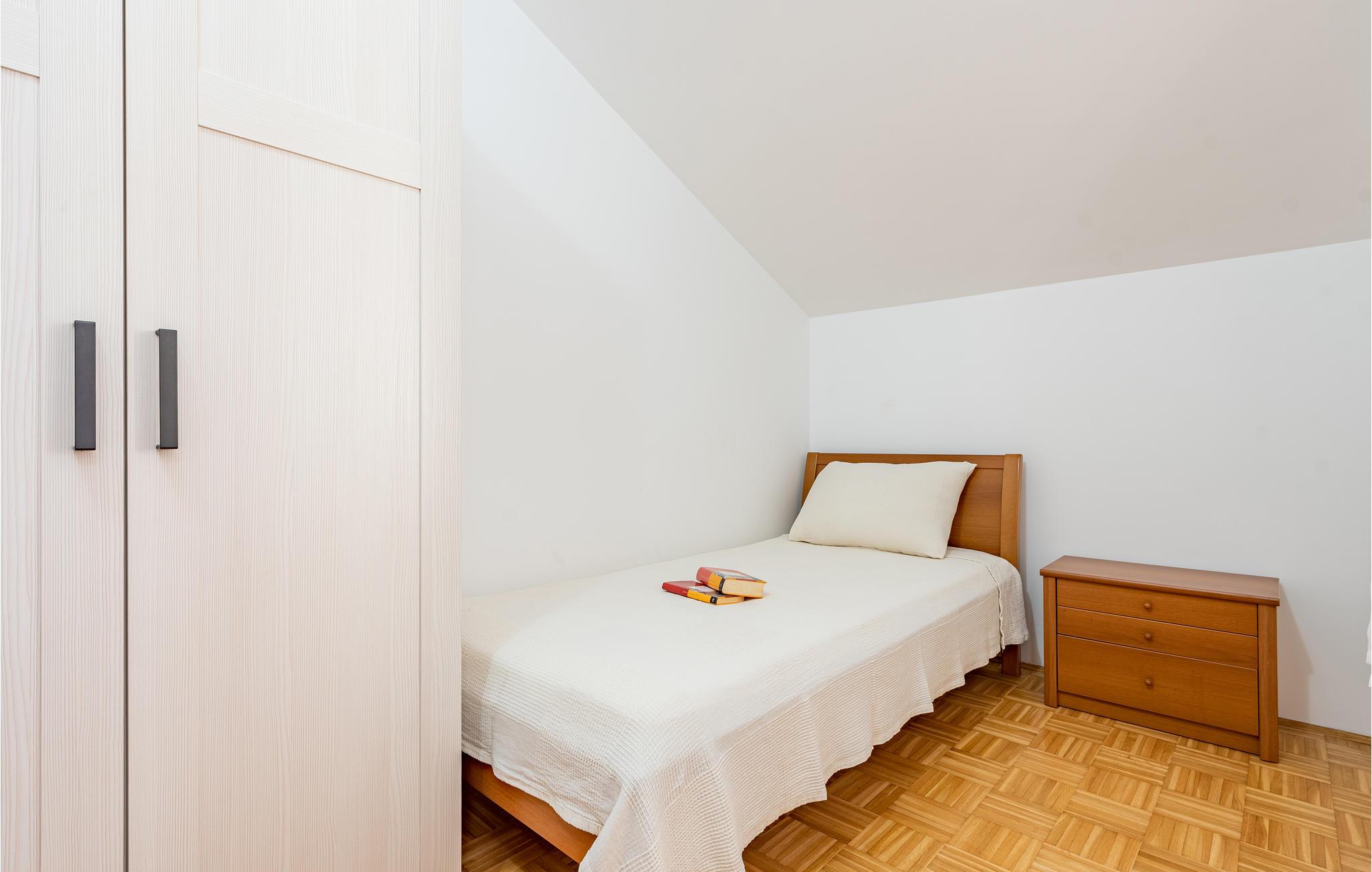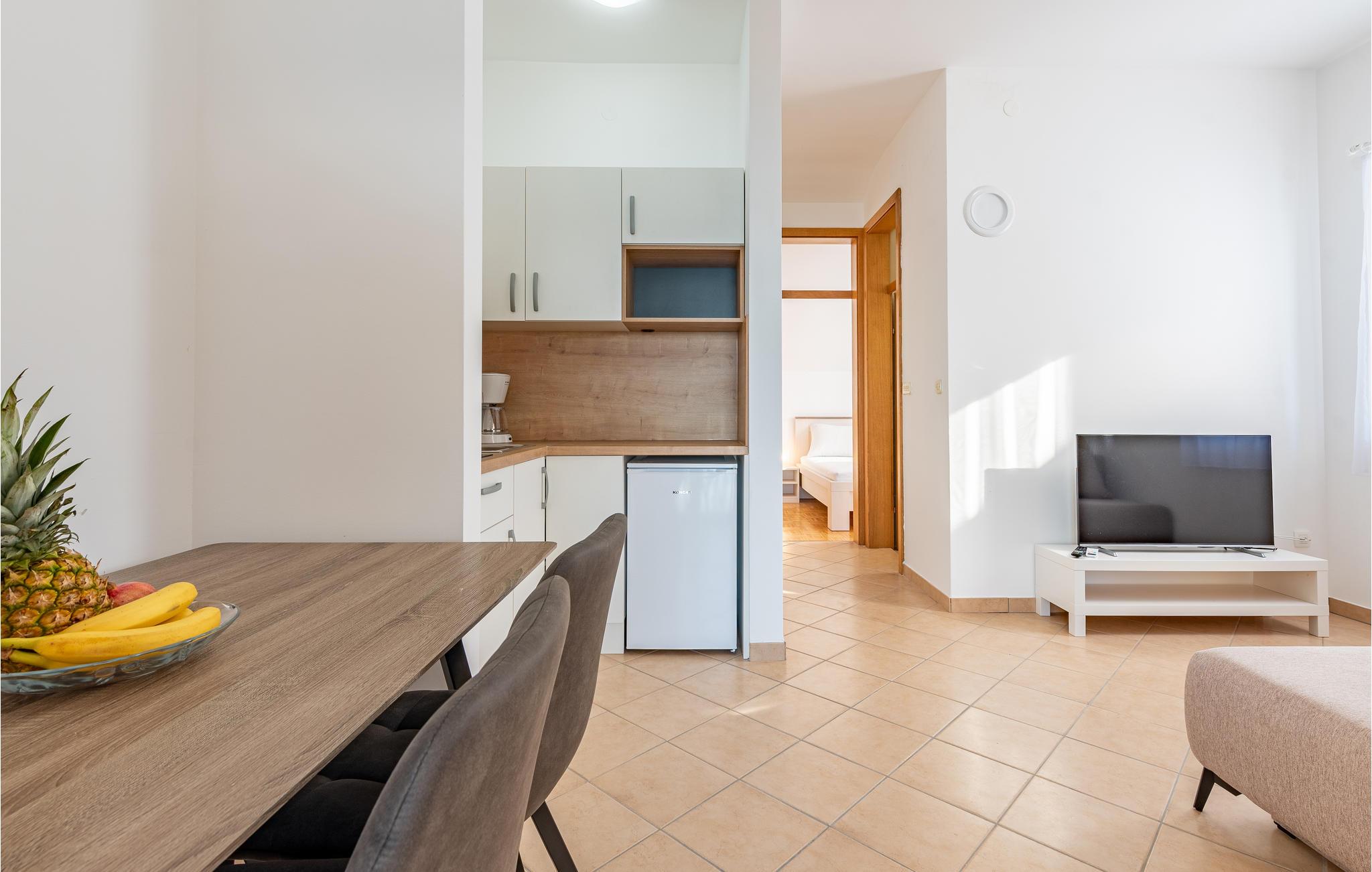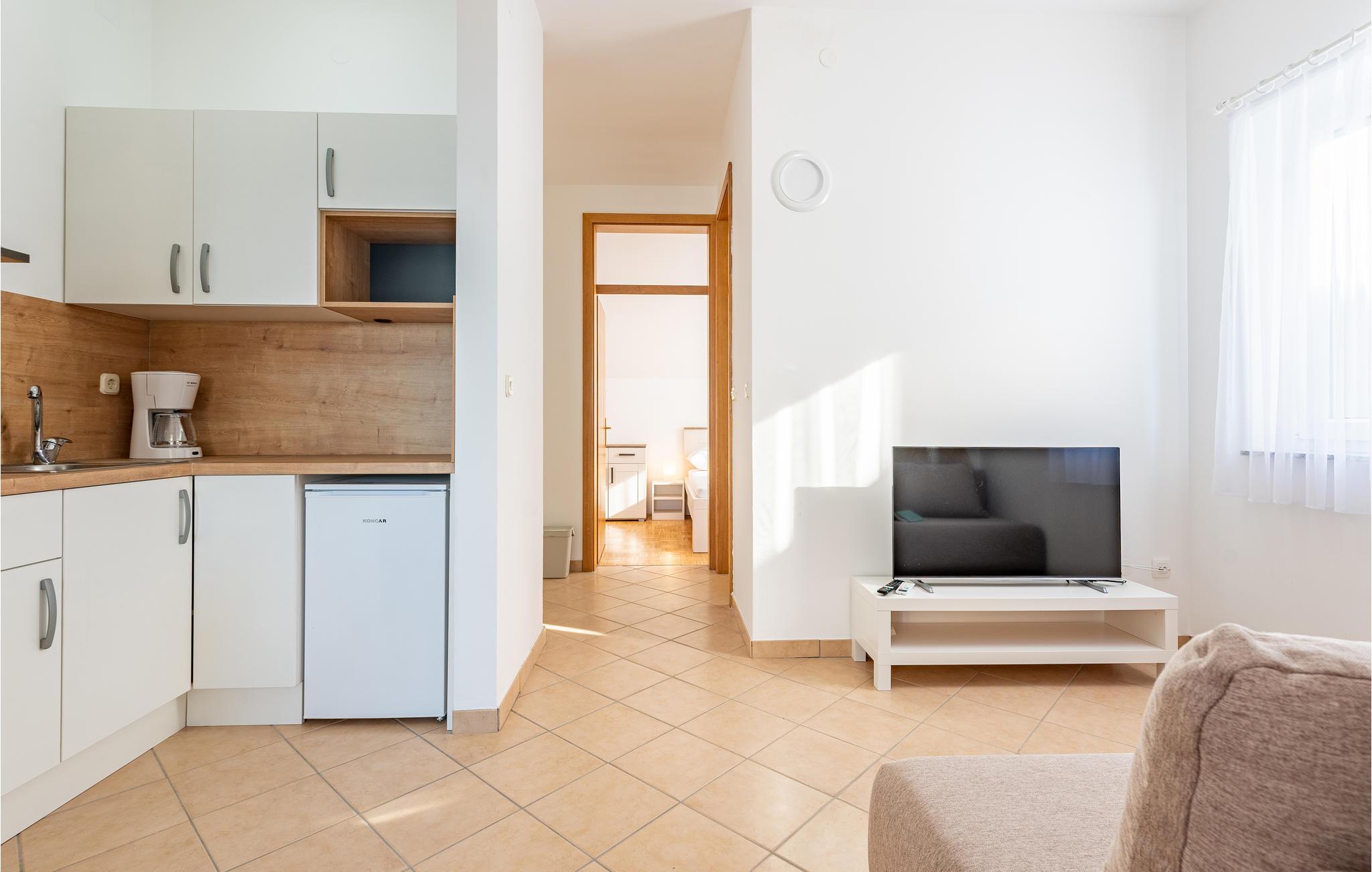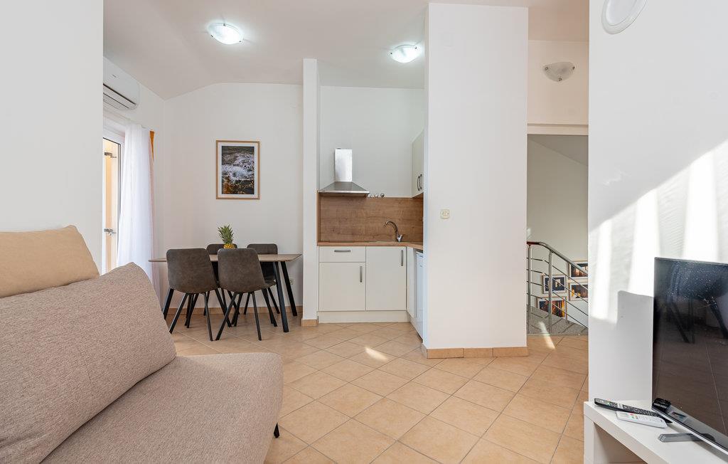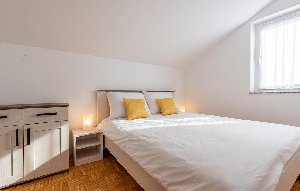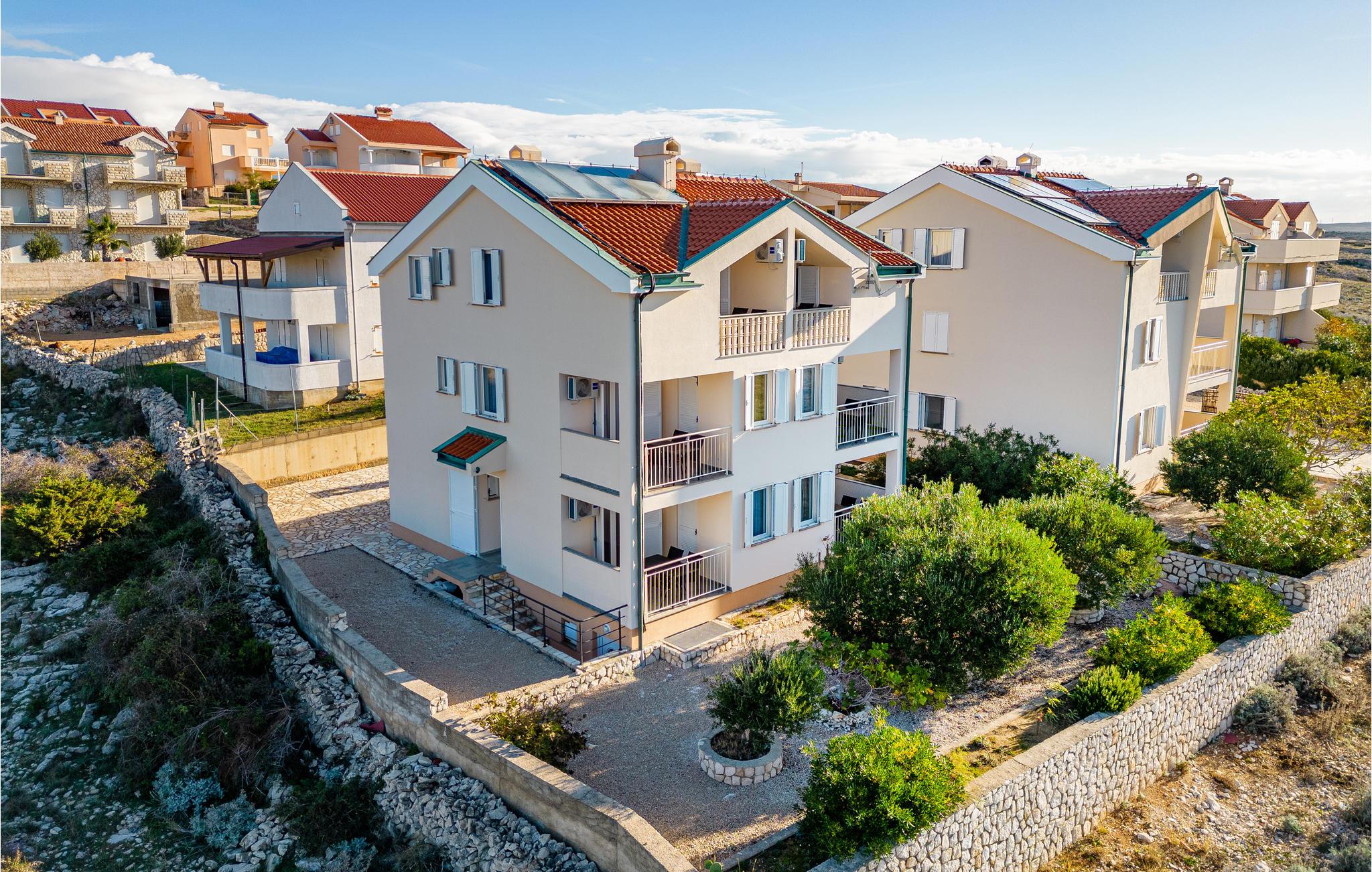 Denne skønne ferielejlighed er placeret i en moderne etageejendom. Her rykker I ind i en bolig, som emmer af stilfuld minimalisme og giver jer optimale rammer til at slappe af efter jeres ture rundt på øen Pag. I kan tilbringe aftenerne på den skyggefulde balkon og se de smukke solnedgange over havet. Her er der alt det, I skal bruge for at slappe af og have det rart, og I har desuden adgang til et fælles, lukket lokale, som I deler med husets øvrige gæster til socialt samvær og grillaftener.
