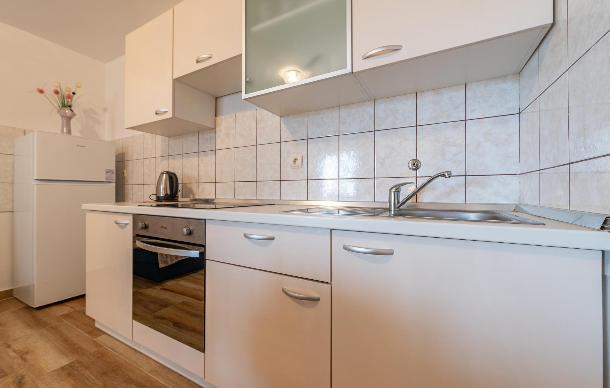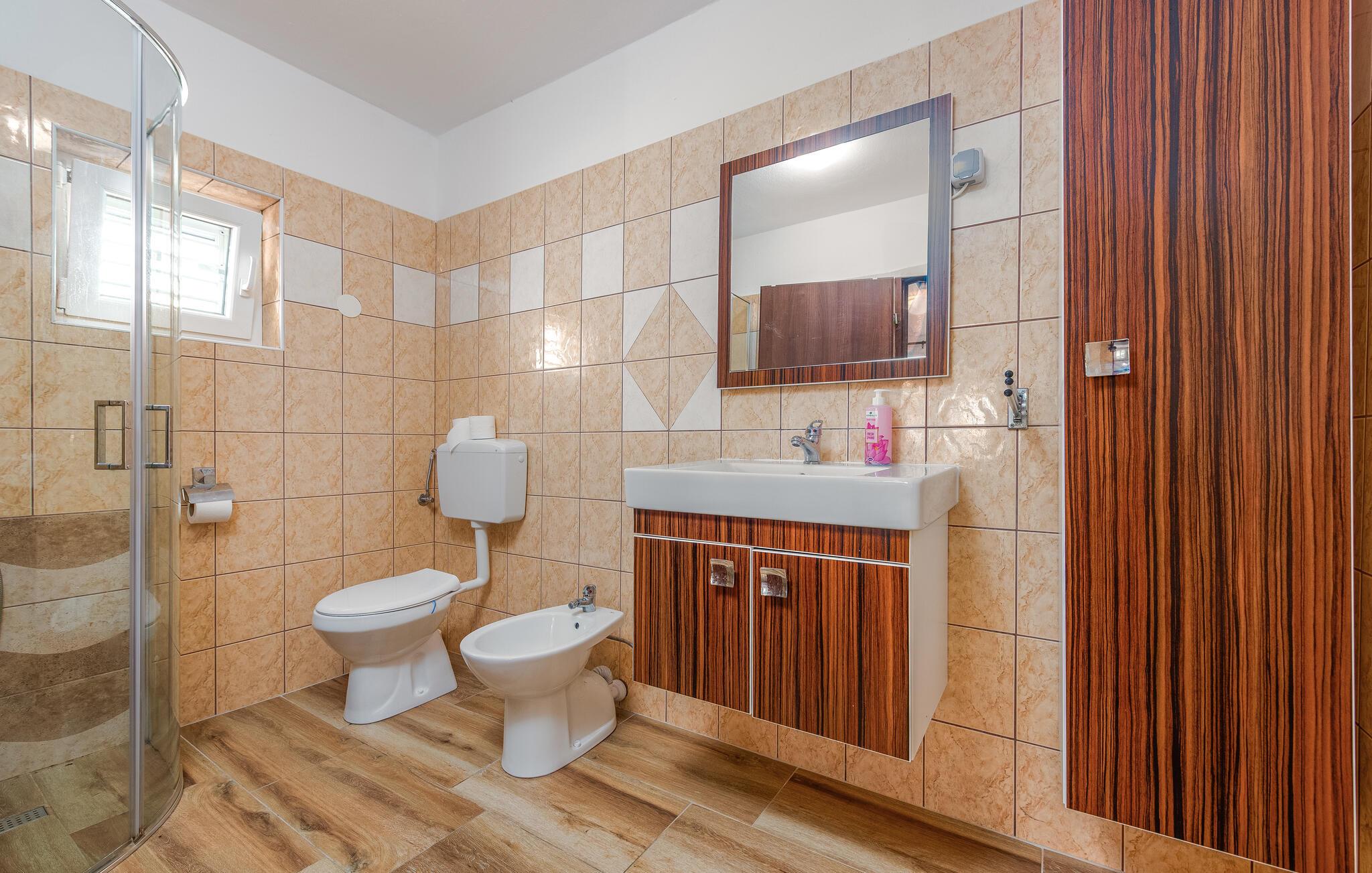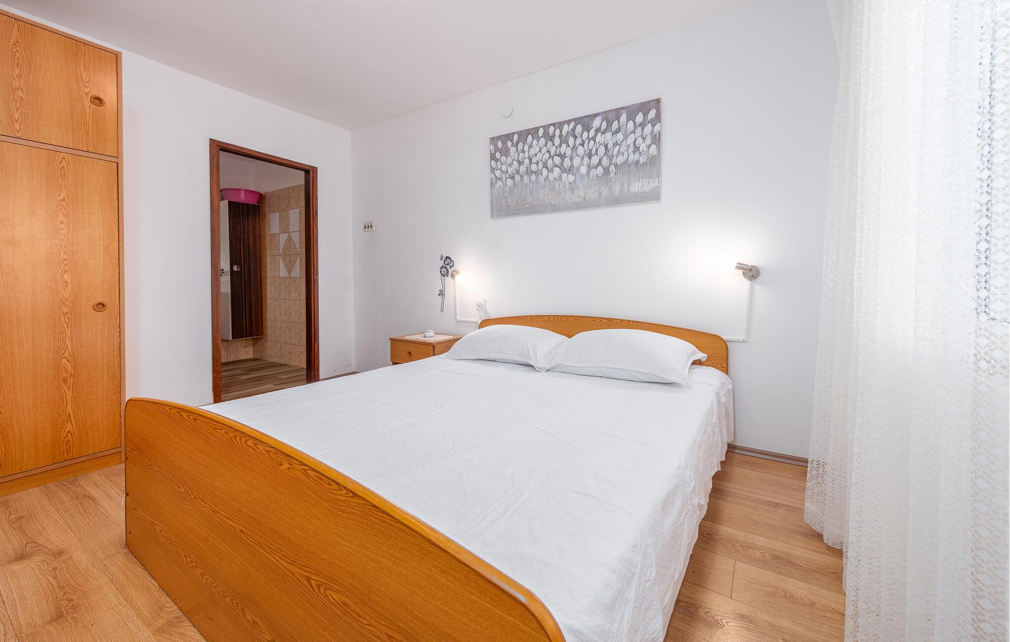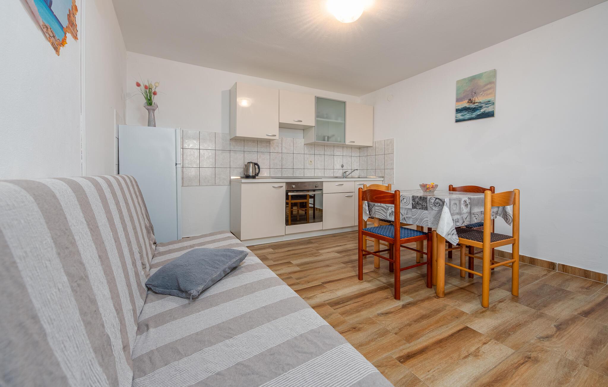 Dette smukke feriehus på øen Pag byder velkommen på en stor grund, i anden række fra vandet. Glæd dig til din ferie i Kustici og denne skønne lejlighed i et hus med flere ferielejligheder. Hvis du vil rejse med venner eller din udvidede familie, kan du bestille yderligere lejligheder. Lejlighederne i stueetagen og på første sal er veludstyrede og tilbyder dig alle de fornødenheder, du har brug for til din hvile. Føl dig hjemme i de lyse lokaler og indtag dine måltider på den overdækkede terrasse. Med havet i udsigt kan du gå til den nærliggende sten- og plateaustrand og hoppe i det azurblå vand og forfriske dig selv. Stedet Kustici, nordøst på øen Pag, er ideelt til en afslappende familieferie. Udforsk området, lej en båd og glæd dig til øens charmerende og varierede natur!