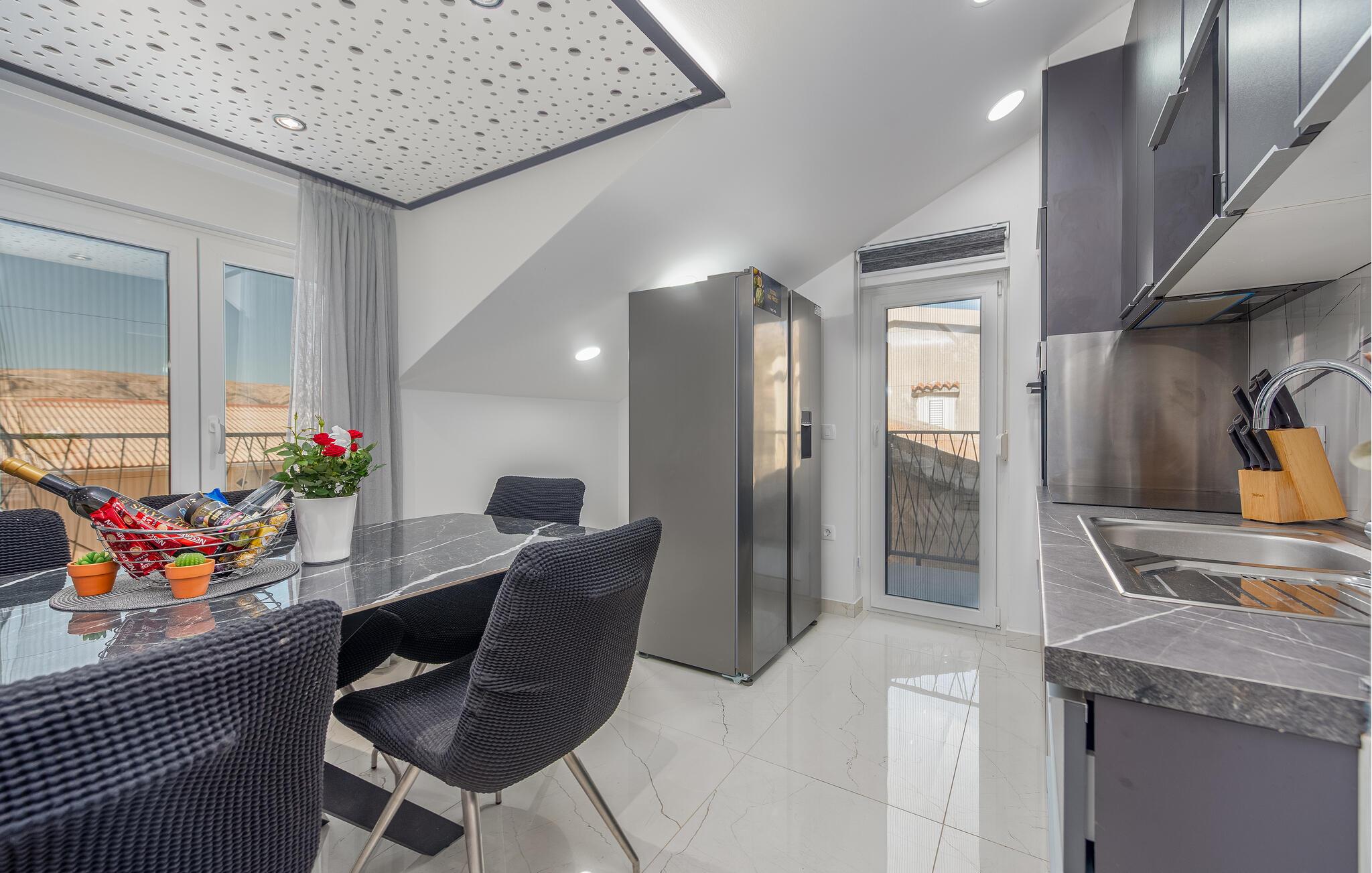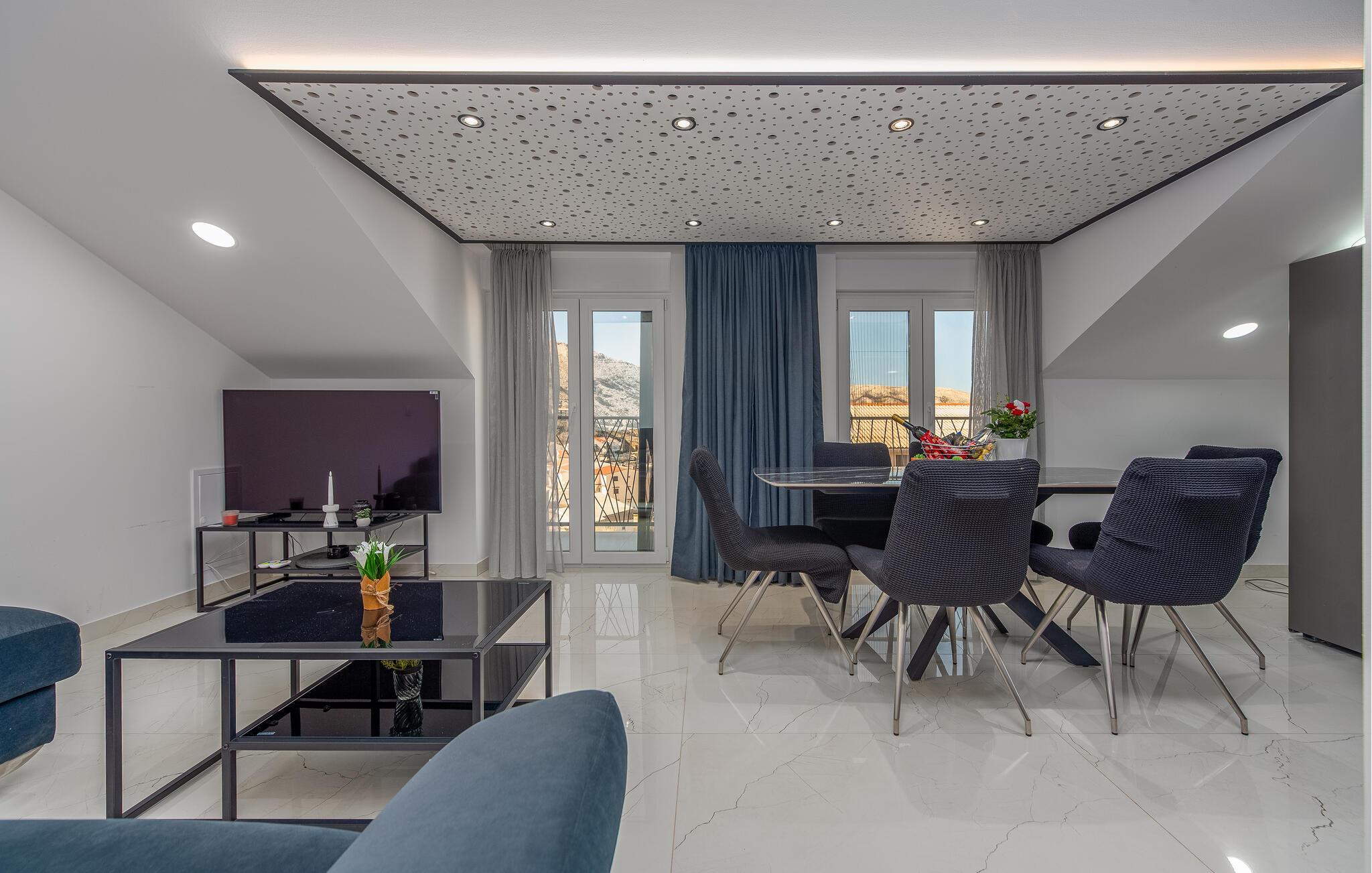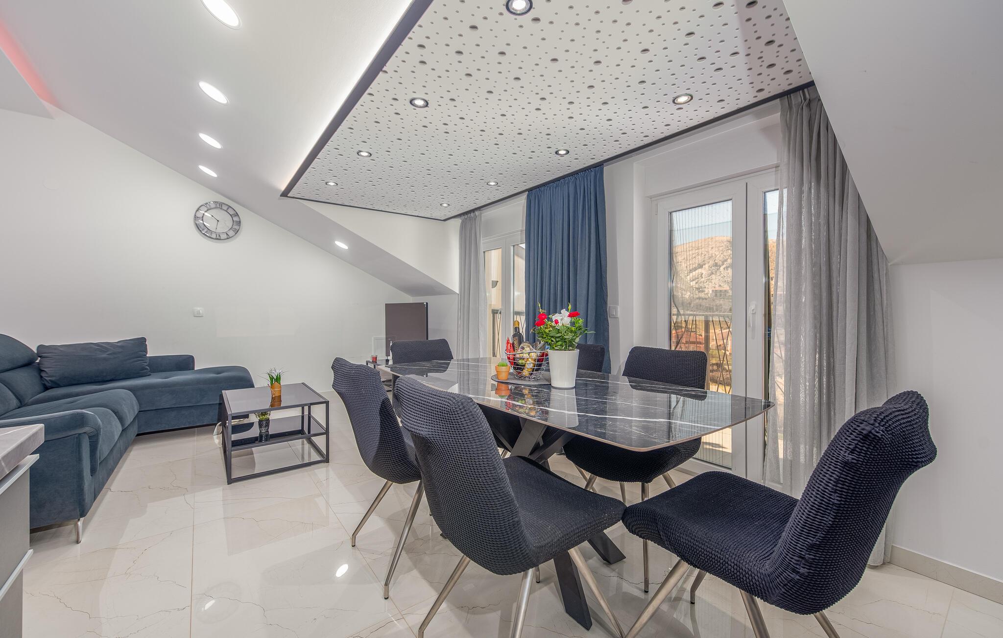 Denne komfortable ferielejlighed ligger nogle få skridt fra den smukke strand, hvor elegante møbler og hyggelig belysning skaber en indbydende, atmosfære. Brug det åbne køkken til at tilberede kroatiske retter sammen, nyd måltiderne ved det stilfulde spisebord, og efter en lang dag kan I slappe af i den rummelige sofa, hvor I kan streame en film eller have en spilleaften med familien.