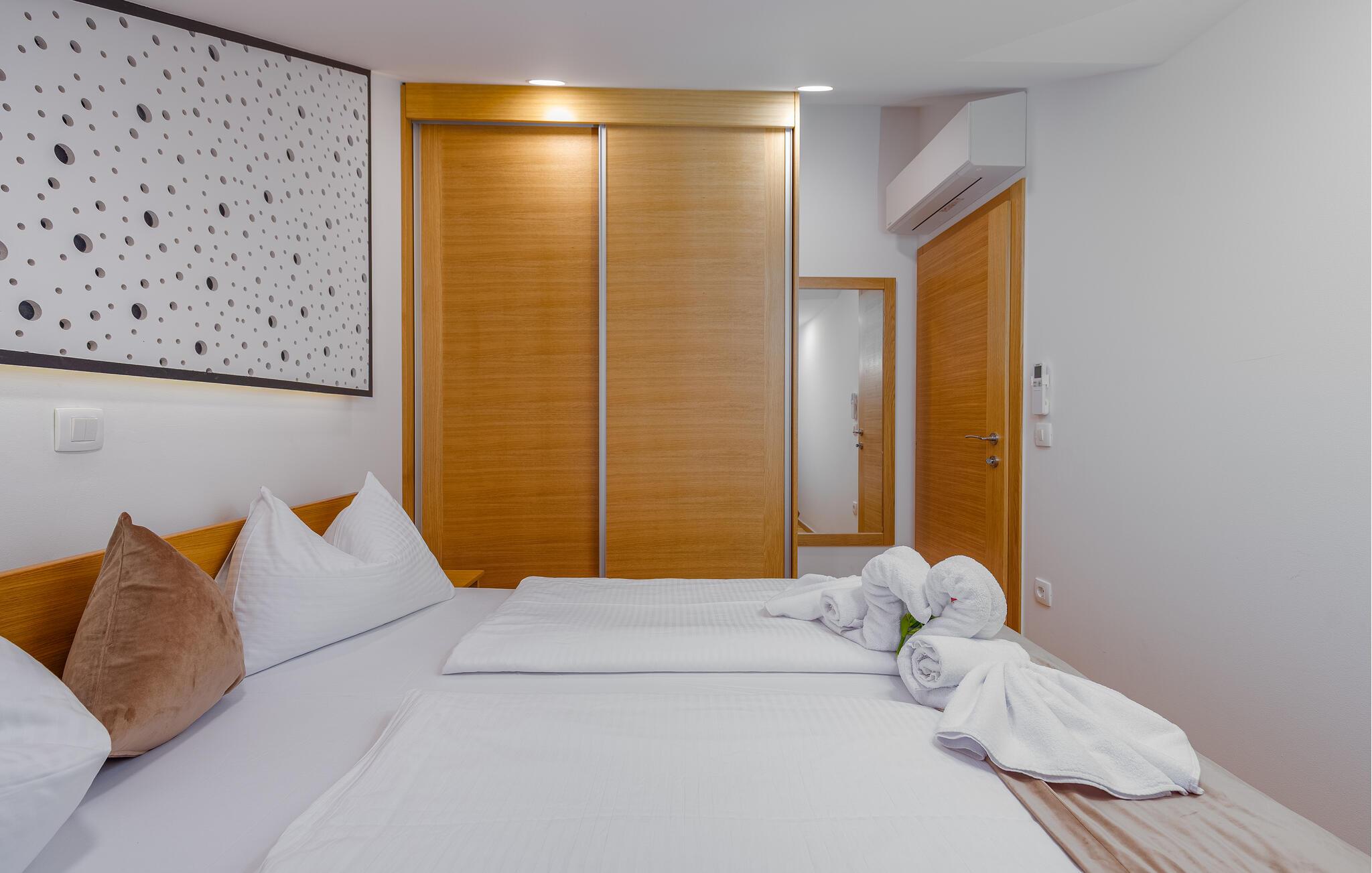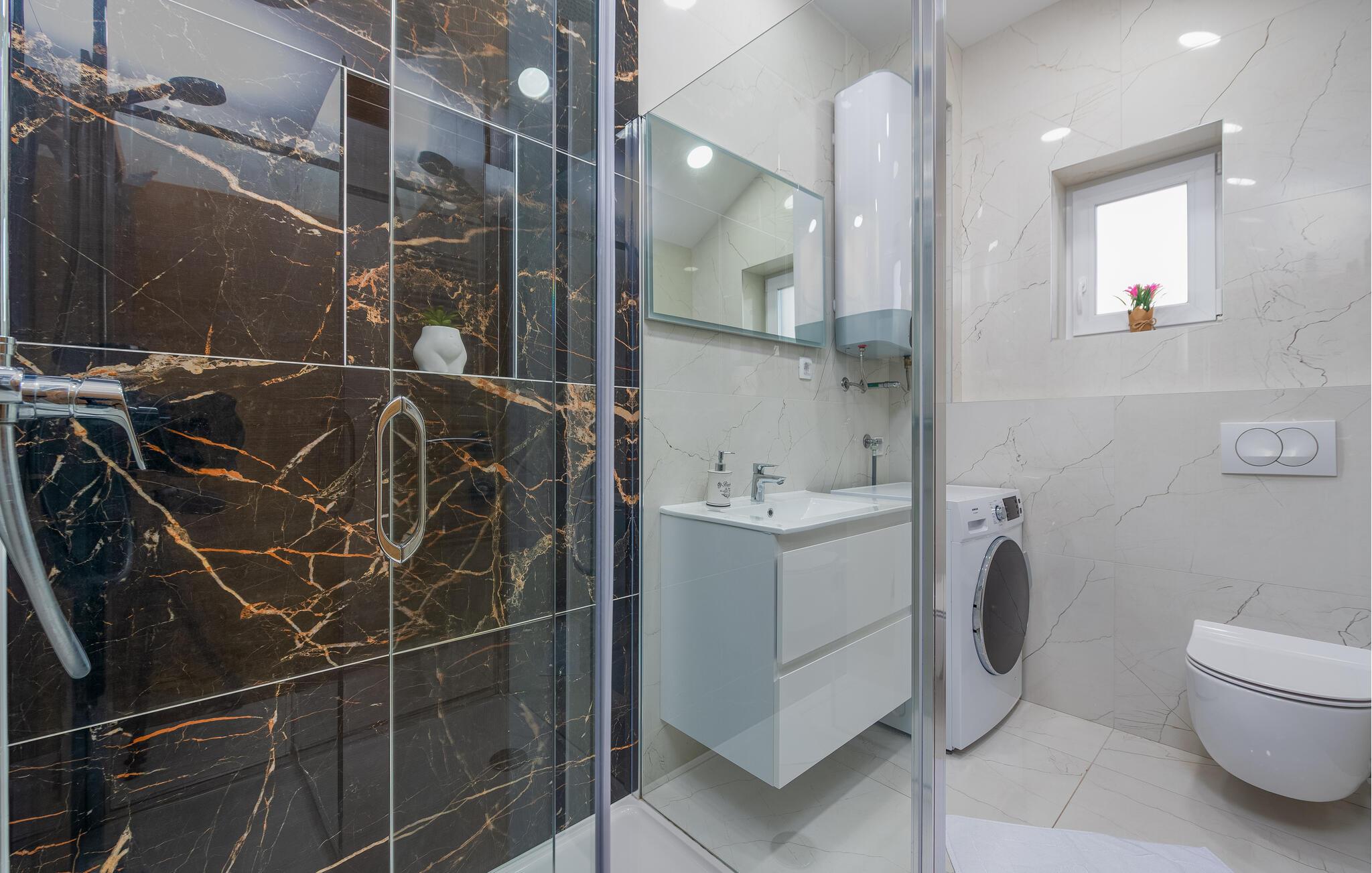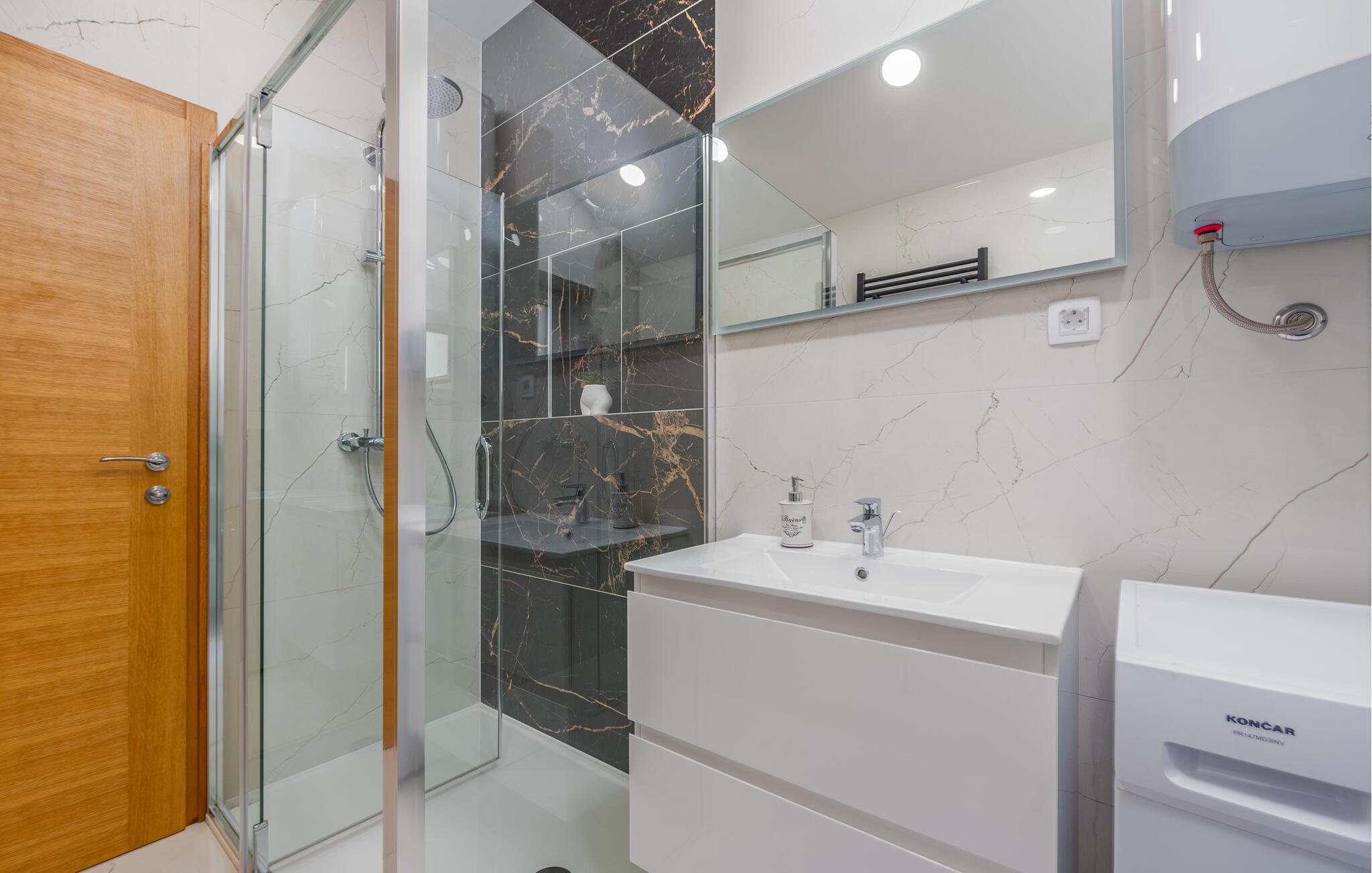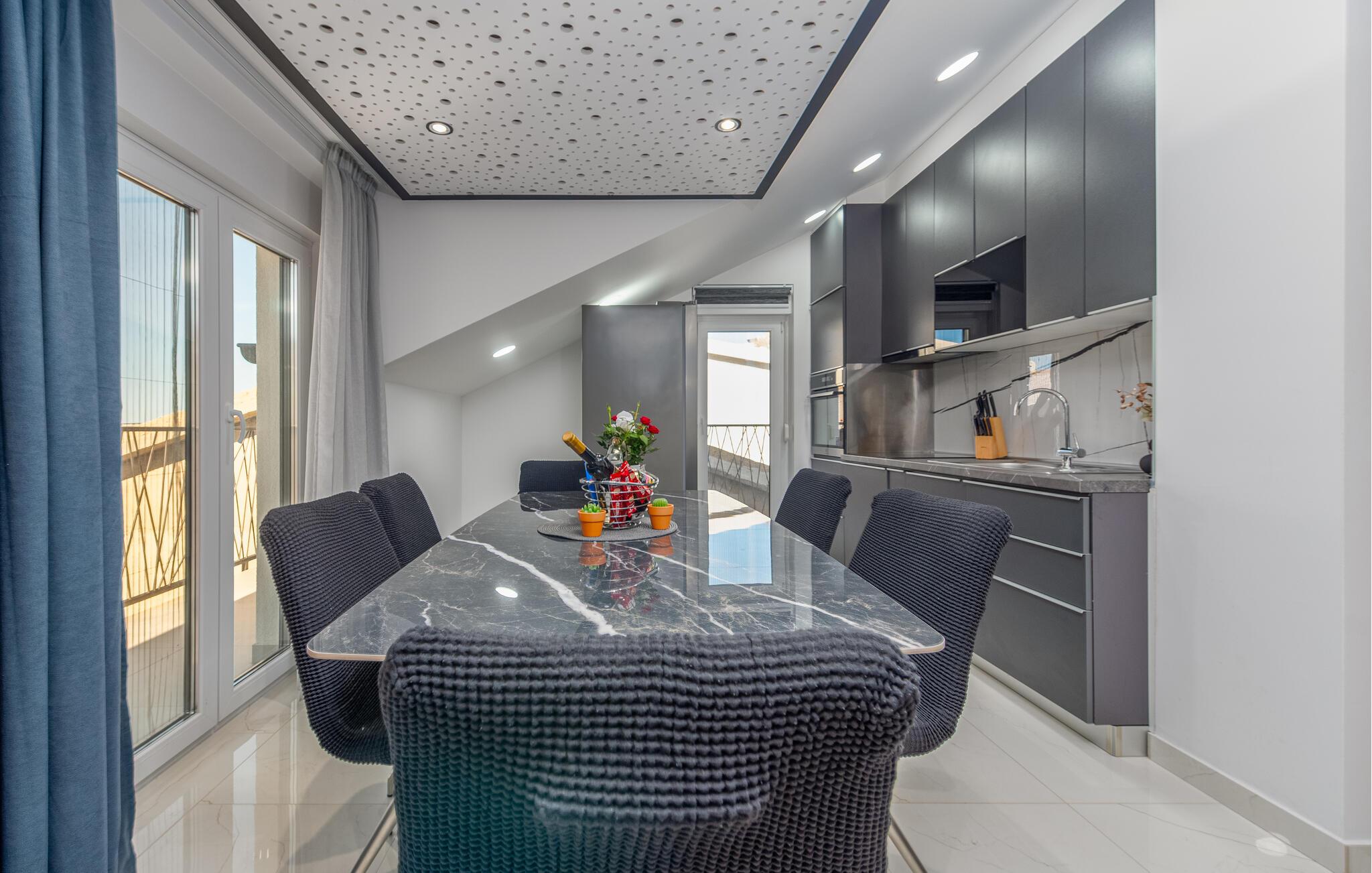 Denne komfortable ferielejlighed ligger nogle få skridt fra den smukke strand, hvor elegante møbler og hyggelig belysning skaber en indbydende, atmosfære. Brug det åbne køkken til at tilberede kroatiske retter sammen, nyd måltiderne ved det stilfulde spisebord, og efter en lang dag kan I slappe af i den rummelige sofa, hvor I kan streame en film eller have en spilleaften med familien.