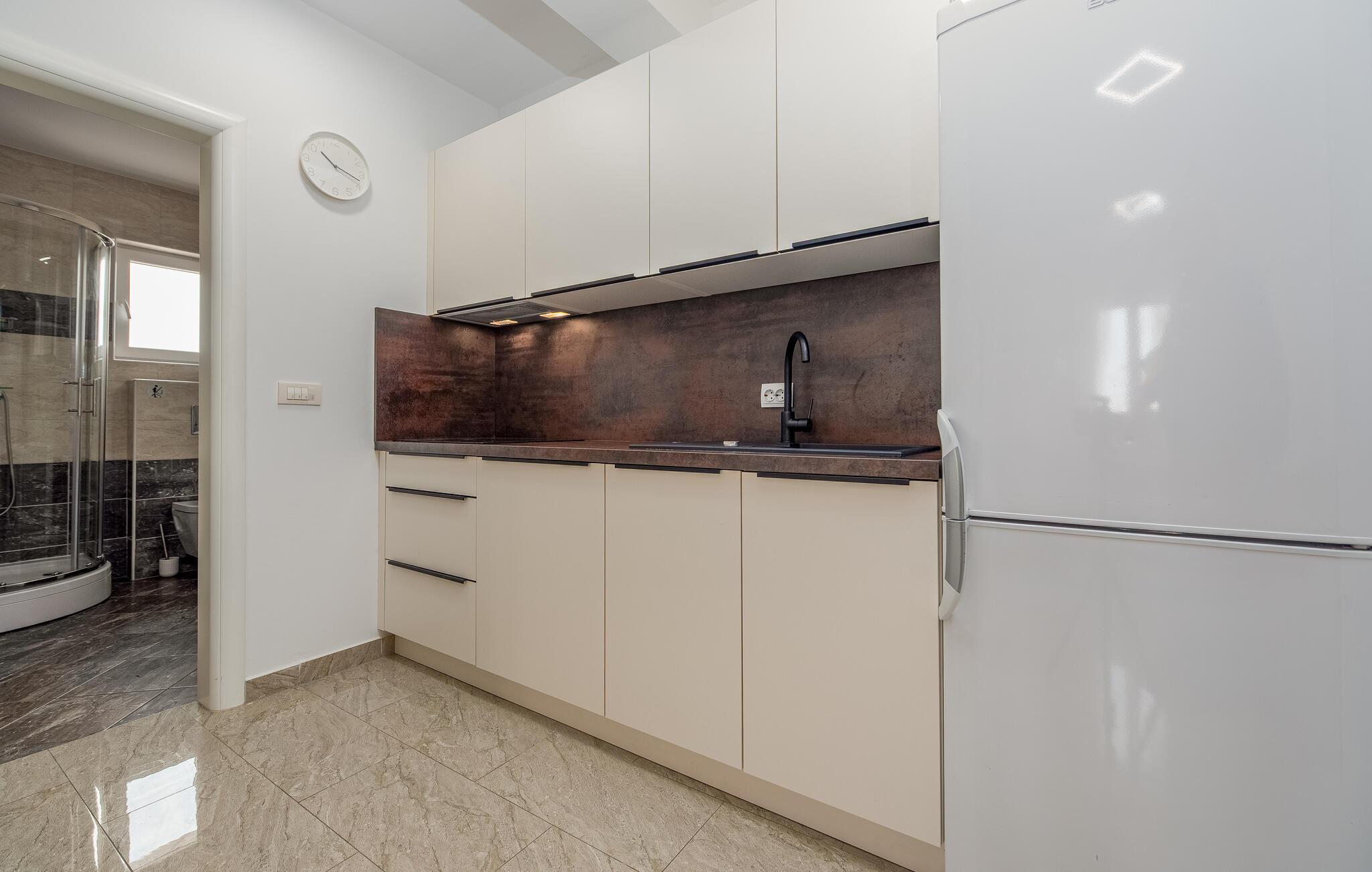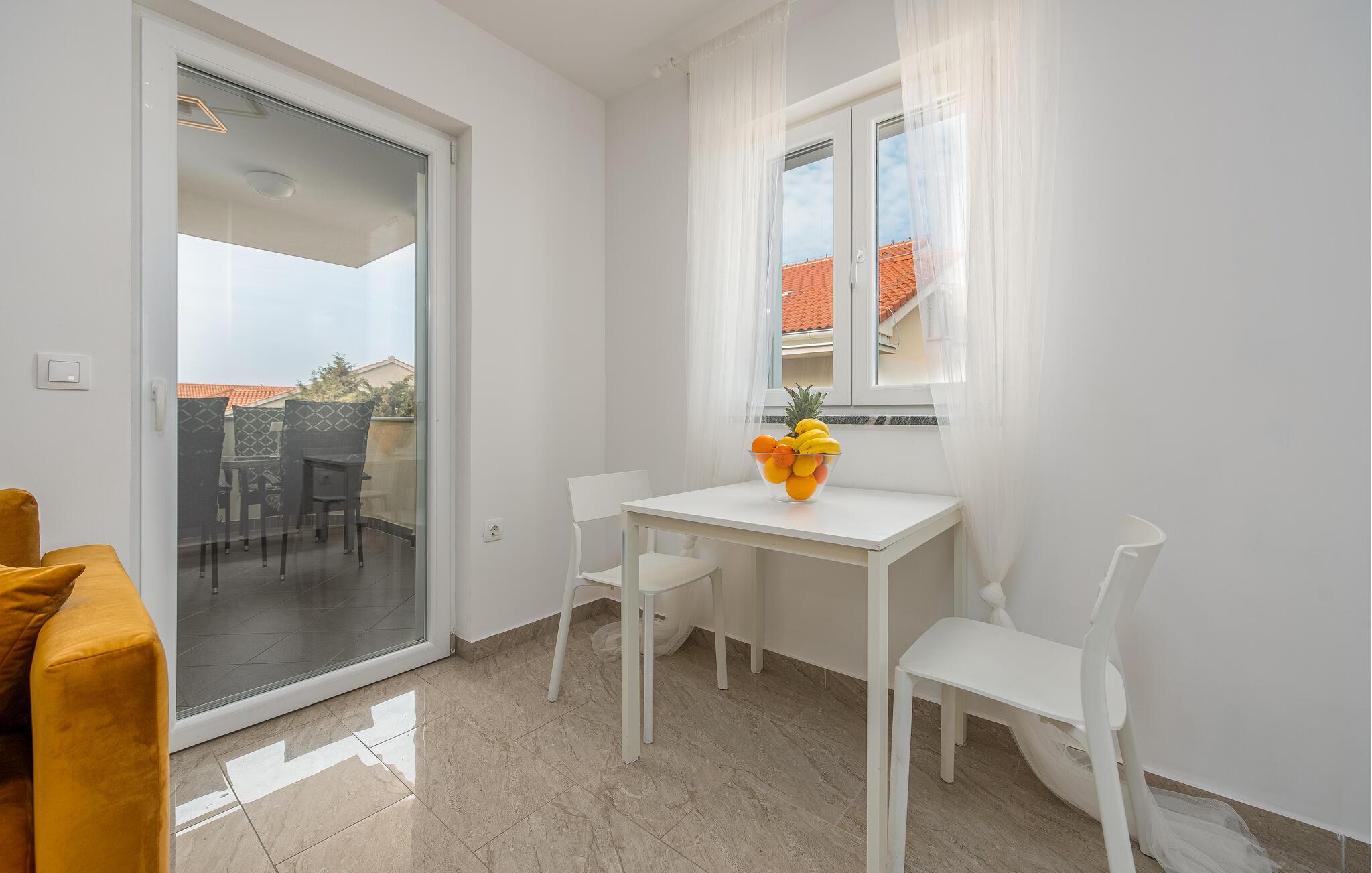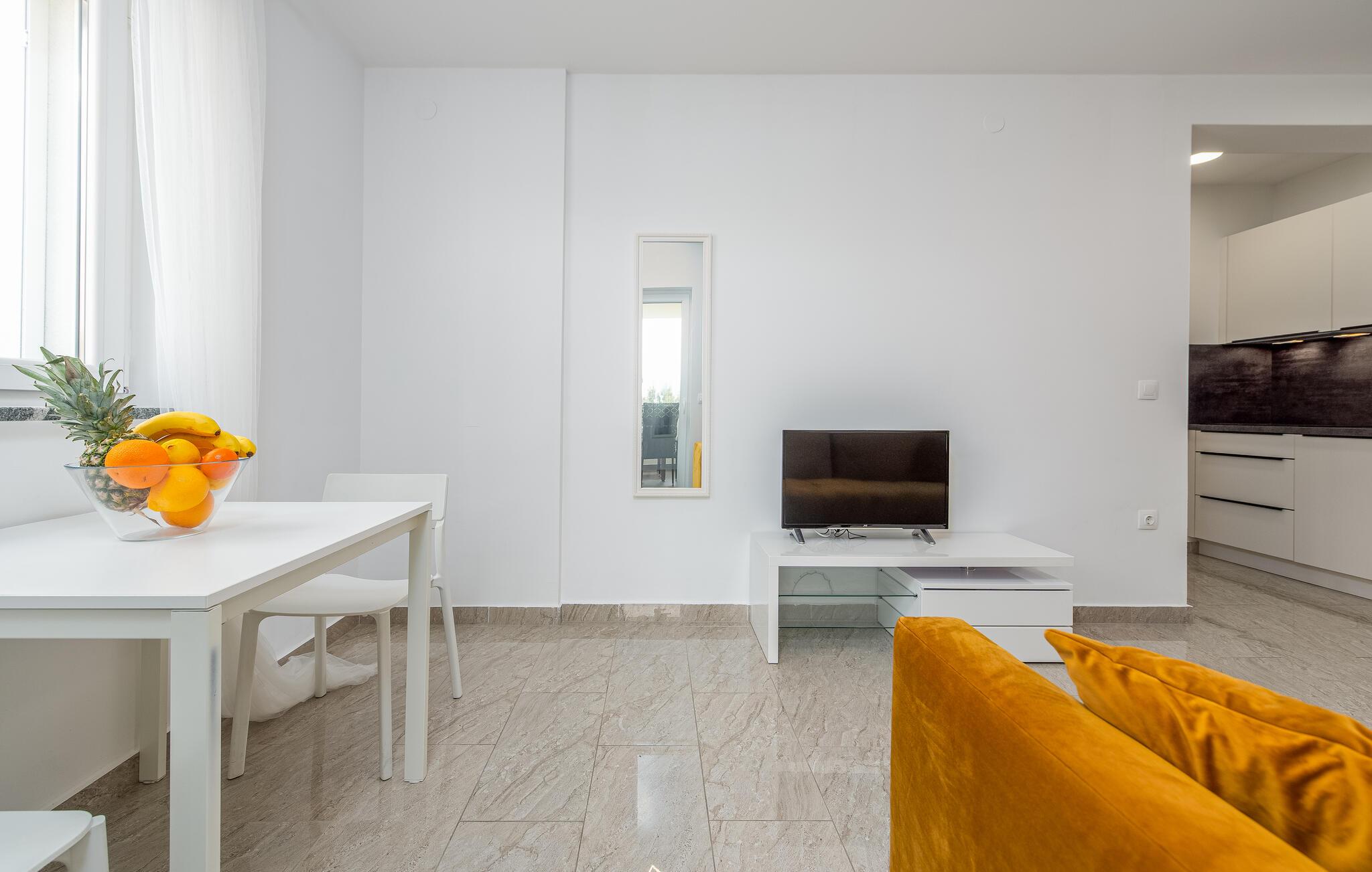 Denne lyse og velholdte ferielejlighed har smagfuld indretning og lover afslappende dage ved Adriaterhavskysten. Tilbered lokale specialiteter i det veludstyrede køkken og nyd dem ved det hyggelige spisebord. Find jer godt til rette i den stilrene sofa, slap af med en film eller fordyb jer i en bog, som I ikke finder tid til i jeres hverdag.
