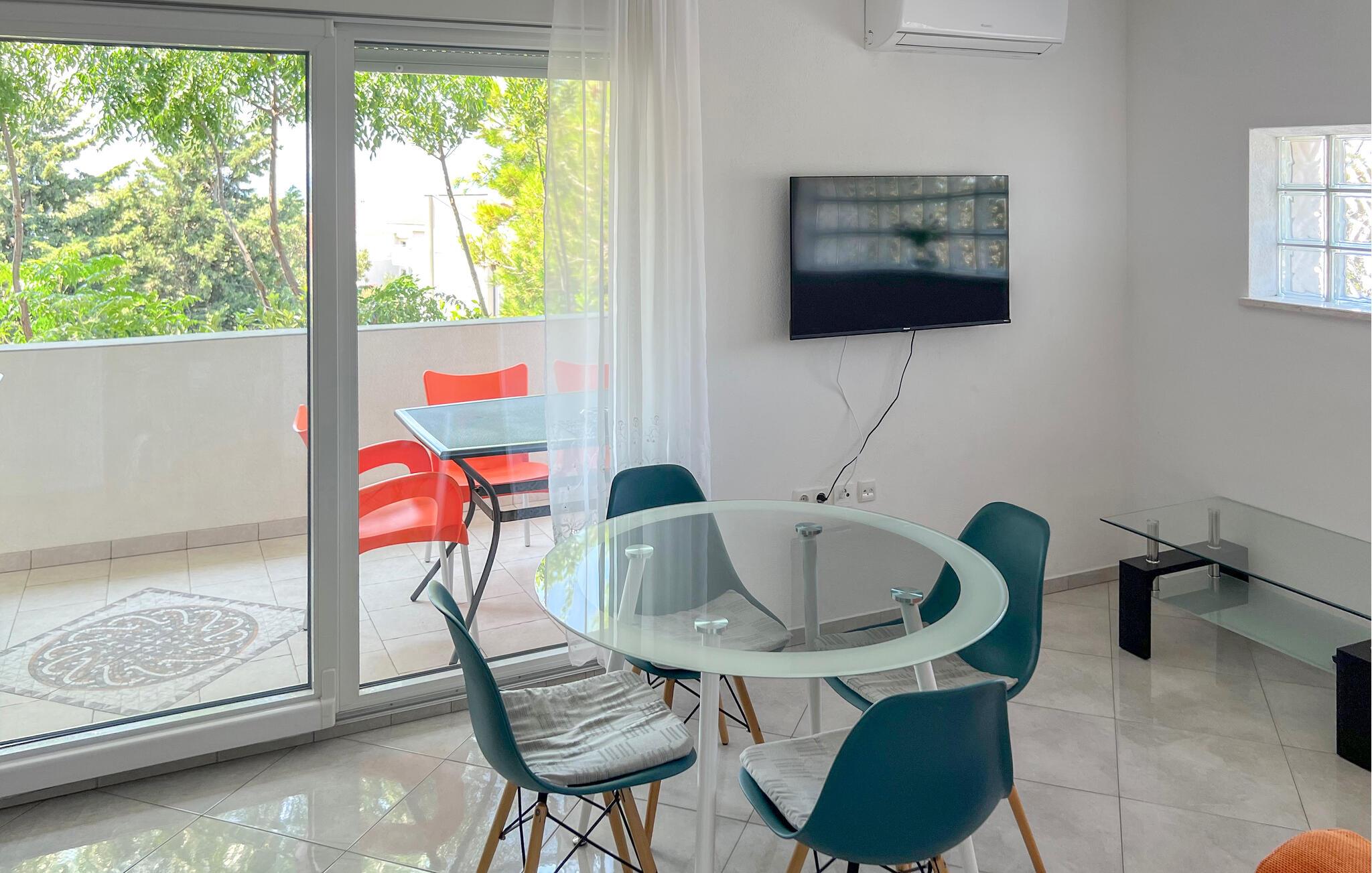 Med sine frodige grønne rammer tilbyder denne lejlighed en skøn, lys oase, hvor hele familien perfekt kan kombinere en strandferie med spændende udflugter. Læg hverdagen bag jer, planlæg jeres aktiviteter over afslappende måltider, og efter en lang dag kan I slappe af med en spændende serie eller hygge jer med en sjov spilleaften.