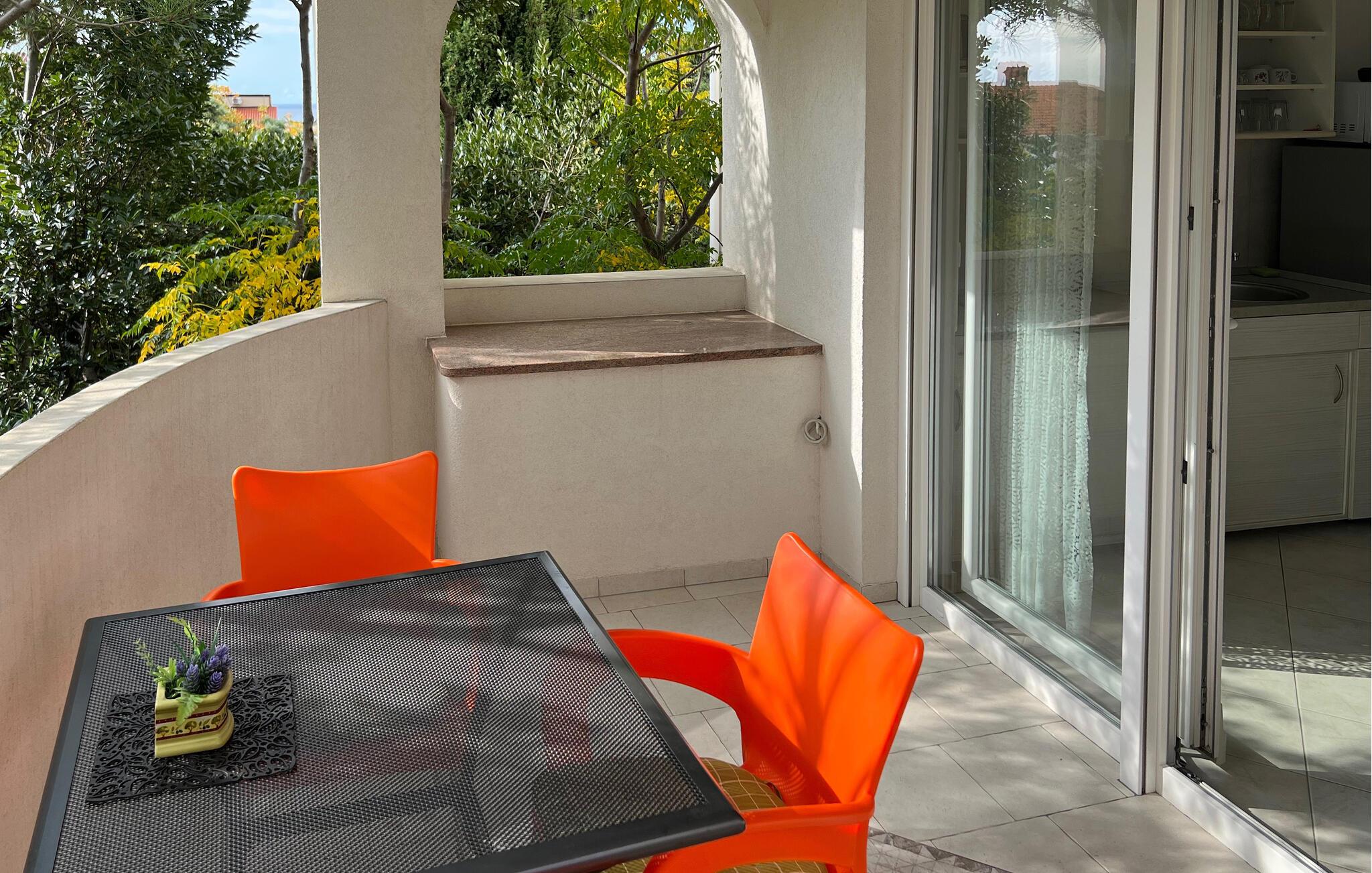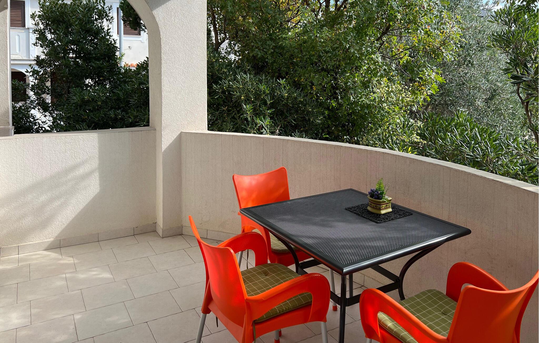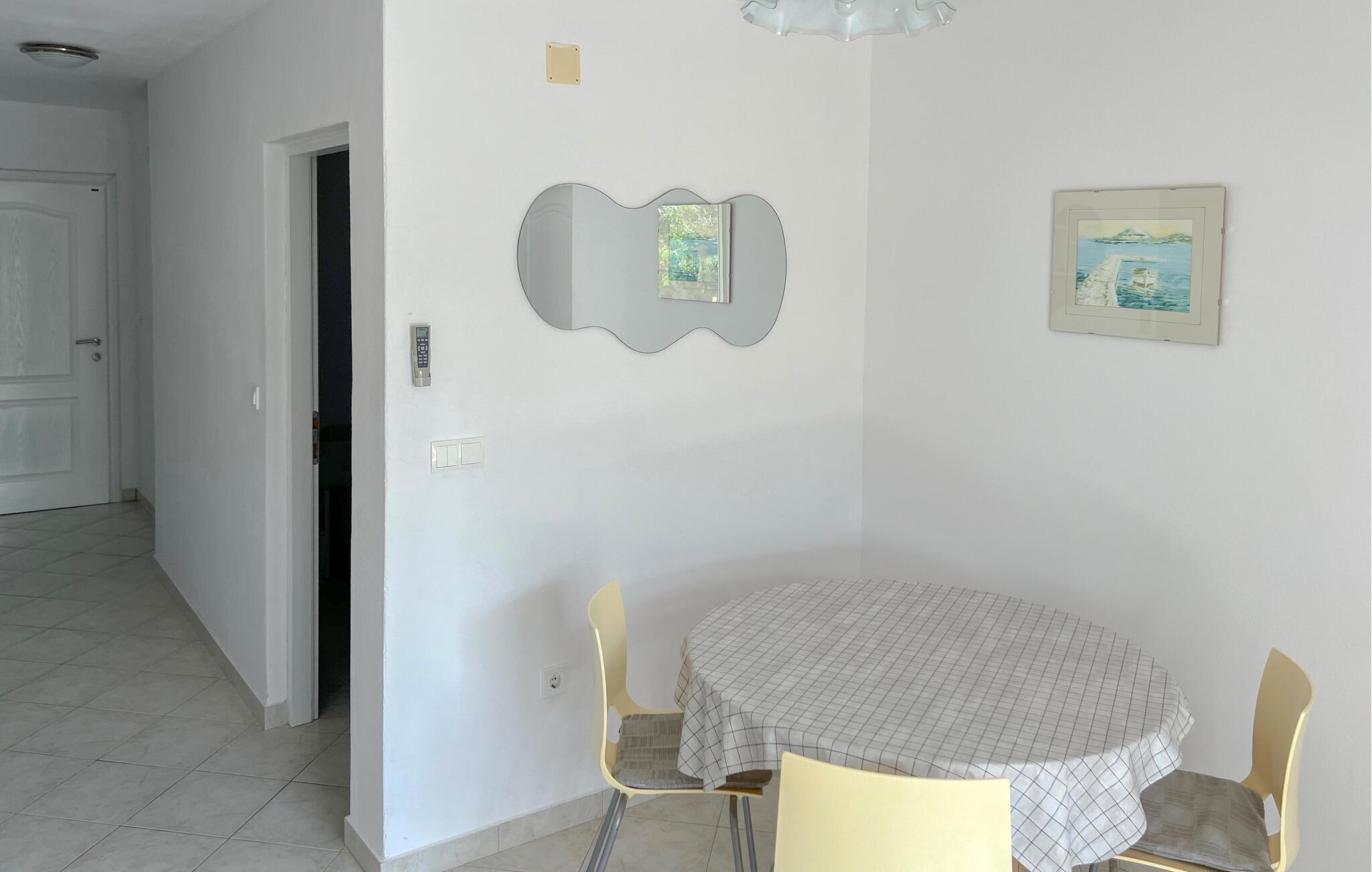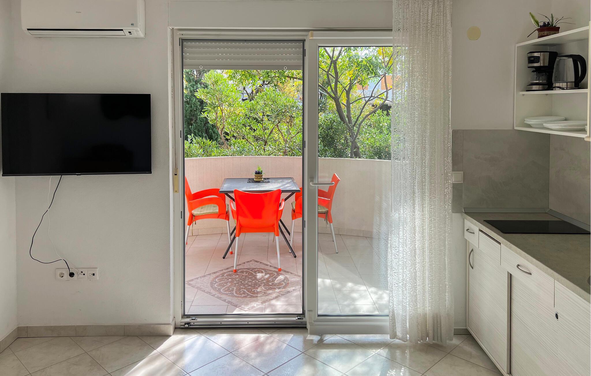 Med sine frodige grønne rammer tilbyder denne lejlighed et lyst og komfortabelt tilflugtssted, hvor I perfekt kan kombinere en strandferie med spændende udflugter med venner eller familie. Læg hverdagen bag jer, planlæg jeres aktiviteter over afslappende måltider, og efter en lang dag kan I slappe af med en spændende serie eller nyde en sjov spilleaften.