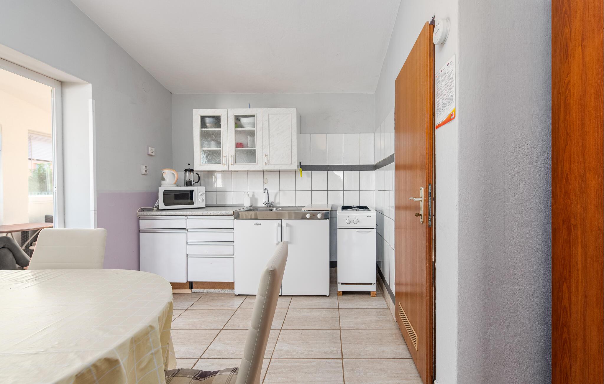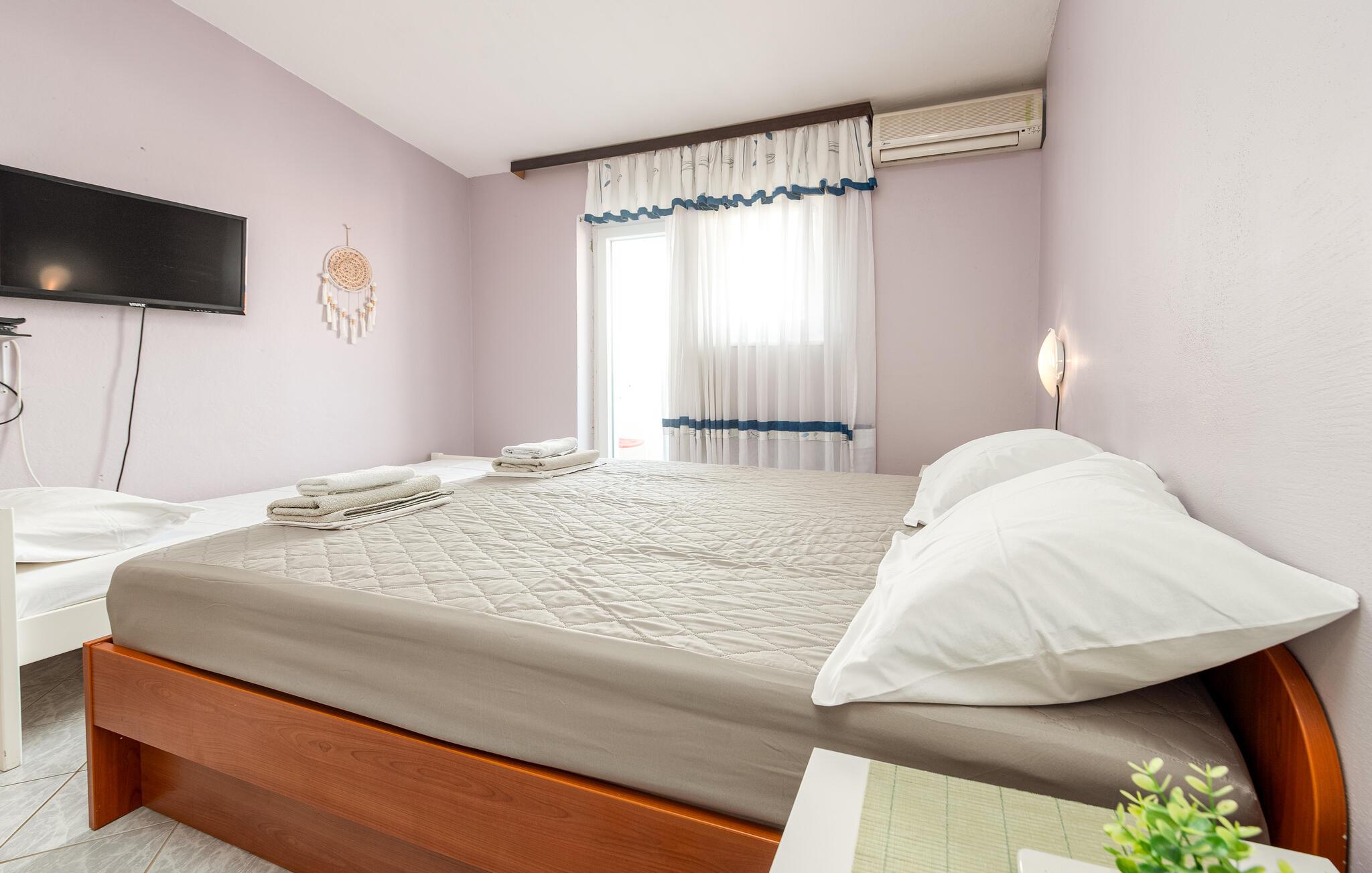 En ferie for tre, lige ved vandet, venter jer i denne lille, men hyggelige ferielejlighed. Nyd en afslappende pause fra hverdagen i de lyse og velholdte omgivelser. Tilbered jeres måltider eller en picnic til stranden i det venlige køkken, og planlæg jeres udflugter i det solbeskinnede opholdsområde.