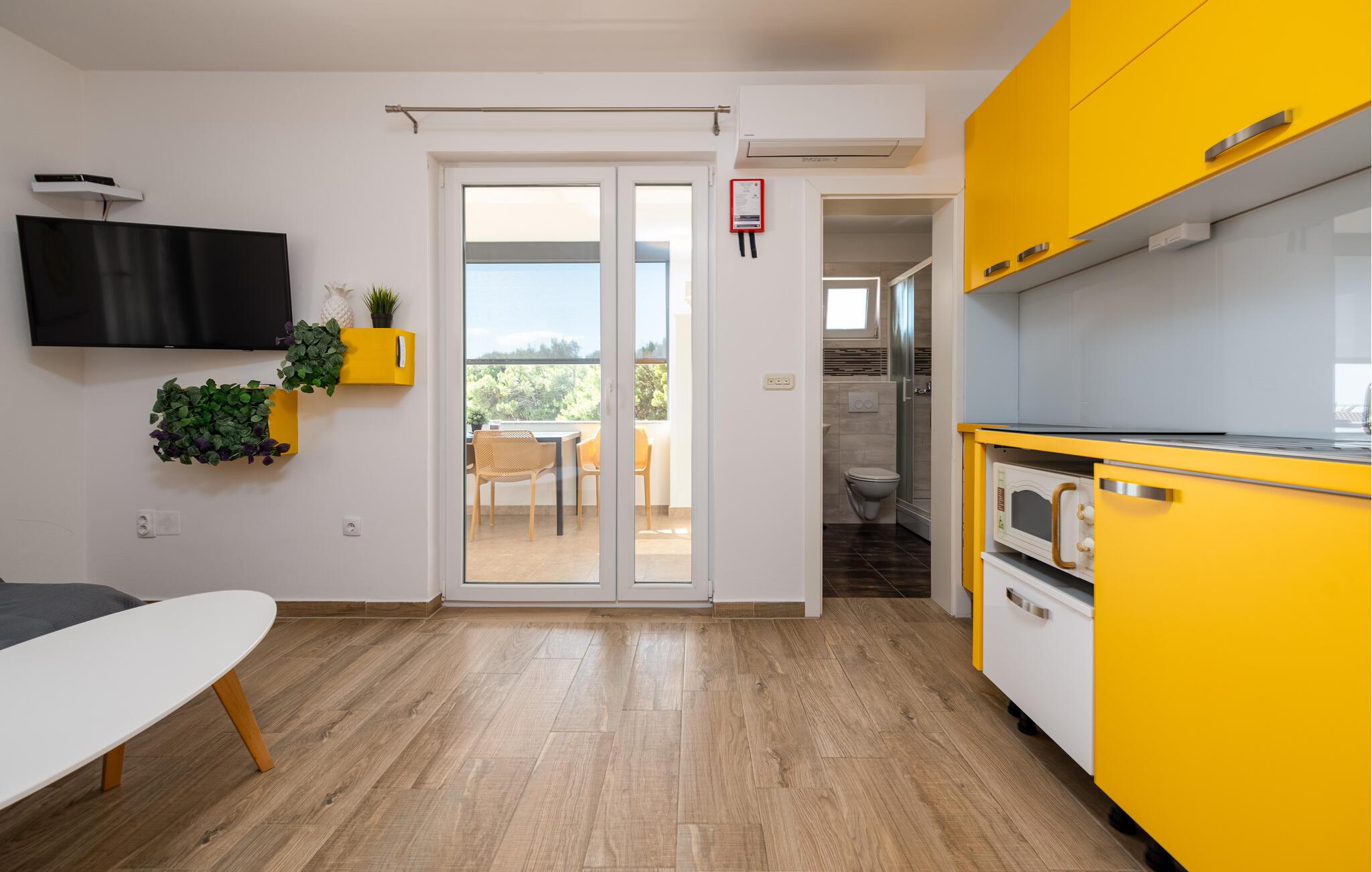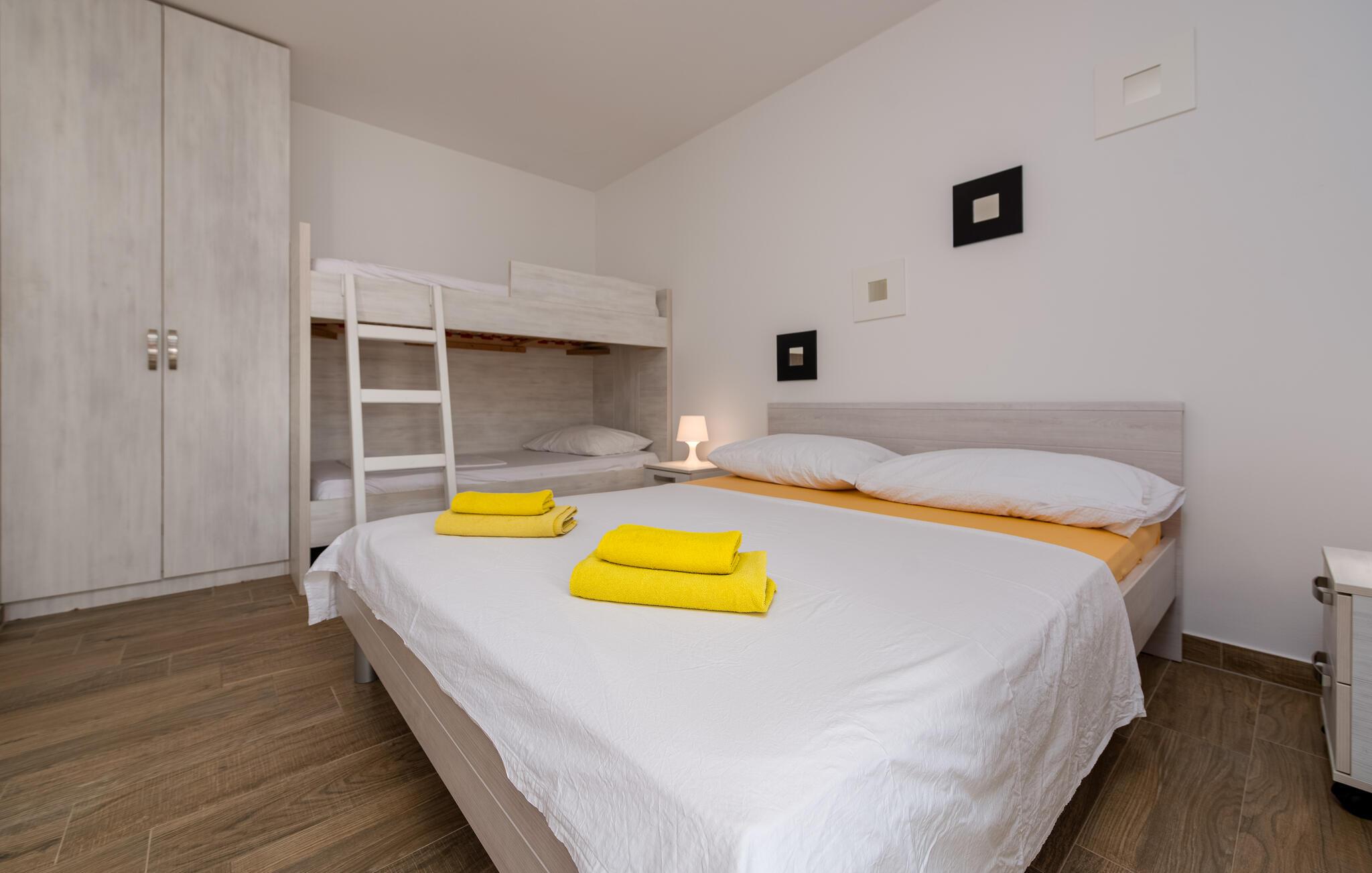 Denne moderne ferielejlighed byder jer velkommen med en venlig og indbydende indretning, der skaber de perfekte rammer for afslappende feriedage. Nyd den åbne opholdsstue, hvor I kan lave mad sammen eller slappe af med en film på den hyggelige sofa.