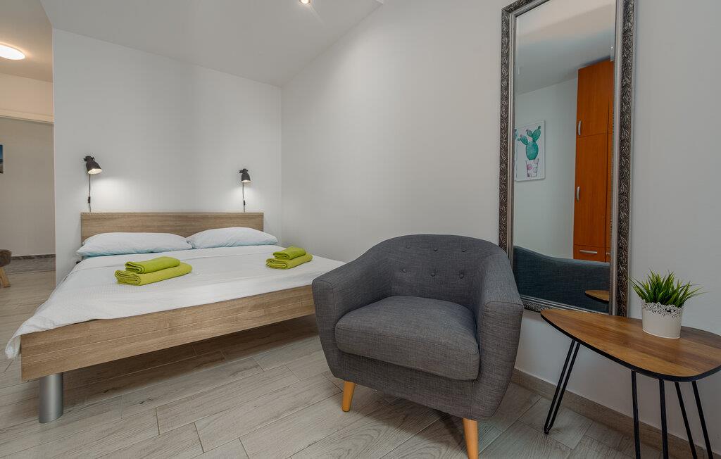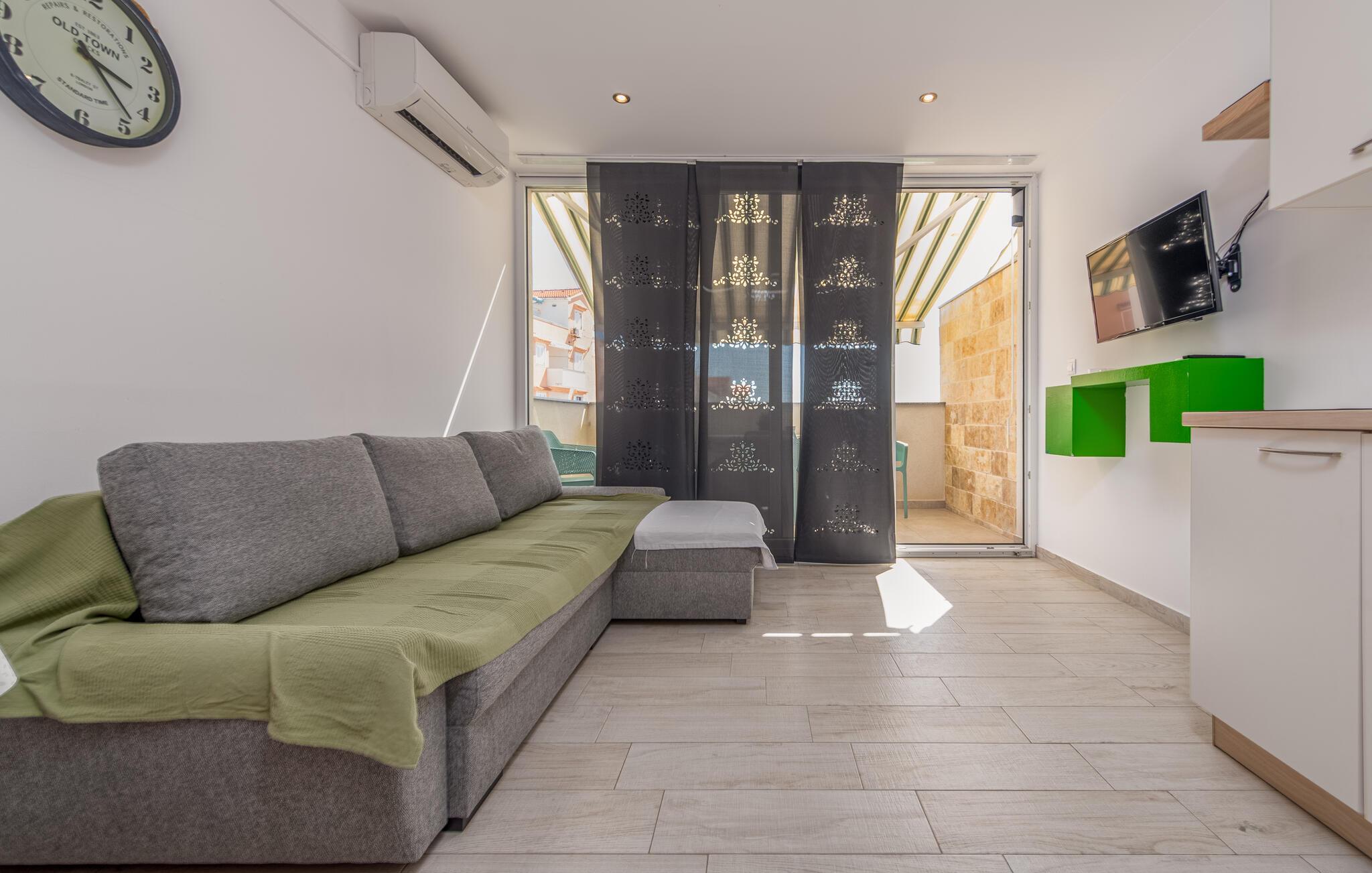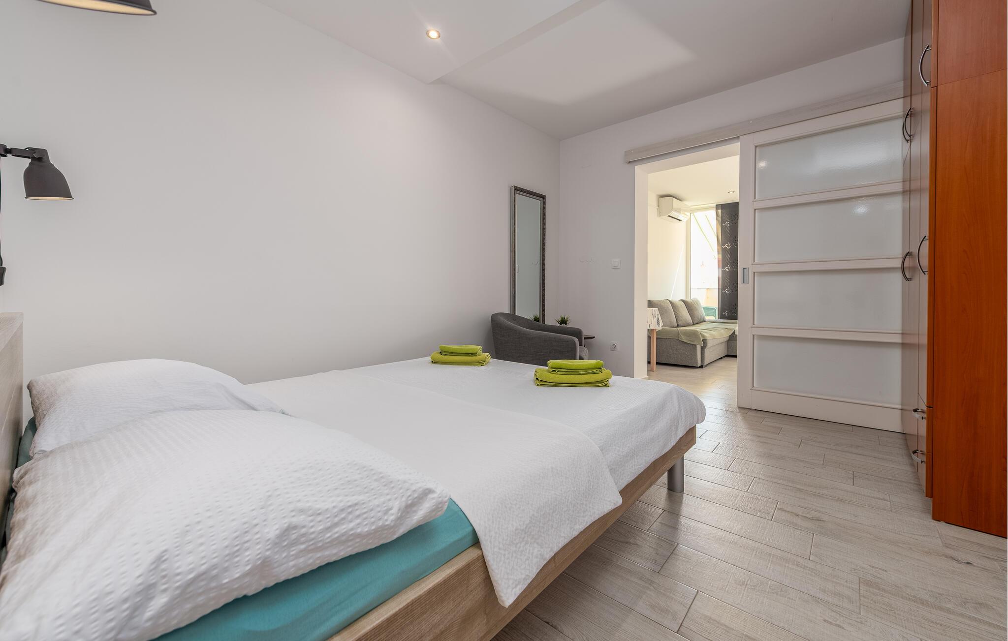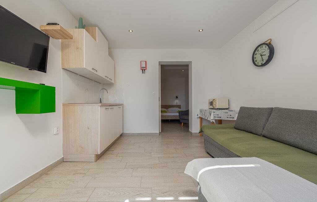 Denne moderne ferielejlighed byder jer velkommen med en minimalistisk og indbydende indretning, der skaber de perfekte rammer for afslappende feriedage. Nyd den åbne opholdsstue, hvor I kan lave mad sammen eller slappe af med en film på den komfortable sofa.