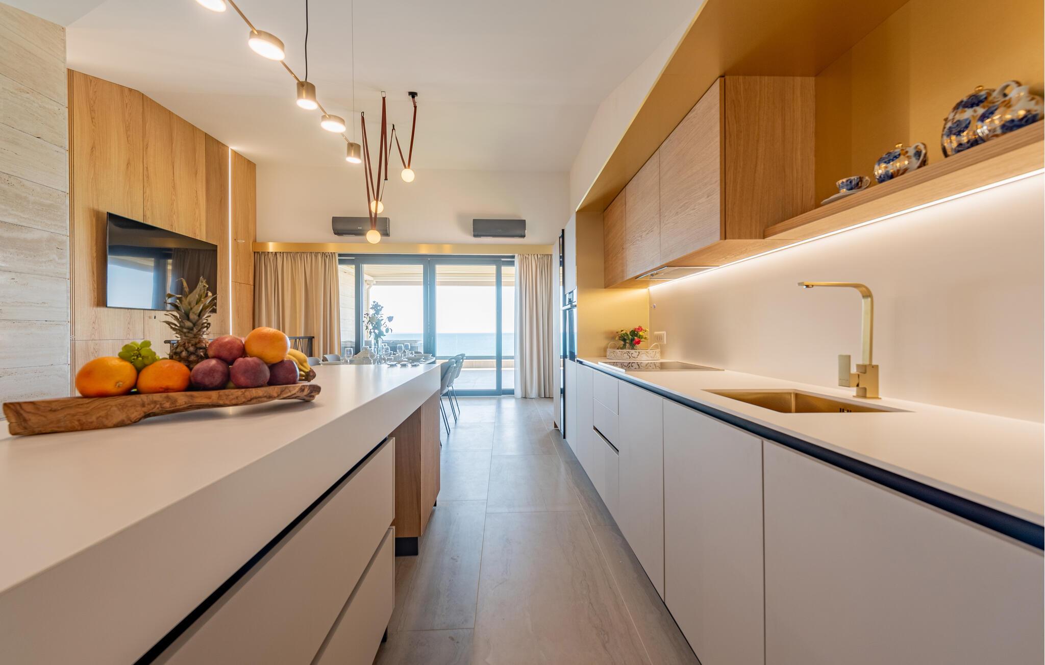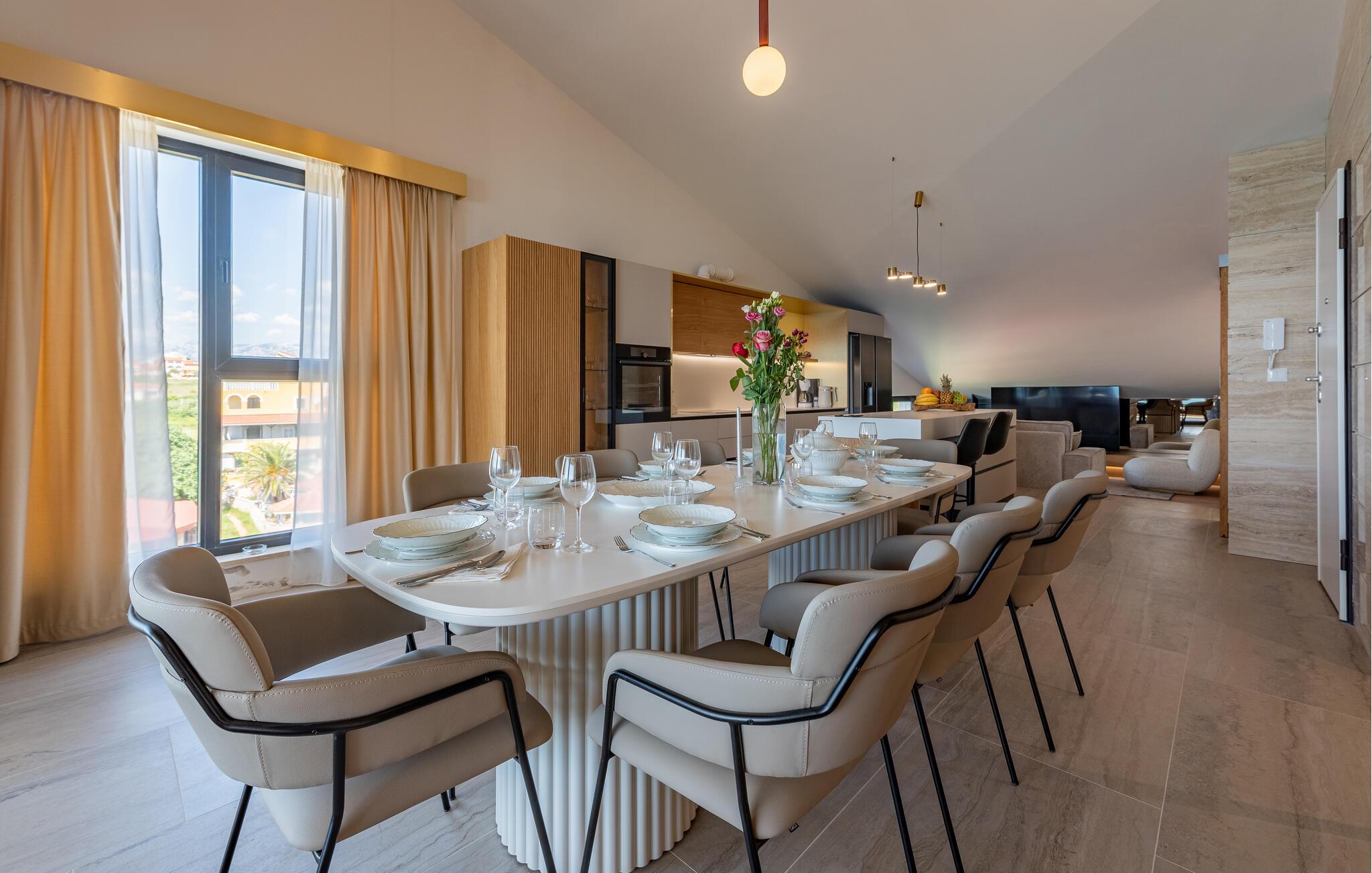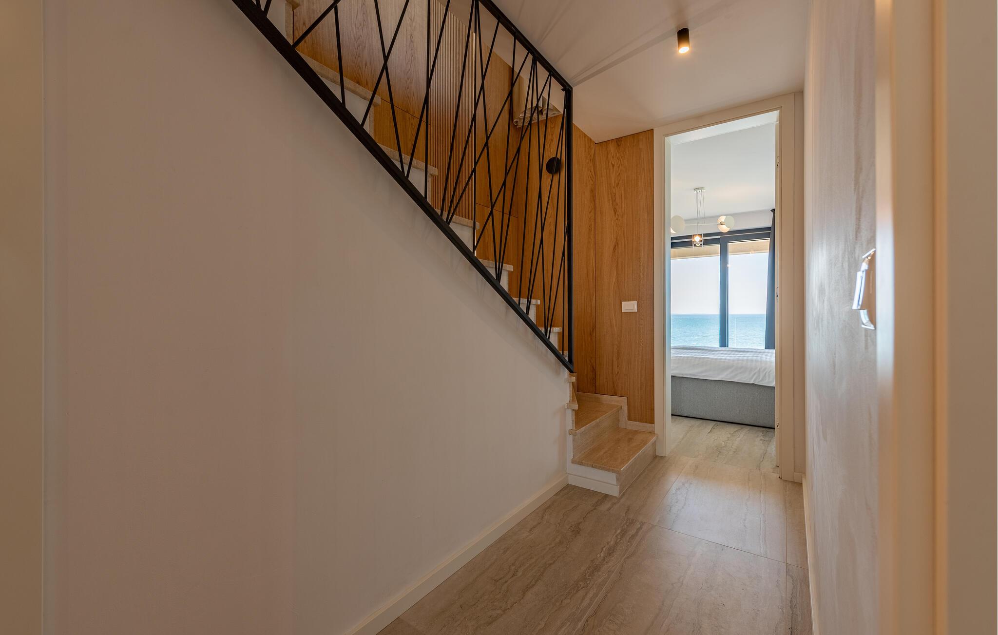 Hvis I er på udkig efter en endog meget komfortabel bolig til årets familieferie, og vil I gerne bo lige ved stranden, er denne vidunderlige toetagers lejlighed det helt rette valg for jer. Udsigten over vandet er helt igennem fremragende og kan nydes fra de to terrasser, når vejret er lækkert, som det jo tit er her. Indretningen emmer af kvalitet over hele linjen; materialerne af høj kvalitet, møblerne komfortable og køkkenet fuldt udstyret, så I kan tage jer god tid til at kræse om livretterne efter en herlig feriedag. Hvis I skal gøre det lidt ekstra godt for jer selv, kan I sætte jer godt til rette i spabadet med en god drink og nyde farvernes forunderlige spil på himlen ved solnedgang.