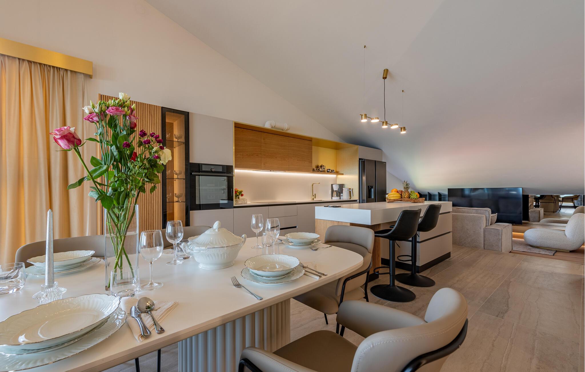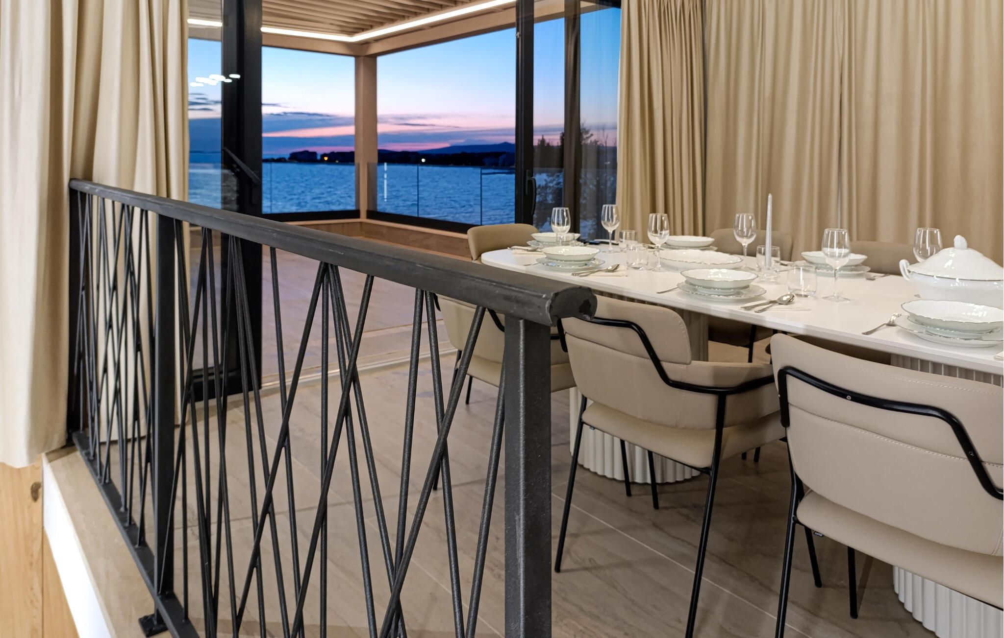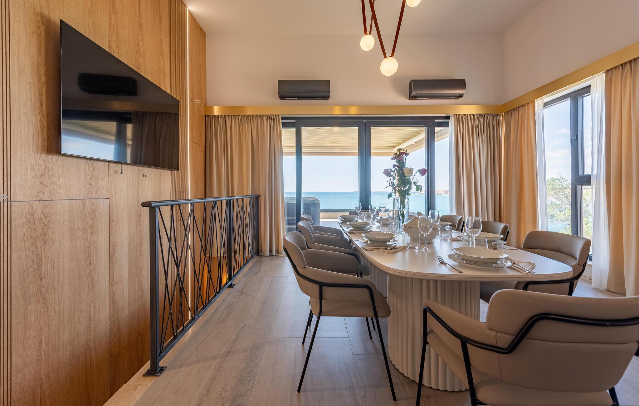 Hvis I er på udkig efter en endog meget komfortabel bolig til årets familieferie, og vil I gerne bo lige ved stranden, er denne vidunderlige toetagers lejlighed det helt rette valg for jer. Udsigten over vandet er helt igennem fremragende og kan nydes fra de to terrasser, når vejret er lækkert, som det jo tit er her. Indretningen emmer af kvalitet over hele linjen; materialerne af høj kvalitet, møblerne komfortable og køkkenet fuldt udstyret, så I kan tage jer god tid til at kræse om livretterne efter en herlig feriedag. Hvis I skal gøre det lidt ekstra godt for jer selv, kan I sætte jer godt til rette i spabadet med en god drink og nyde farvernes forunderlige spil på himlen ved solnedgang.