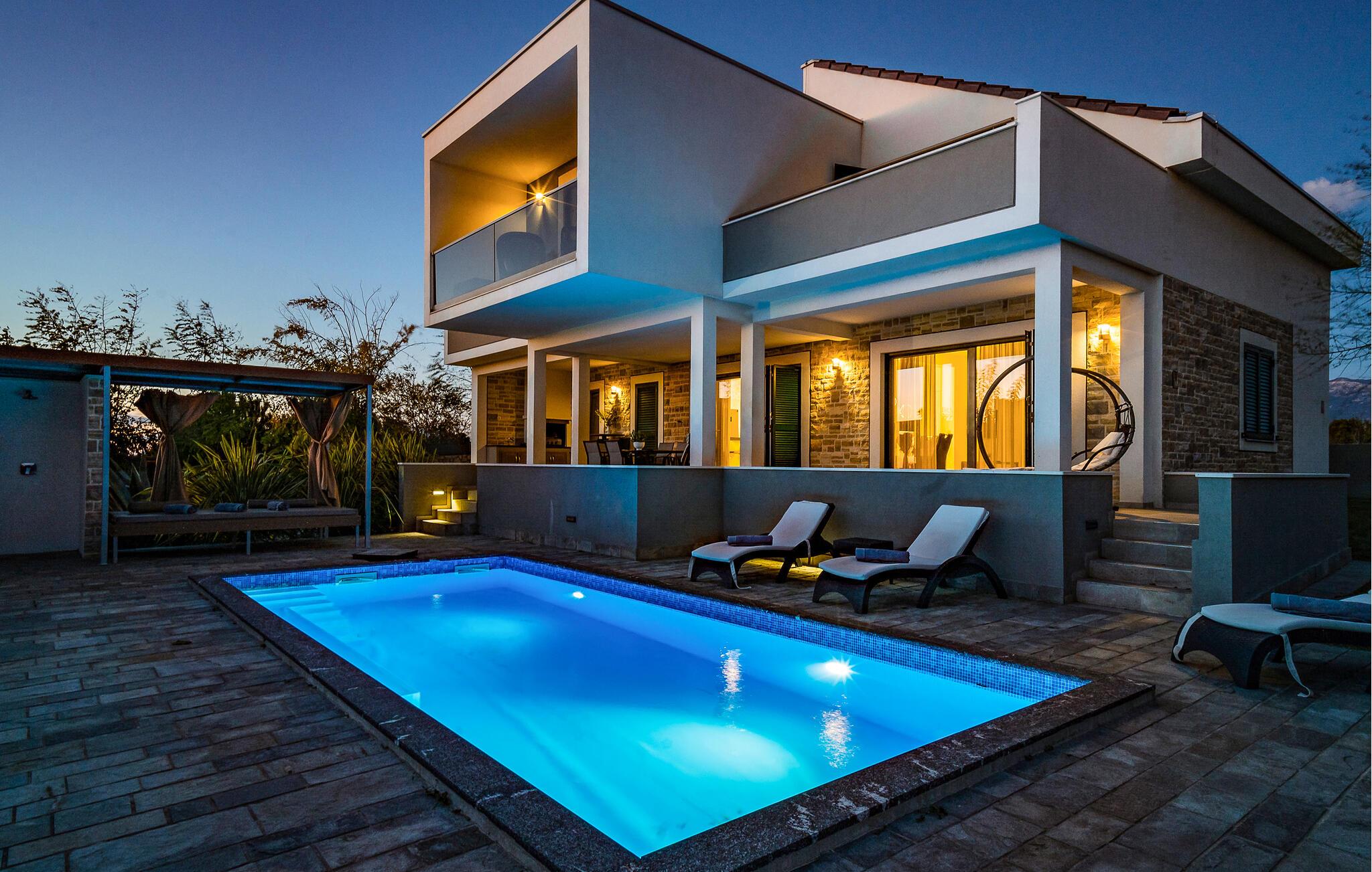 Lad turen gå til den dejlige ø Pag, hvor der venter jer en herlig bolig i dette rummelige og moderne hus. Huset er fordelt over to etager og er virkelig lækkert. Indretningen fremtræder elegant og attraktivt, og med de mange gode faciliteter kommer I ikke til at mangle noget her. Tværtimod. Begynd dagen på jeres egen altan ved soveværelset og nyd morgenkaffen eller måske lidt yoga. I den åbne stue kan I mødes til en lækker morgenmad, inden I dypper jer i poolen eller finder jer godt til rette med en god bog i liggestolene.