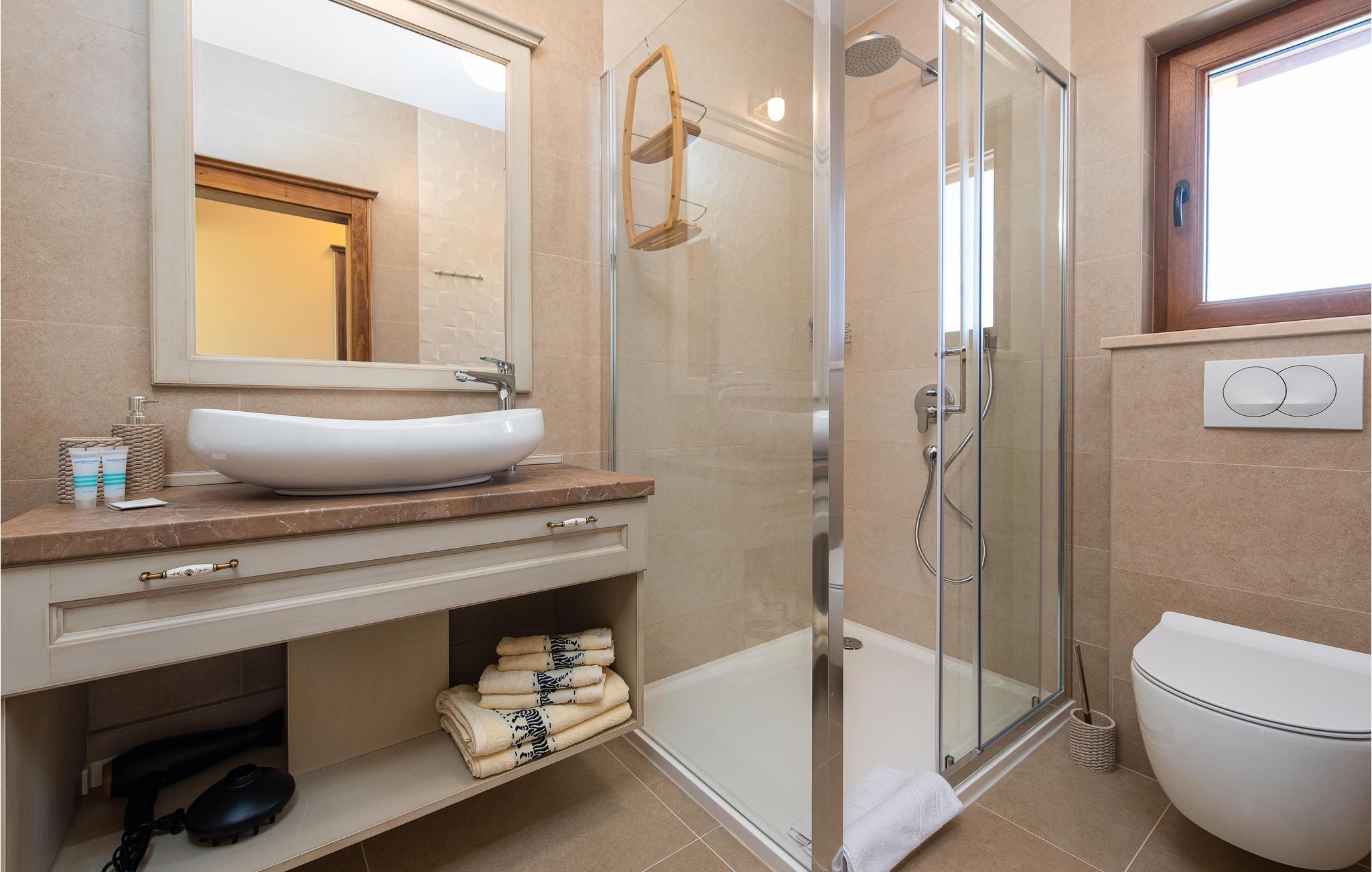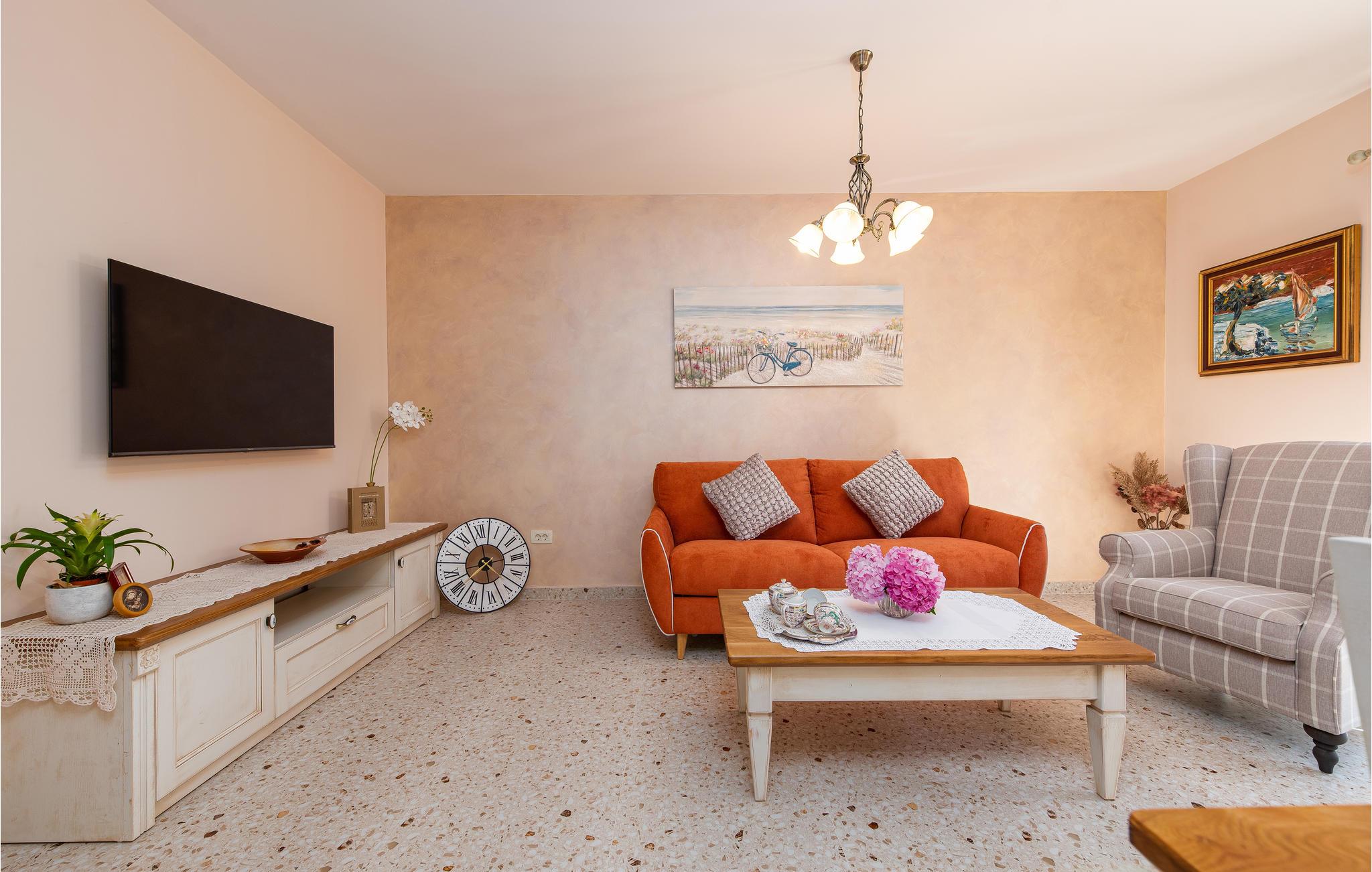 Stranden består af småsten og beton, en lokal strand med få mennesker, perfekt til badning og solbadning. I kan også opdage den charmerende natur, tage på vandre- og cykelture og dvæle ved smukke, lange stenstrande. Underholdning er heller ikke forsømt, da I også kan tilbringe en aften i de livlige byer med barer og restauranter.