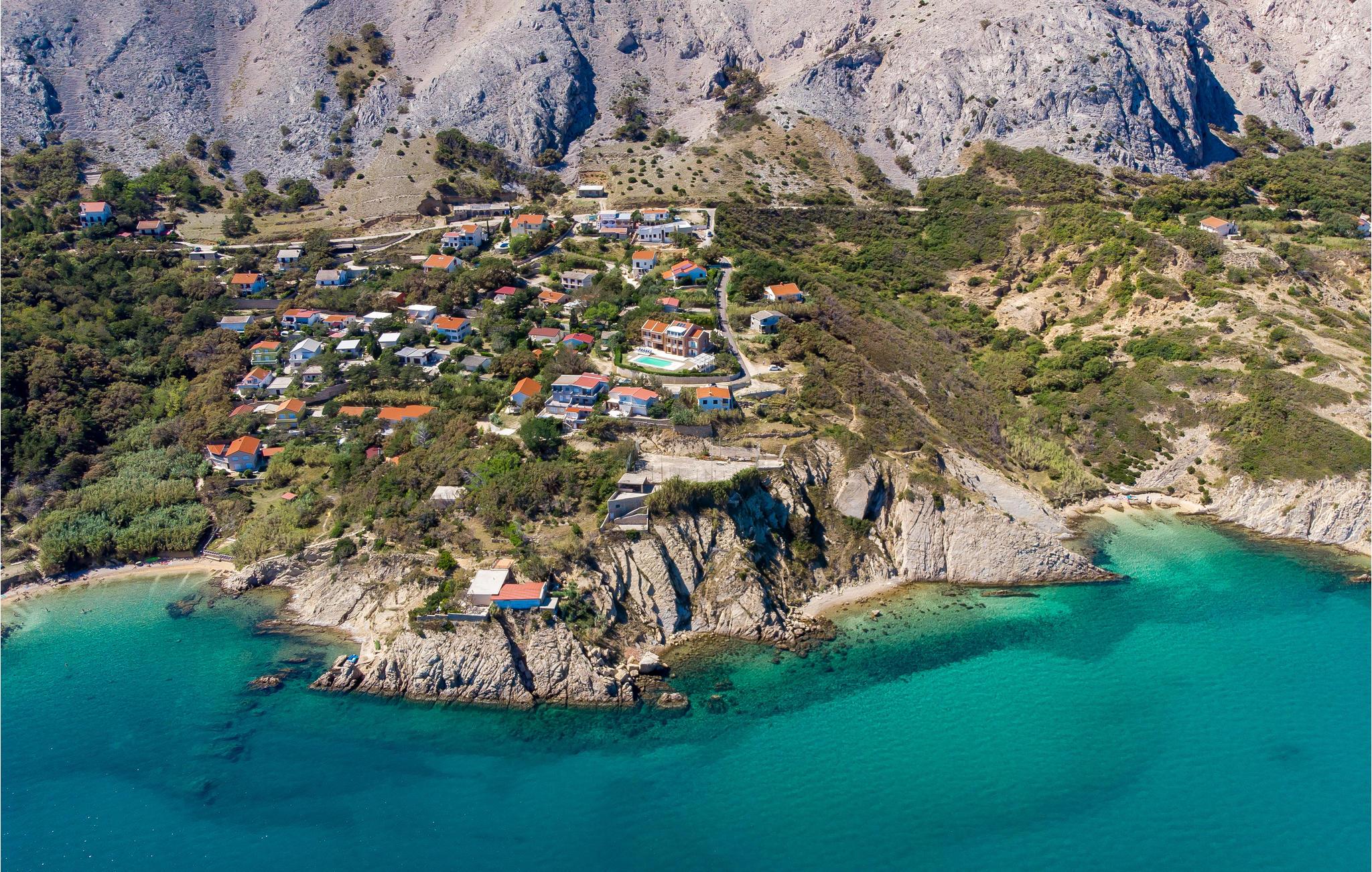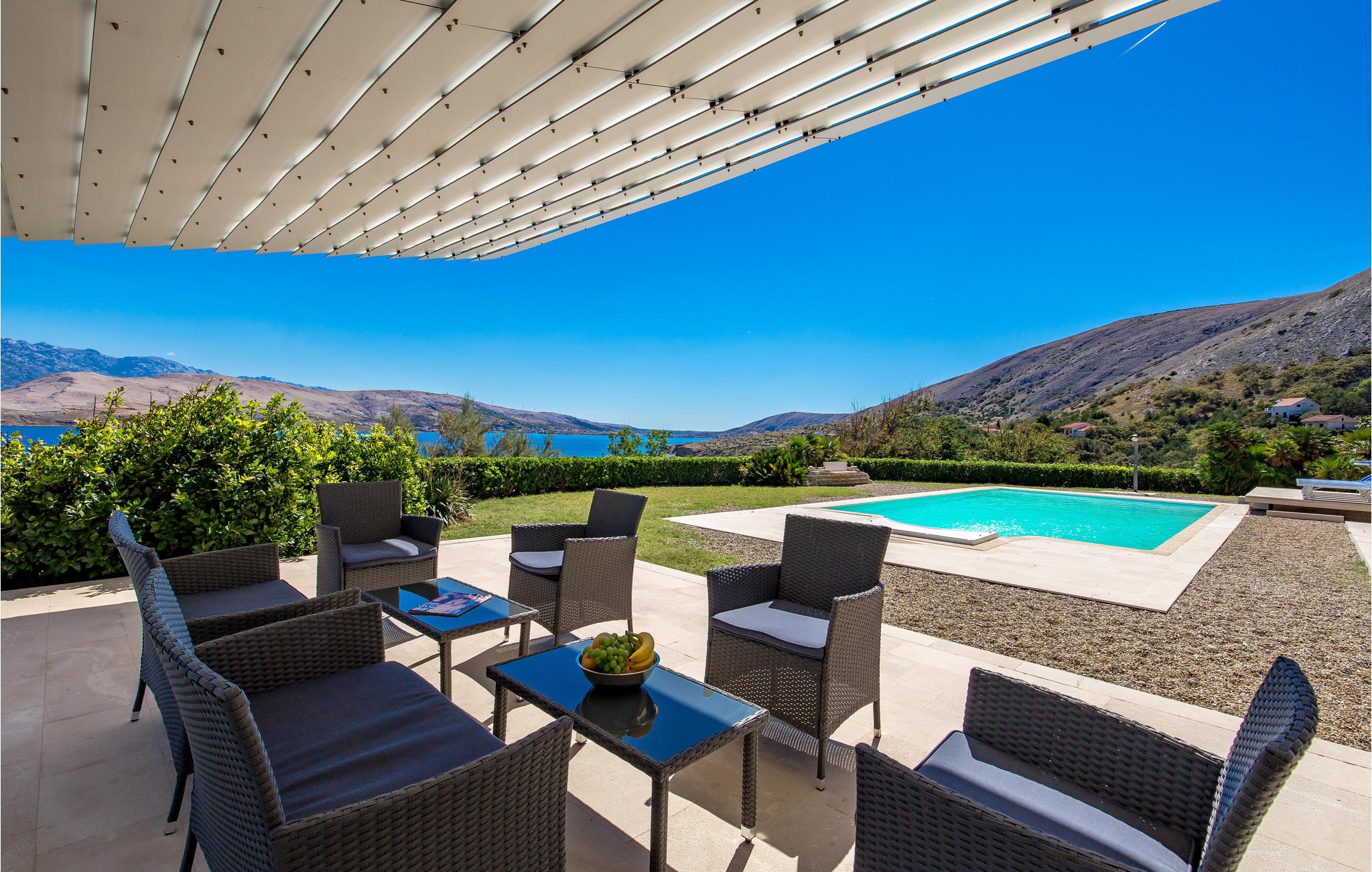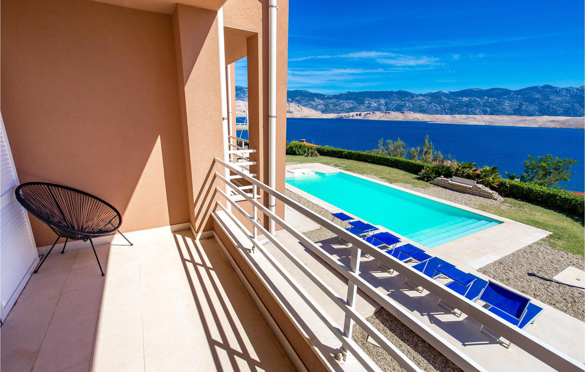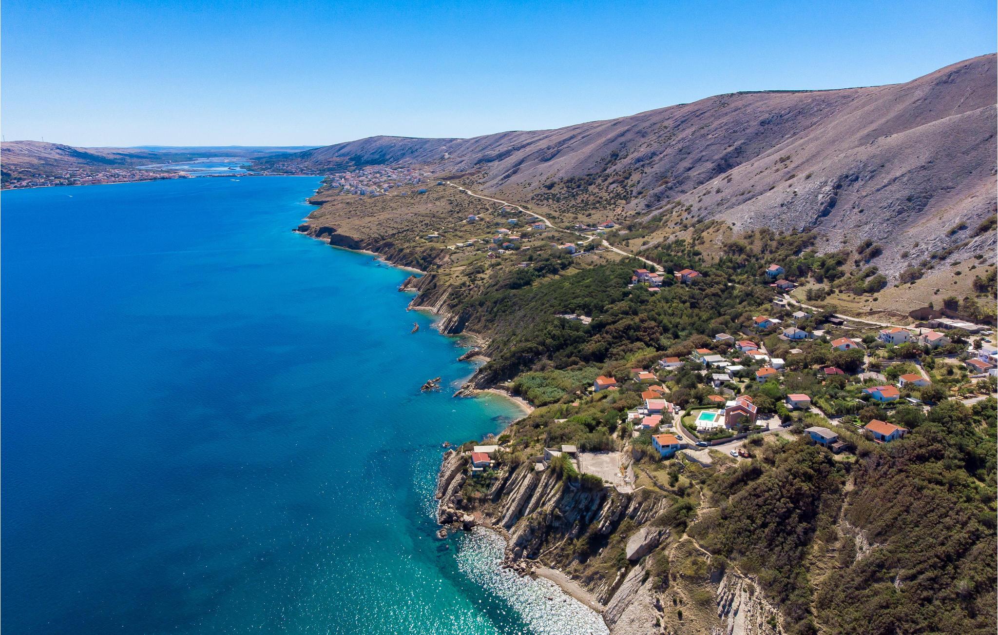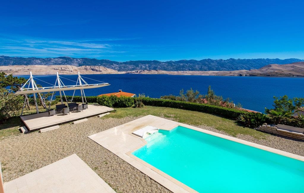Und jer selv en luksusferie, og tilbring de bedste dage på året i dette fantastiske drømmehus i rolige omgivelser. Allerede i stueetagen mærker I den behagelige og stilfulde indretning. Her finder I det store opholdsrum med det veludstyrede køkken og spisekrog samt et badeværelse. I den centrale del af stueetagen er en stor, overdækket terrasse, som hænger sammen med en hyggelig 'konoba', et badeværelse og yderligere et (mindre) opholdsrum. Fra begge opholdsrum er der en fantastisk udsigt over havet, og kun en skydedør skiller jer fra poolterrassen. Via en indendørs trappe eller en udendørs vindeltrappe kommer I til 1. sal med soveværelser og yderligere 2 badeværelser. Til soverum 2,3 og 4 hører overdækkede terrasser. På 2. sal ligger soverum 5, hvor den ene væg er af glas. Det giver en meget flot udsigt over byen Pag og Velebit-kanalen. Fra alle rum er der udsigt til hav og pool. Området omkring poolen er flisebelagt og indbyder til solbadning. Men skulle det blive for varmt, kan man bare gå ind i skyggen i pavillonerne og nyde en kold forfriskning og udsigten til Velebit-bjergene. Om aftenen er poolen oplyst, hvilket fremkalder en romantisk stemning. Grunden er indhegnet og god for børnene at lege på. Stranden neden for huset er en stenstrand, men en kiselstrand ligger kun få minutter derfra til fods. Byen Pag ligger 3 km væk. Her kan I komme på bådtur og lære at dykke. Besøg de lokale restauranter, og husk endelig at få smagt lammekødet og den krydrede Pag-ost. Skrå lofter i tagetagen med mindste loftshøjde 1,20 m.