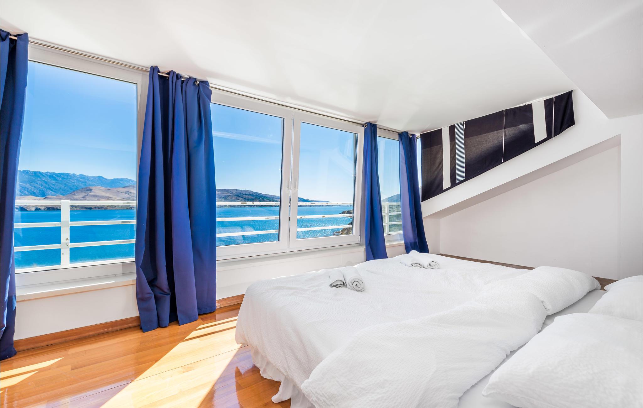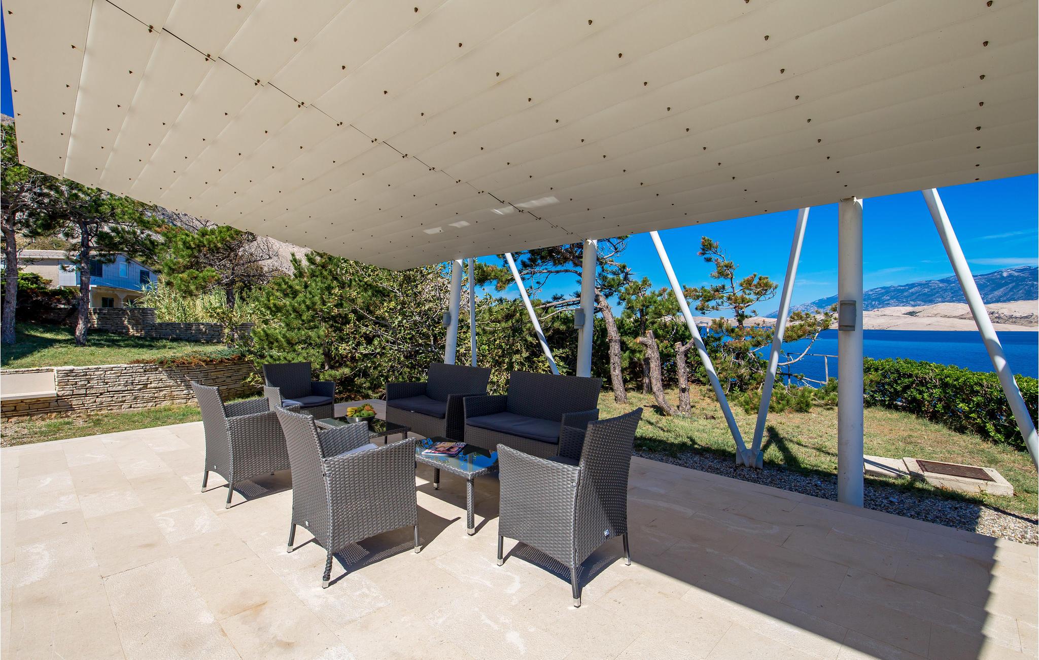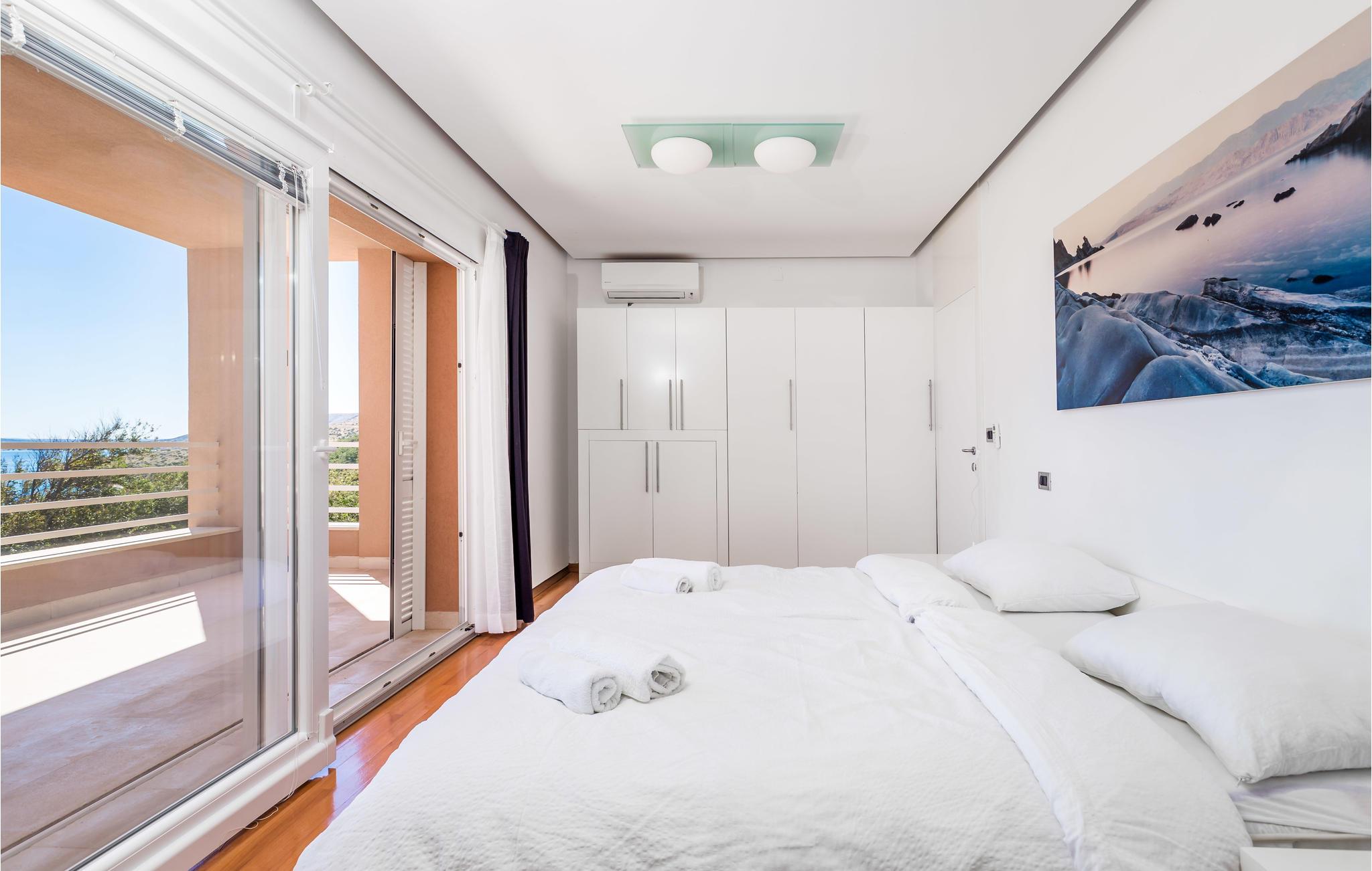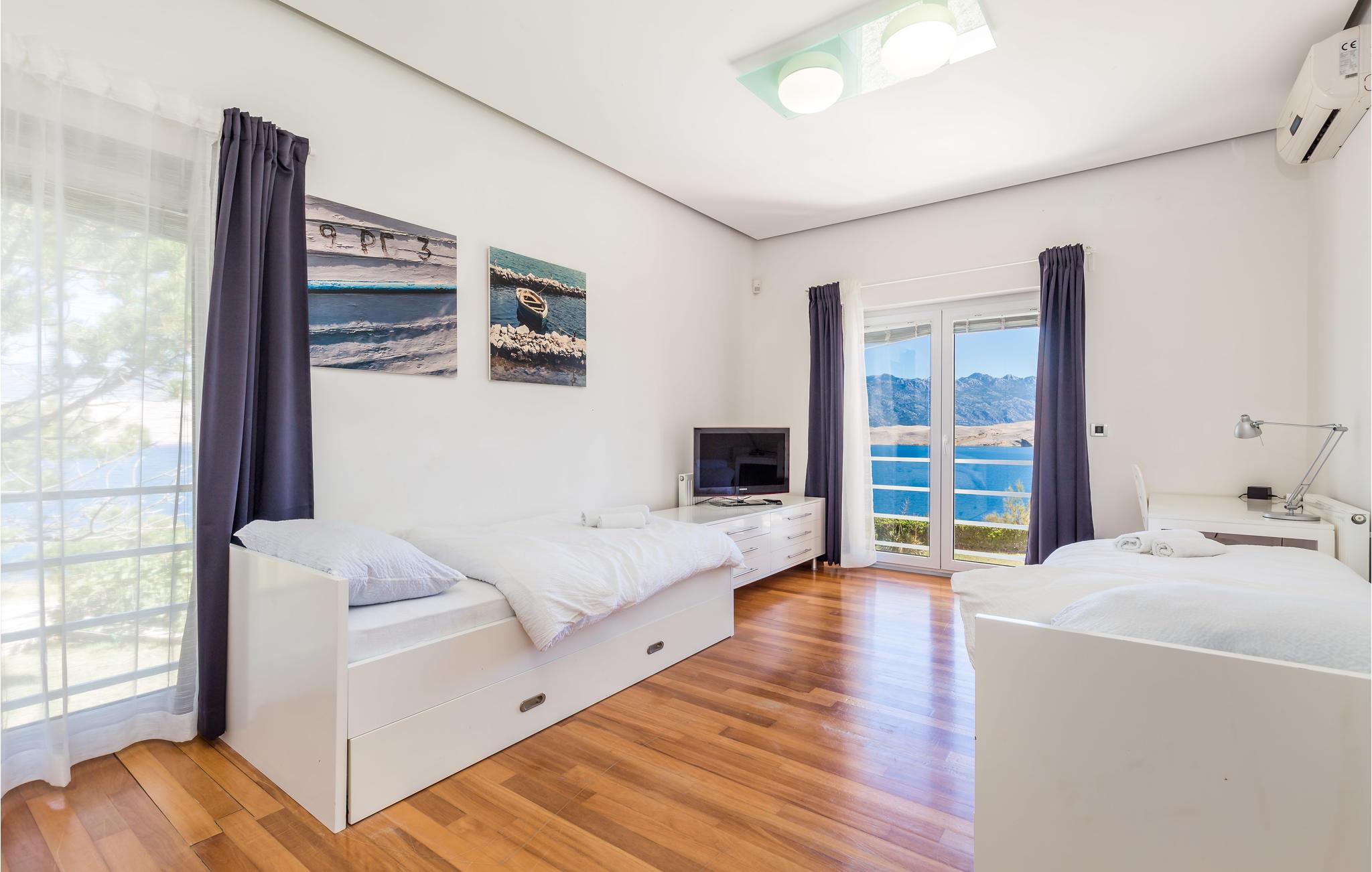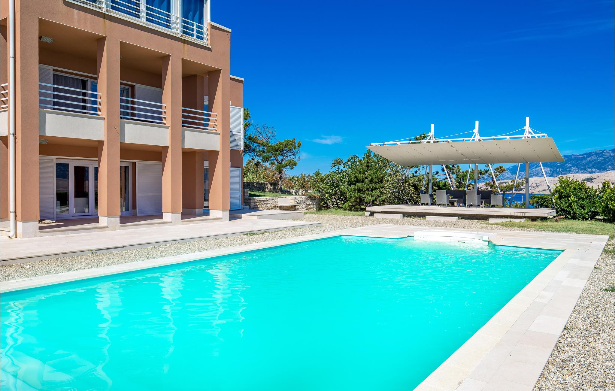 Und jer selv en luksusferie, og tilbring de bedste dage på året i dette fantastiske drømmehus i rolige omgivelser. Allerede i stueetagen mærker I den behagelige og stilfulde indretning. Her finder I det store opholdsrum med det veludstyrede køkken og spisekrog samt et badeværelse. I den centrale del af stueetagen er en stor, overdækket terrasse, som hænger sammen med en hyggelig 'konoba', et badeværelse og yderligere et (mindre) opholdsrum. Fra begge opholdsrum er der en fantastisk udsigt over havet, og kun en skydedør skiller jer fra poolterrassen. Via en indendørs trappe eller en udendørs vindeltrappe kommer I til 1. sal med soveværelser og yderligere 2 badeværelser. Til soverum 2,3 og 4 hører overdækkede terrasser. På 2. sal ligger soverum 5, hvor den ene væg er af glas. Det giver en meget flot udsigt over byen Pag og Velebit-kanalen. Fra alle rum er der udsigt til hav og pool. Området omkring poolen er flisebelagt og indbyder til solbadning. Men skulle det blive for varmt, kan man bare gå ind i skyggen i pavillonerne og nyde en kold forfriskning og udsigten til Velebit-bjergene. Om aftenen er poolen oplyst, hvilket fremkalder en romantisk stemning. Grunden er indhegnet og god for børnene at lege på. Stranden neden for huset er en stenstrand, men en kiselstrand ligger kun få minutter derfra til fods. Byen Pag ligger 3 km væk. Her kan I komme på bådtur og lære at dykke. Besøg de lokale restauranter, og husk endelig at få smagt lammekødet og den krydrede Pag-ost. Skrå lofter i tagetagen med mindste loftshøjde 1,20 m.