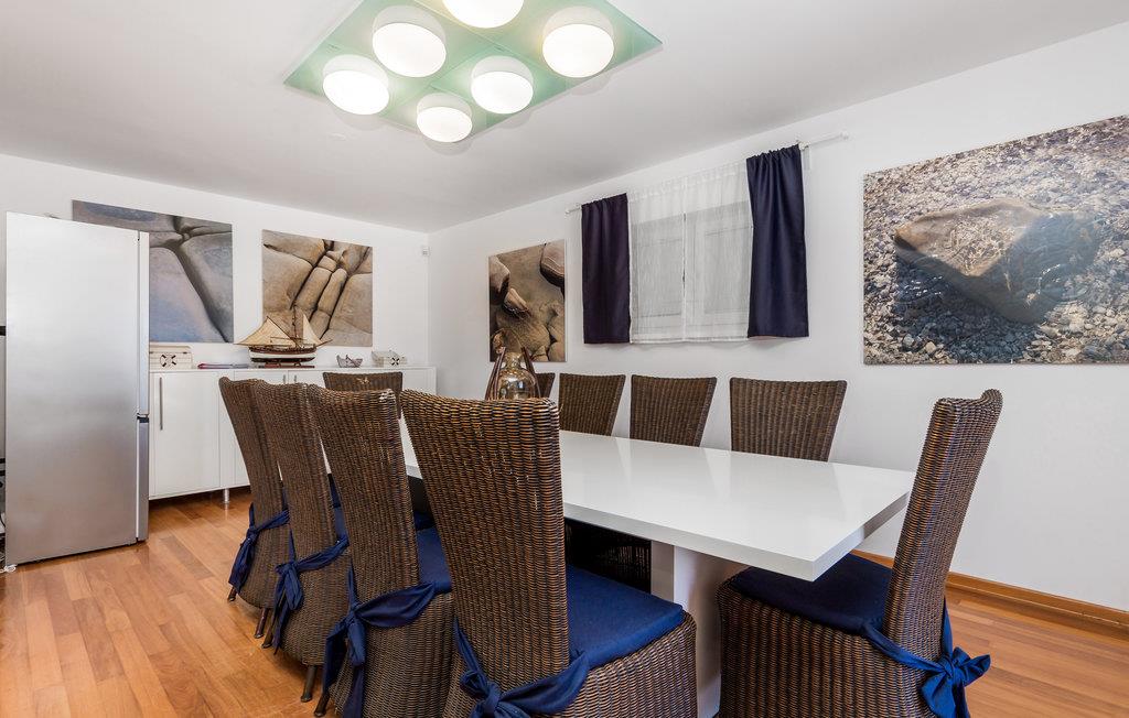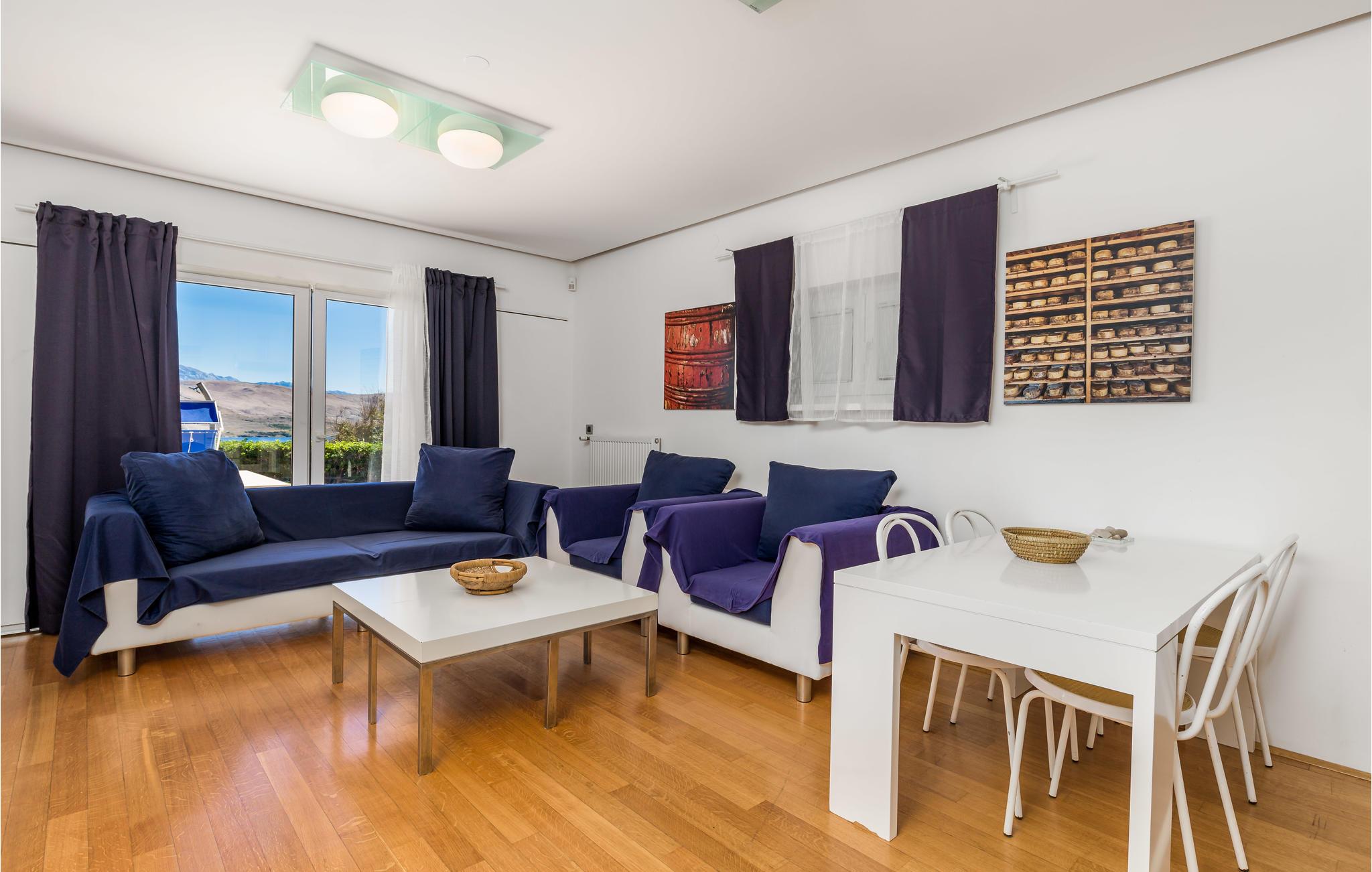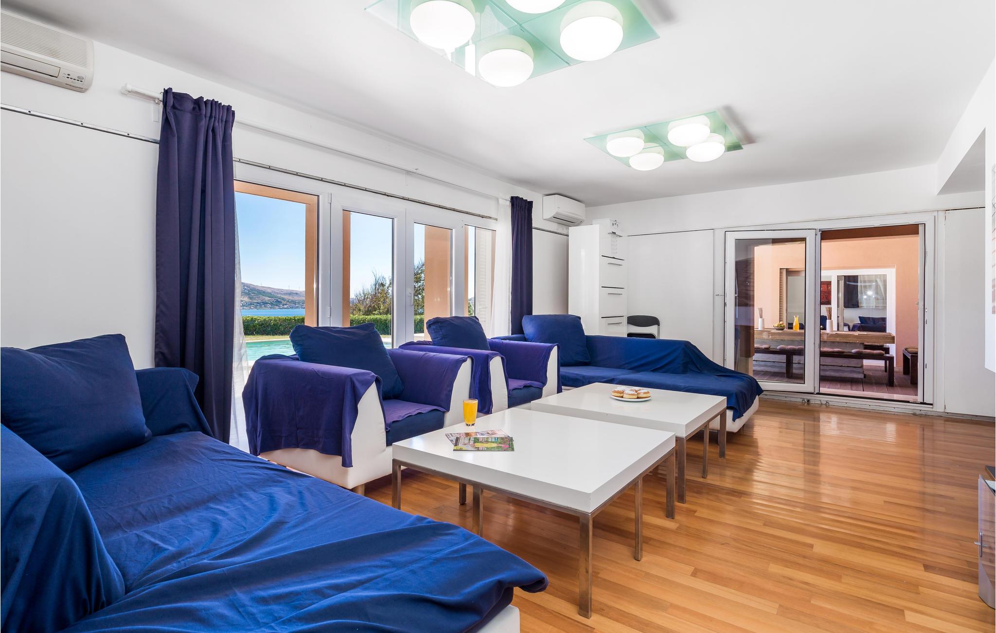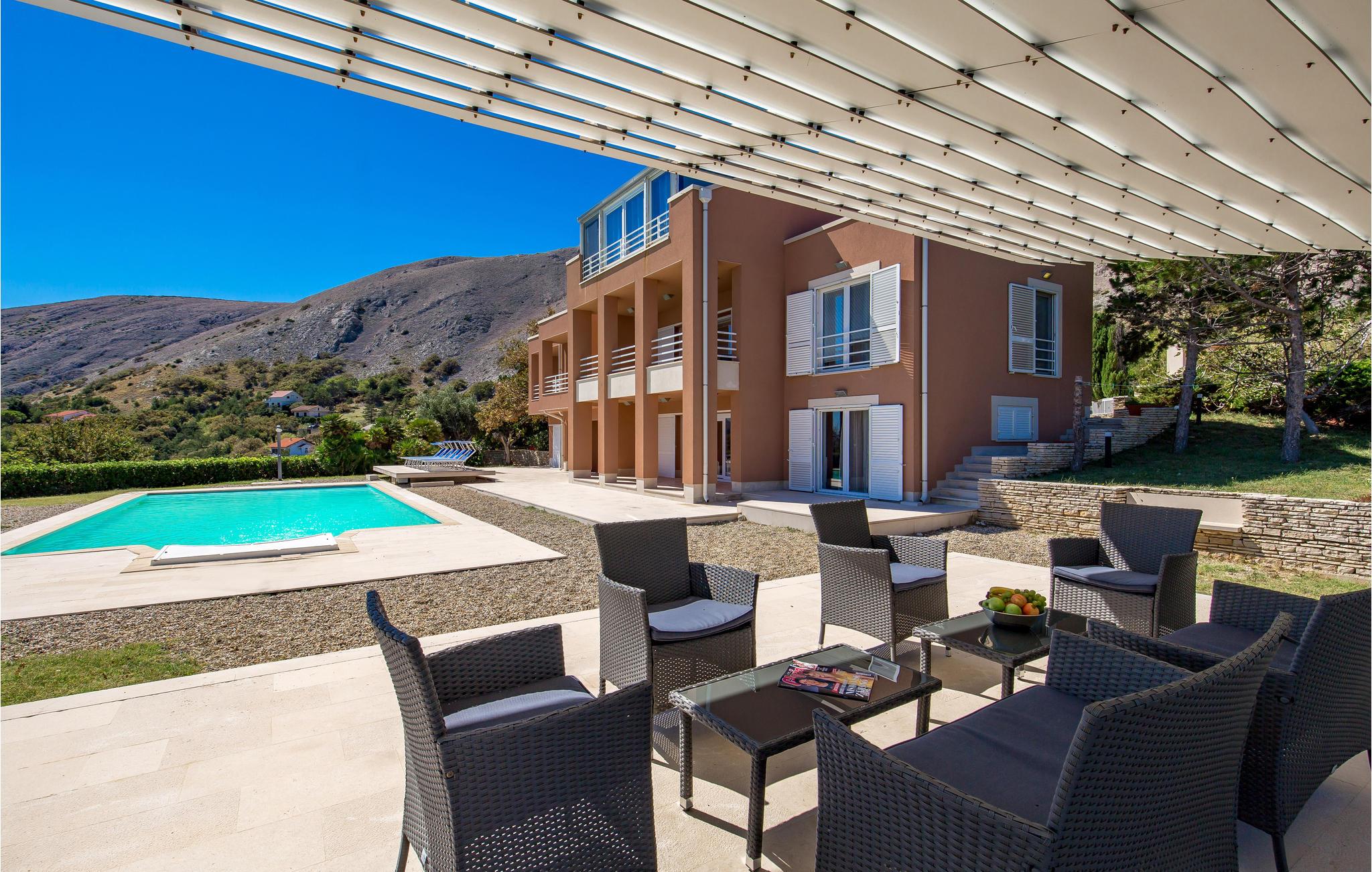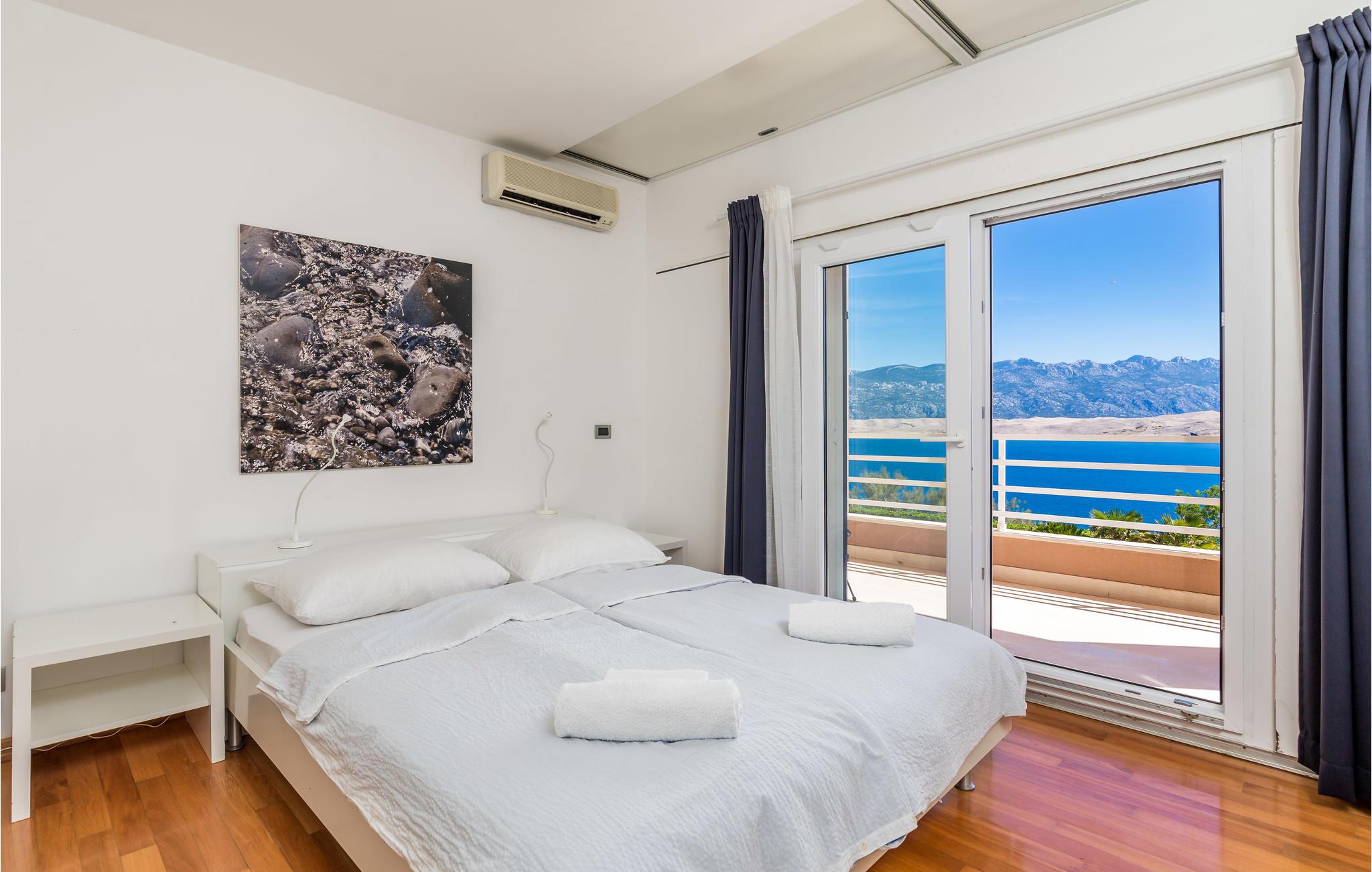 Und jer selv en luksusferie, og tilbring de bedste dage på året i dette fantastiske drømmehus i rolige omgivelser. Allerede i stueetagen mærker I den behagelige og stilfulde indretning. Her finder I det store opholdsrum med det veludstyrede køkken og spisekrog samt et badeværelse. I den centrale del af stueetagen er en stor, overdækket terrasse, som hænger sammen med en hyggelig 'konoba', et badeværelse og yderligere et (mindre) opholdsrum. Fra begge opholdsrum er der en fantastisk udsigt over havet, og kun en skydedør skiller jer fra poolterrassen. Via en indendørs trappe eller en udendørs vindeltrappe kommer I til 1. sal med soveværelser og yderligere 2 badeværelser. Til soverum 2,3 og 4 hører overdækkede terrasser. På 2. sal ligger soverum 5, hvor den ene væg er af glas. Det giver en meget flot udsigt over byen Pag og Velebit-kanalen. Fra alle rum er der udsigt til hav og pool. Området omkring poolen er flisebelagt og indbyder til solbadning. Men skulle det blive for varmt, kan man bare gå ind i skyggen i pavillonerne og nyde en kold forfriskning og udsigten til Velebit-bjergene. Om aftenen er poolen oplyst, hvilket fremkalder en romantisk stemning. Grunden er indhegnet og god for børnene at lege på. Stranden neden for huset er en stenstrand, men en kiselstrand ligger kun få minutter derfra til fods. Byen Pag ligger 3 km væk. Her kan I komme på bådtur og lære at dykke. Besøg de lokale restauranter, og husk endelig at få smagt lammekødet og den krydrede Pag-ost. Skrå lofter i tagetagen med mindste loftshøjde 1,20 m.