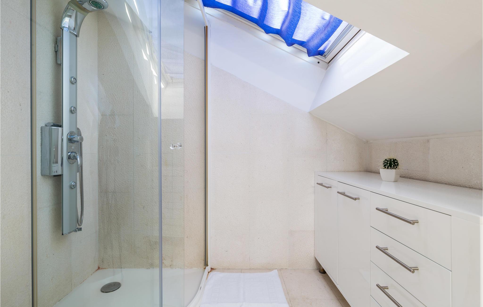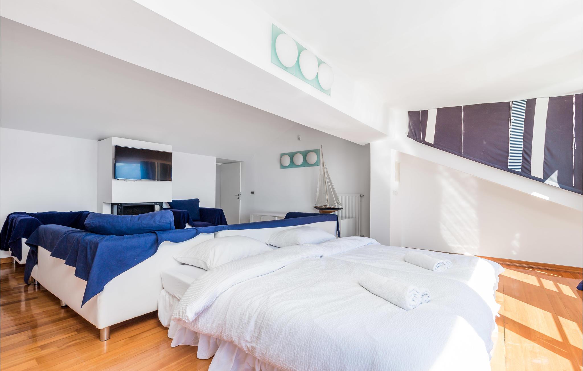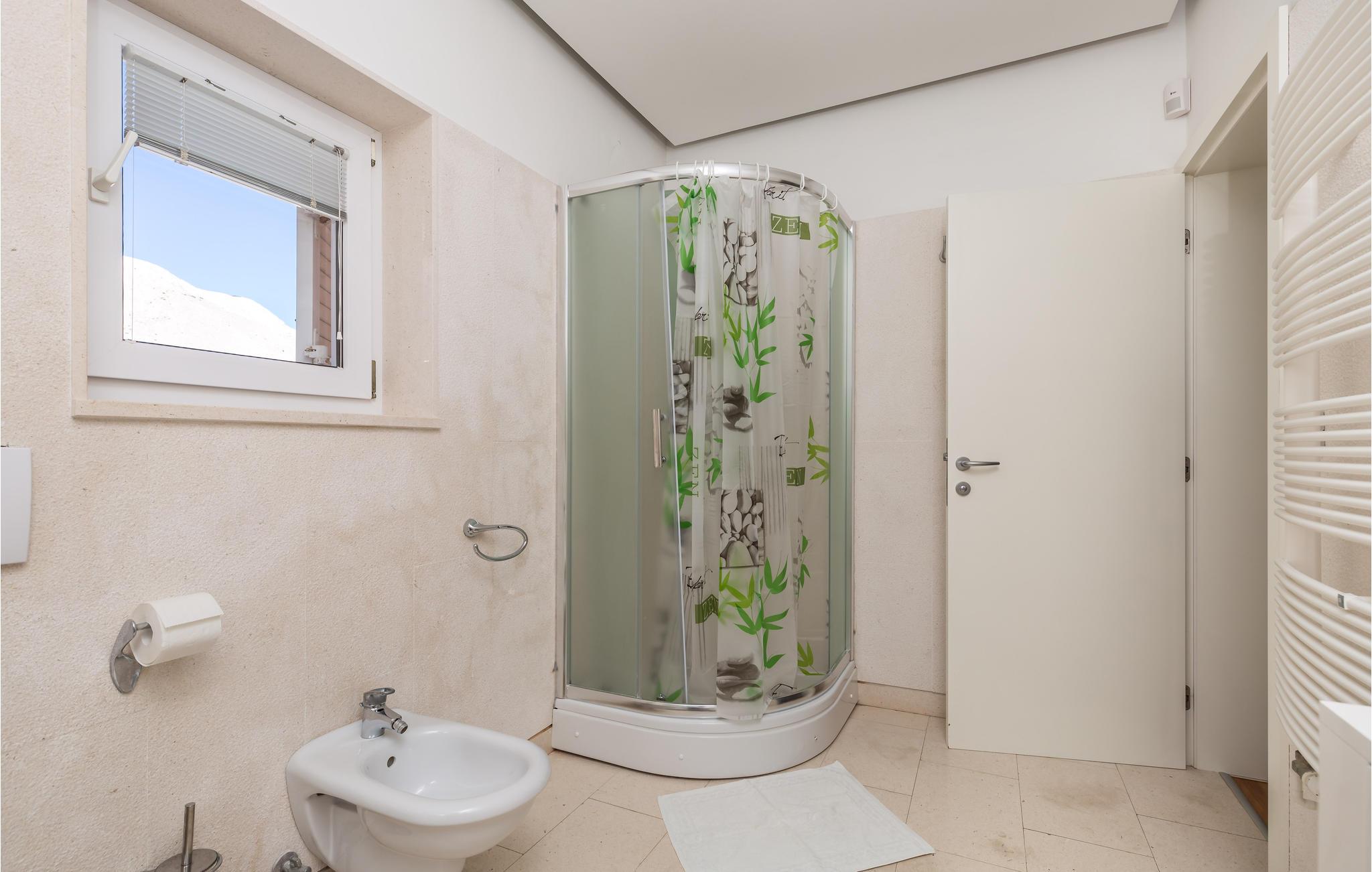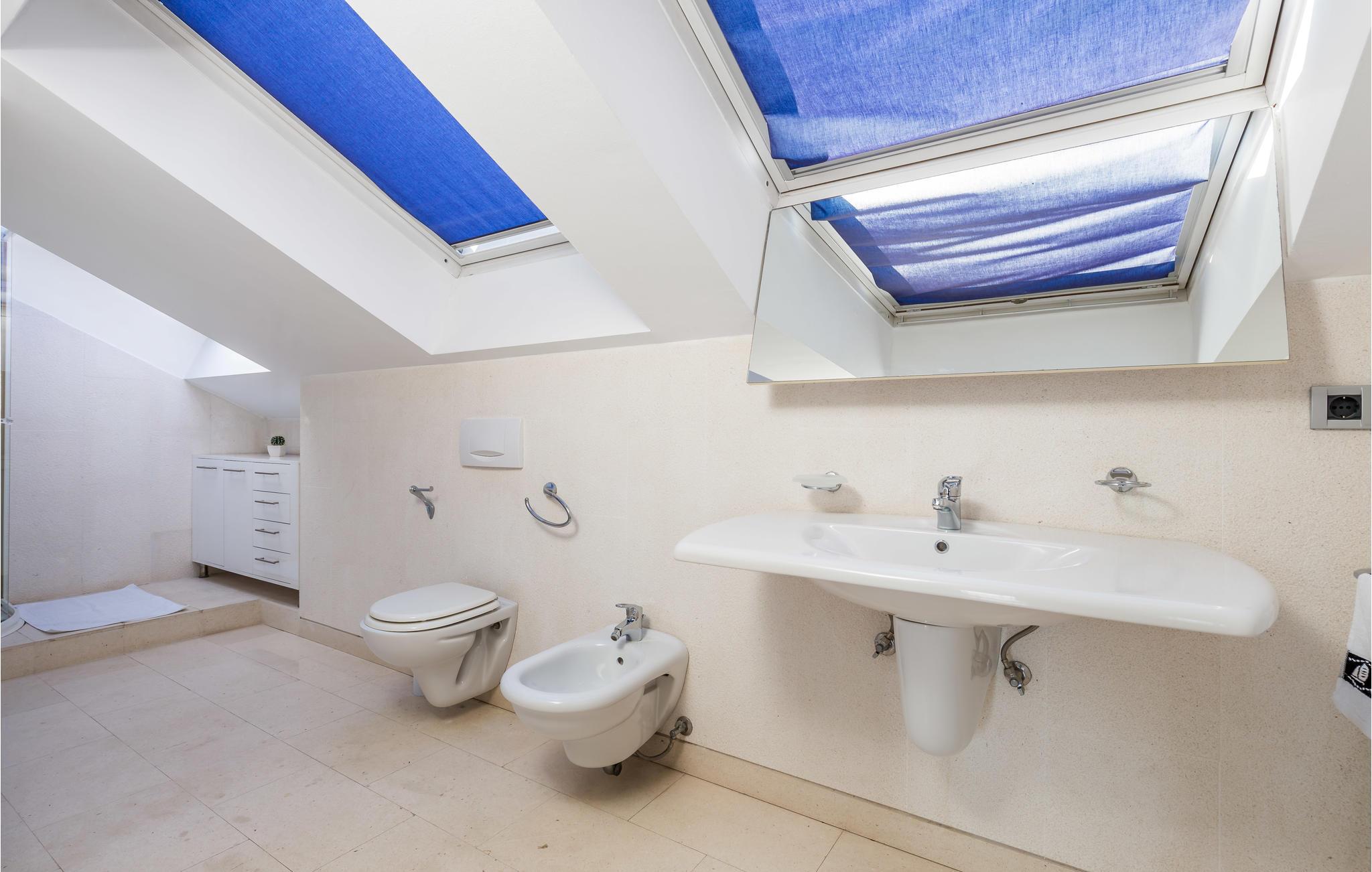 Und jer selv en luksusferie, og tilbring de bedste dage på året i dette fantastiske drømmehus i rolige omgivelser. Allerede i stueetagen mærker I den behagelige og stilfulde indretning. Her finder I det store opholdsrum med det veludstyrede køkken og spisekrog samt et badeværelse. I den centrale del af stueetagen er en stor, overdækket terrasse, som hænger sammen med en hyggelig 'konoba', et badeværelse og yderligere et (mindre) opholdsrum. Fra begge opholdsrum er der en fantastisk udsigt over havet, og kun en skydedør skiller jer fra poolterrassen. Via en indendørs trappe eller en udendørs vindeltrappe kommer I til 1. sal med soveværelser og yderligere 2 badeværelser. Til soverum 2,3 og 4 hører overdækkede terrasser. På 2. sal ligger soverum 5, hvor den ene væg er af glas. Det giver en meget flot udsigt over byen Pag og Velebit-kanalen. Fra alle rum er der udsigt til hav og pool. Området omkring poolen er flisebelagt og indbyder til solbadning. Men skulle det blive for varmt, kan man bare gå ind i skyggen i pavillonerne og nyde en kold forfriskning og udsigten til Velebit-bjergene. Om aftenen er poolen oplyst, hvilket fremkalder en romantisk stemning. Grunden er indhegnet og god for børnene at lege på. Stranden neden for huset er en stenstrand, men en kiselstrand ligger kun få minutter derfra til fods. Byen Pag ligger 3 km væk. Her kan I komme på bådtur og lære at dykke. Besøg de lokale restauranter, og husk endelig at få smagt lammekødet og den krydrede Pag-ost. Skrå lofter i tagetagen med mindste loftshøjde 1,20 m.
