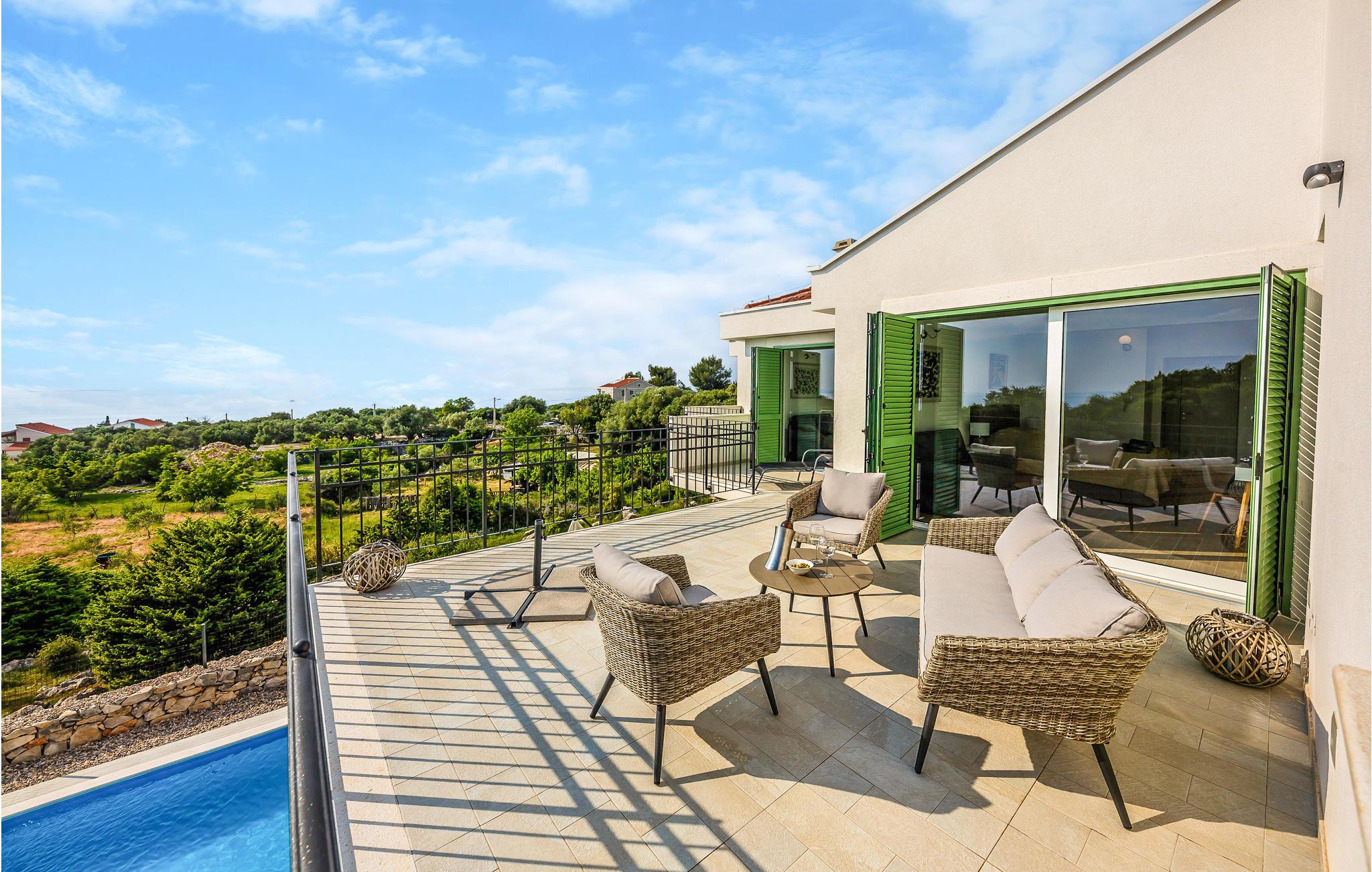 Slap af på terrassen med komfortable havemøbler, nyd lækre feriemåltider fra grillen og køl ned i poolen, når I har lyst. Nyd en fantastisk udsigt over den store udendørspool, den smukke natur og havet. Husejeren tilbyder forskellige ekstra tjenester; I kan leje en båd med eller uden skipper, booke panoramafly fra Zadar lufthavn, få frisk fisk leveret afhængigt af den daglige fangst og modtage mad fra en lækker restaurant.