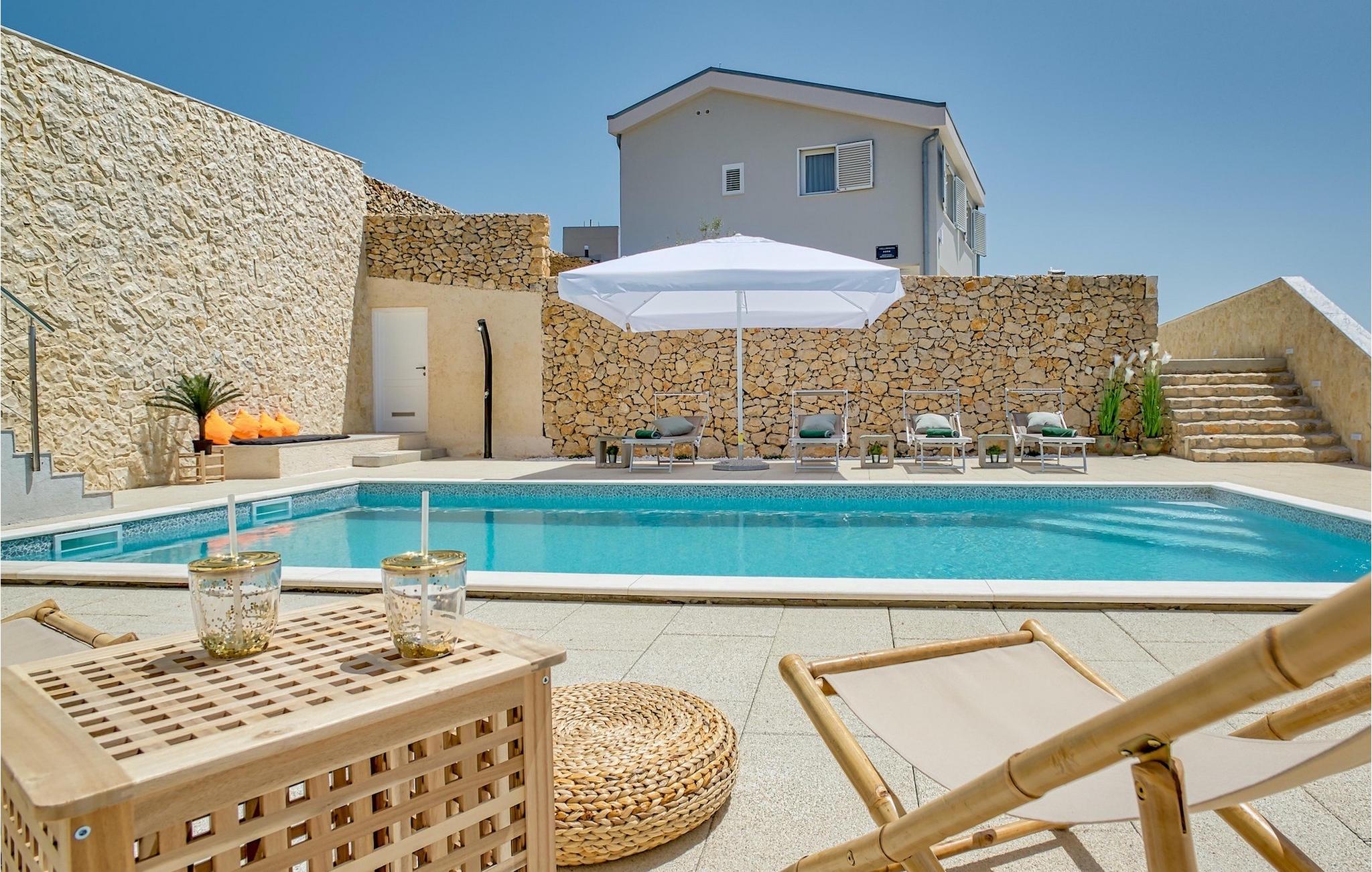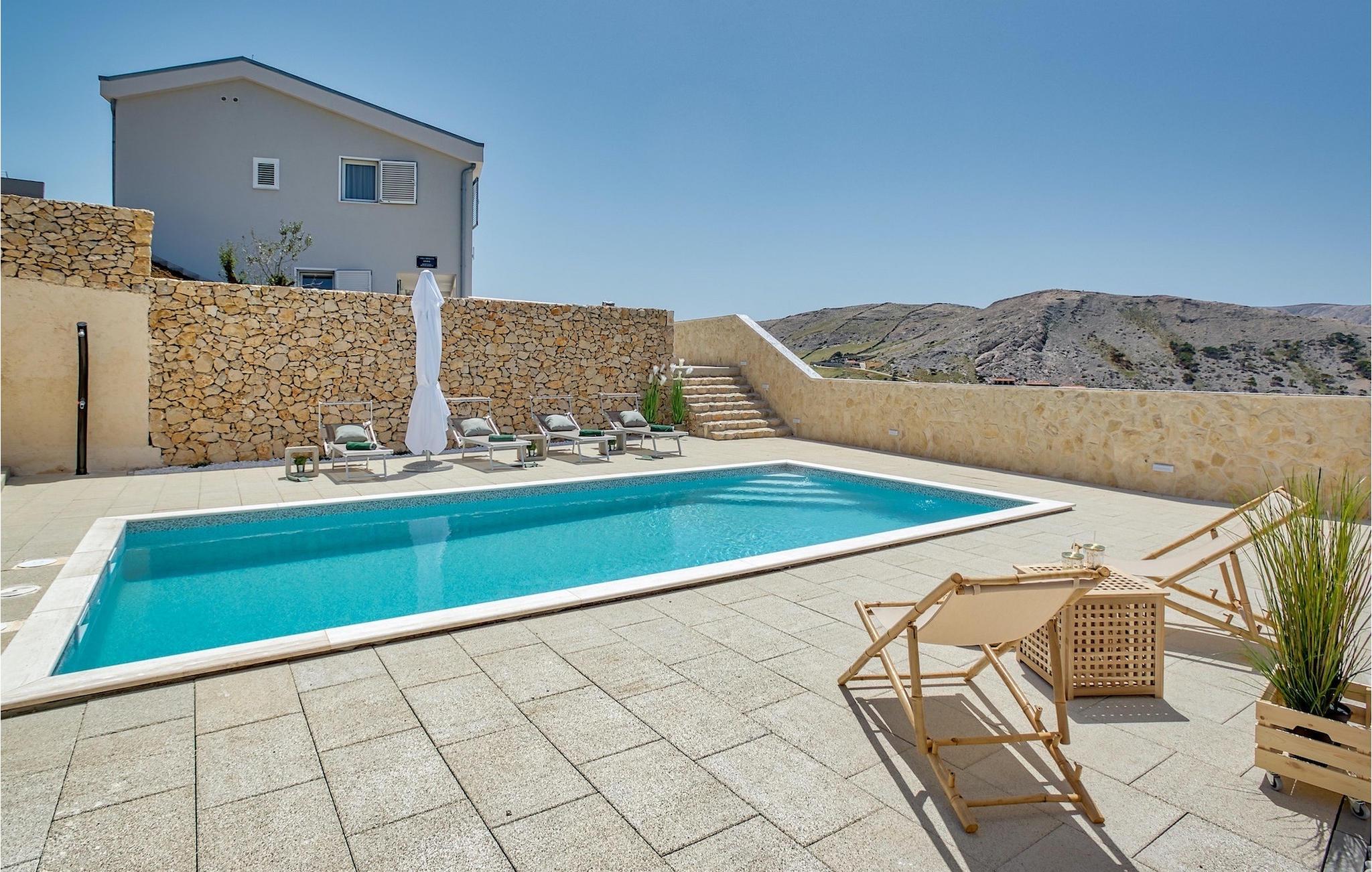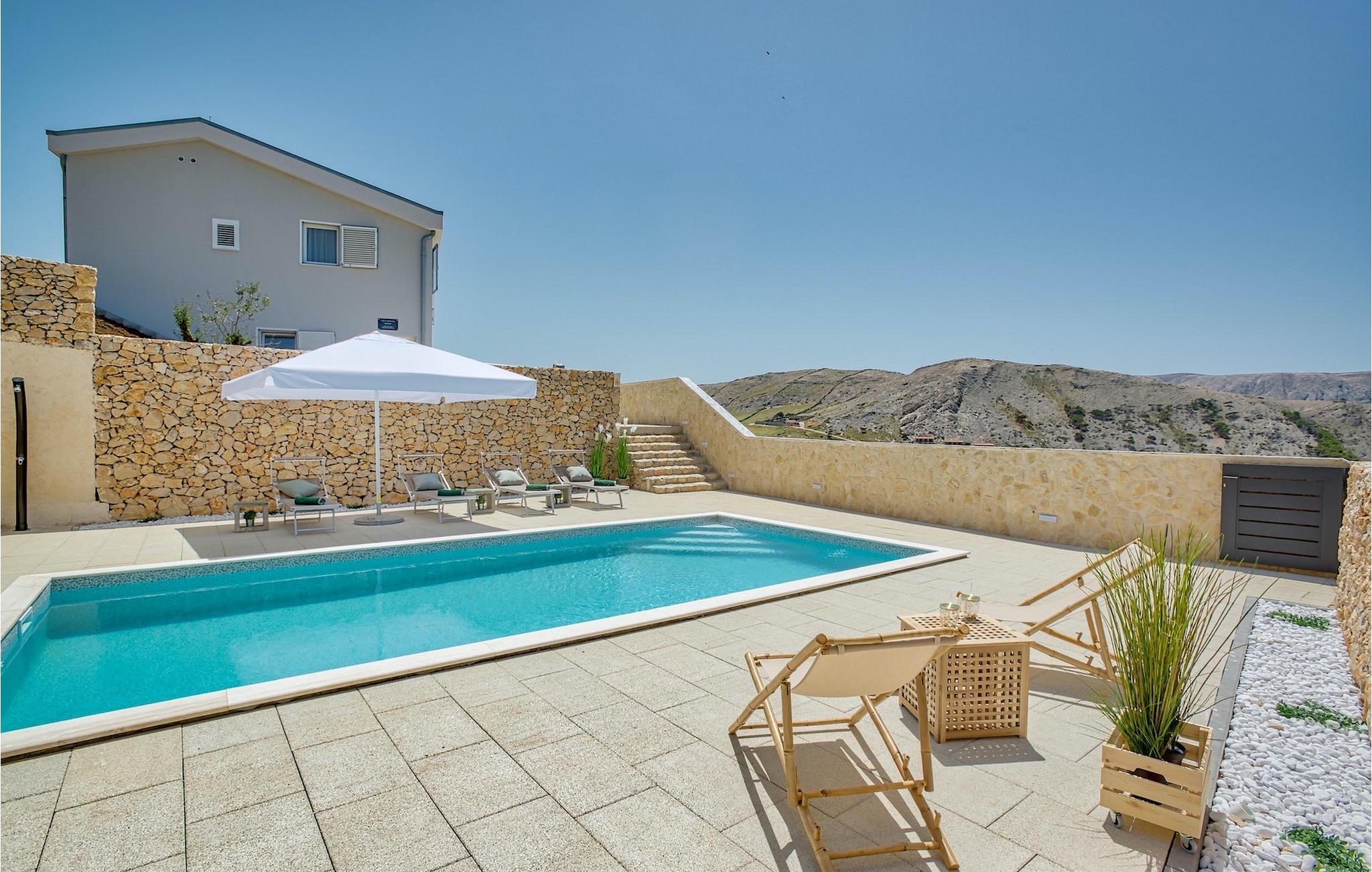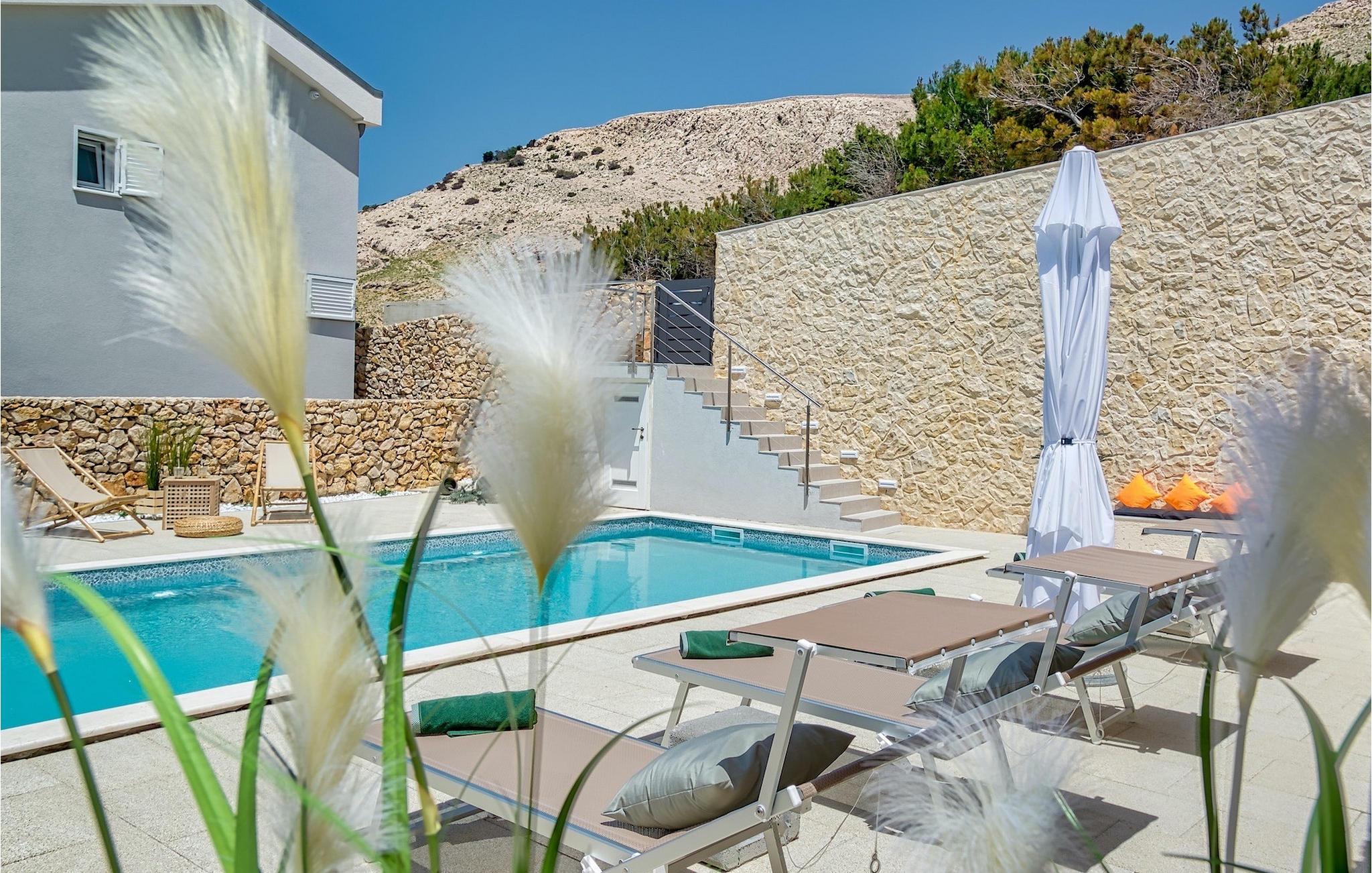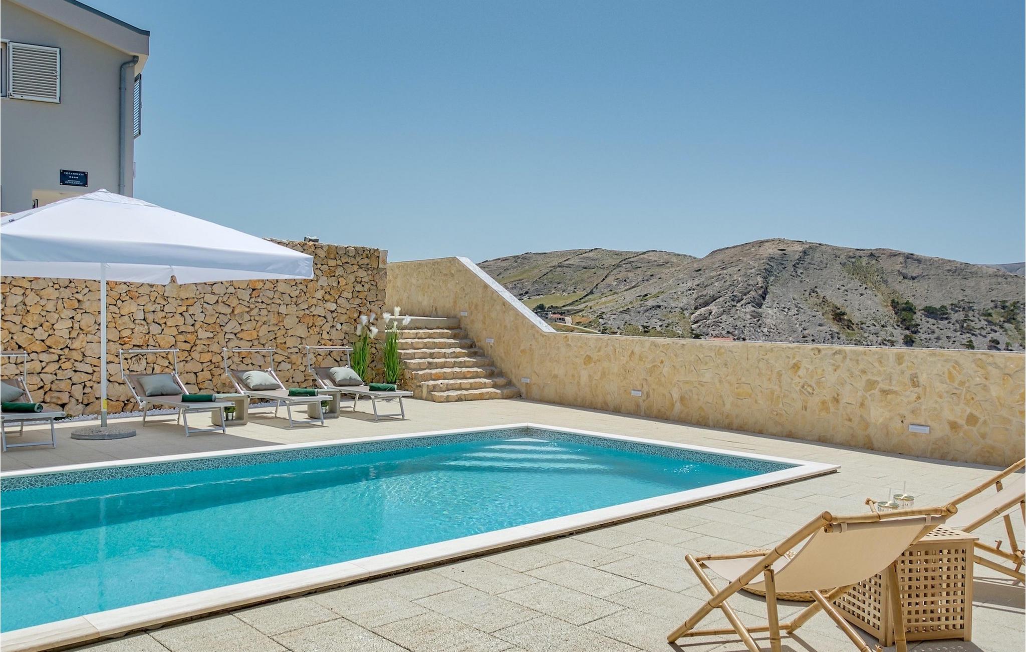 Udenfor venter den smukke private pool omgivet af den rummelige terrasse, der både inviterer dig til at slappe af og slappe af, uanset om du vil have det meste ud af den fortryllende udsigt, køle af og svømme et par omgange eller bare slappe af med en god bog eller en forfriskende drink.