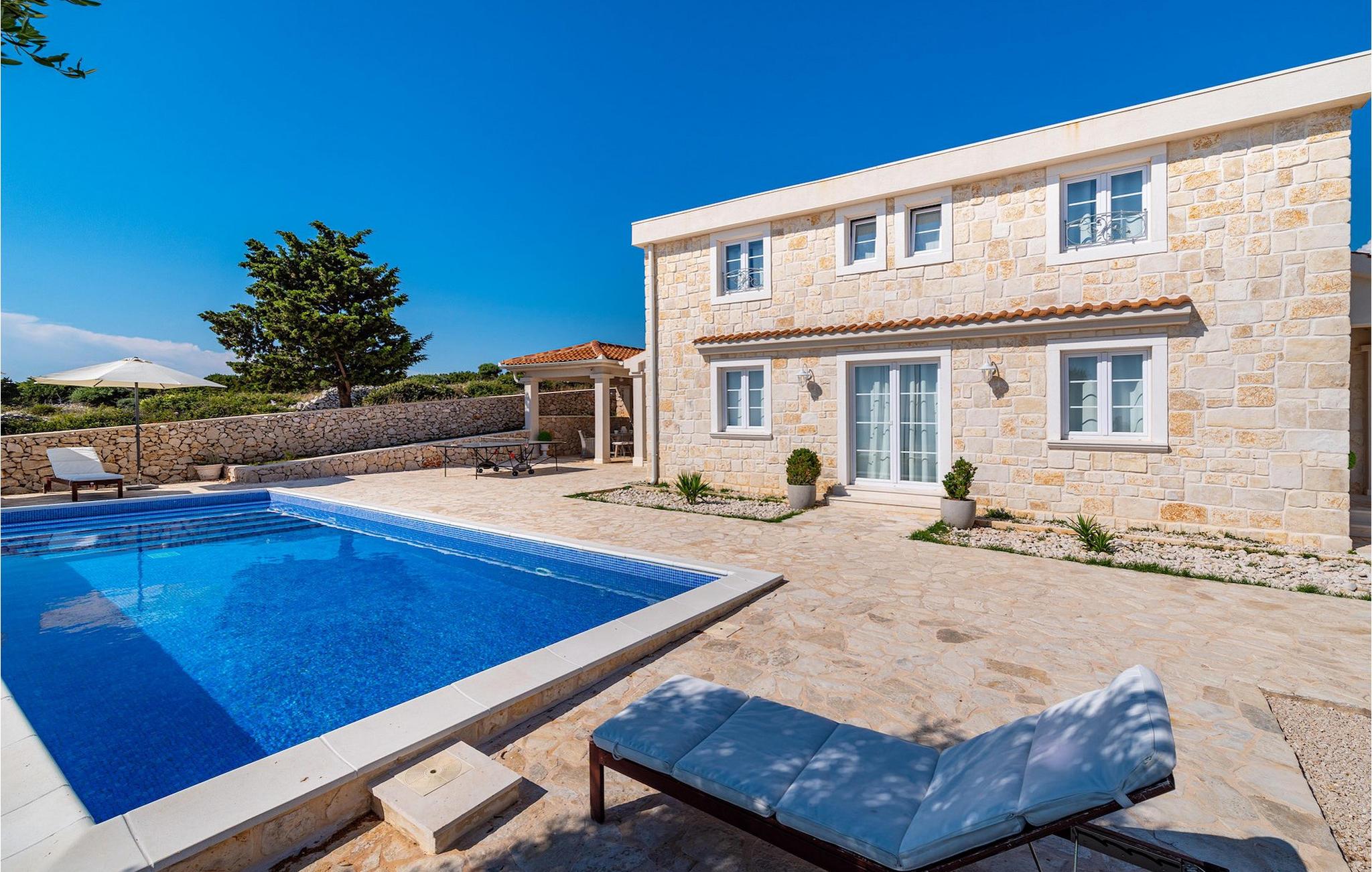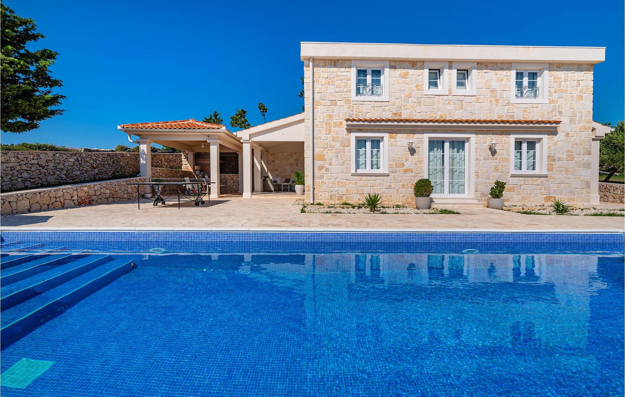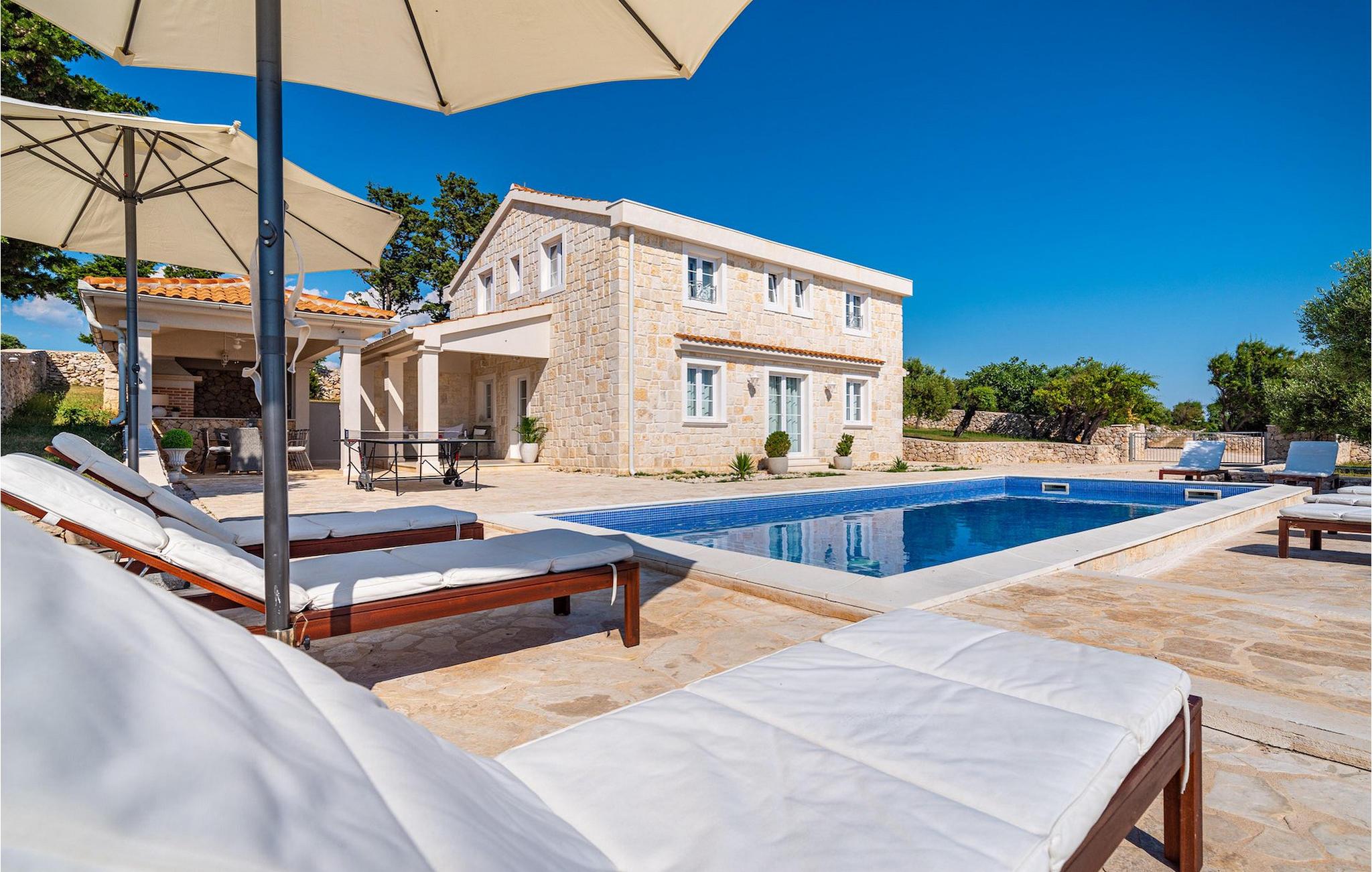 Villaen er opdelt i to etager. Stueetagen har en stue, køkken med spiseplads og et værelse med eget badeværelse. På første sal kan du finde 4 komfortable soveværelser med eget badeværelse. Villaen har en gårdhave med privat pool, hvor du kan slappe af på liggestole eller forfriske dig i den private pool med udsigt over havet. Til middage med familie og venner kan du tilberede mad på grillen, og for yderligere underholdning er der bordtennis. Slap af og nyd solnedgangen på terrassen, mens du hænger ud med dine kære. Pak dine kufferter og tag til Villa Toma på øen Pag for en uforglemmelig ferieoplevelse!Villa Toma ligger i den smukke by Novalja på øen Pag. Øen Pag ligger nord for byen Zadar. Øen er forbundet med fastlandet med en bro, og det er muligt at nå den med færgelinjen. Byen Novalja er også godt forbundet med færgelinjen med de omkringliggende øer. Øen byder på smukke strande, fremragende restauranter, caféer, klubber og sports- og underholdningsaktiviteter. Øen er kendt for Pag-ost, Pag-kniplinger og den historiske Soline. Pag ost er lavet af mælk fra tam Pag får. I nærheden er der en række nationalparker såsom Krka National Park, Northern Velebit National Park, Paklenica National Park og Plitvice Lakes.