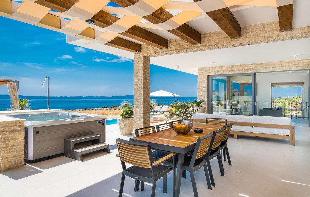 Huset tager sig flot ud både inde og ude. Svøm et par runder i poolen om morgenen og tilbring nogle afslappende timer i loungemøblerne eller på liggestolene under parasollen i løbet af dagen. I kan også glæde jer til det lækre udekøkken og jeres middage rundt om havebordet med havet som kulisse. Slut dagen af med en tur i spabad, inden I gør jer klar til en ny dag på farten.