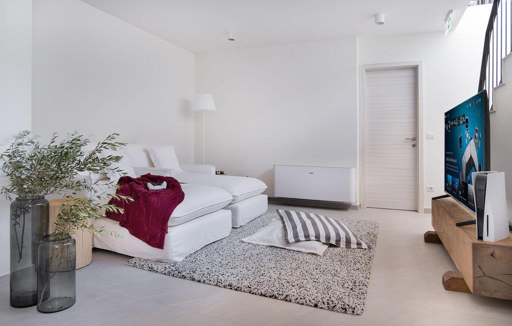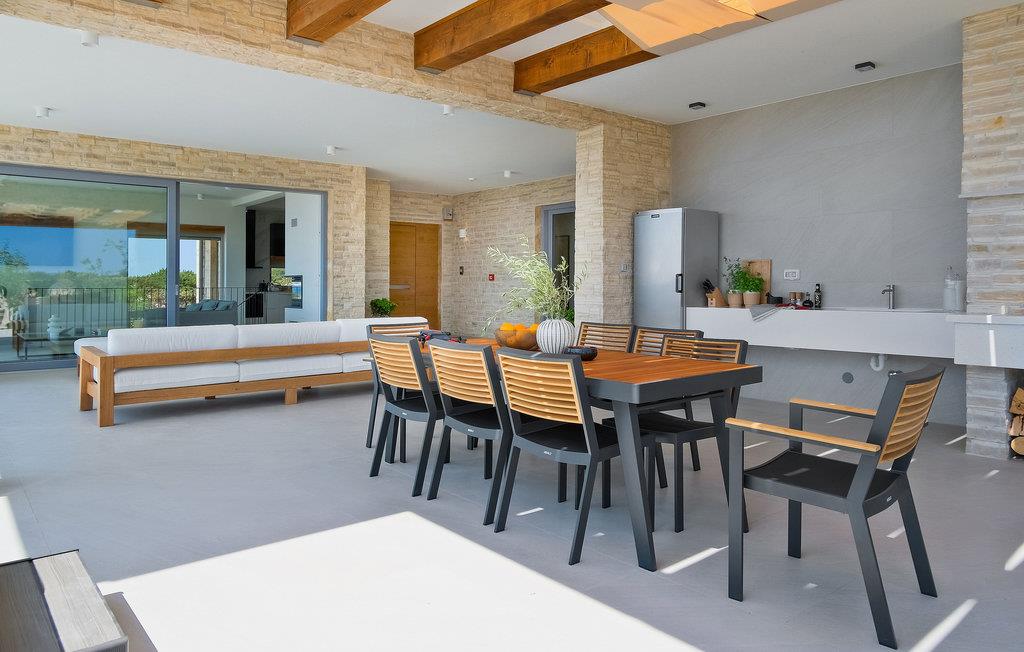Huset tager sig flot ud både inde og ude. Svøm et par runder i poolen om morgenen og tilbring nogle afslappende timer i loungemøblerne eller på liggestolene under parasollen i løbet af dagen. I kan også glæde jer til det lækre udekøkken og jeres middage rundt om havebordet med havet som kulisse. Slut dagen af med en tur i spabad, inden I gør jer klar til en ny dag på farten.