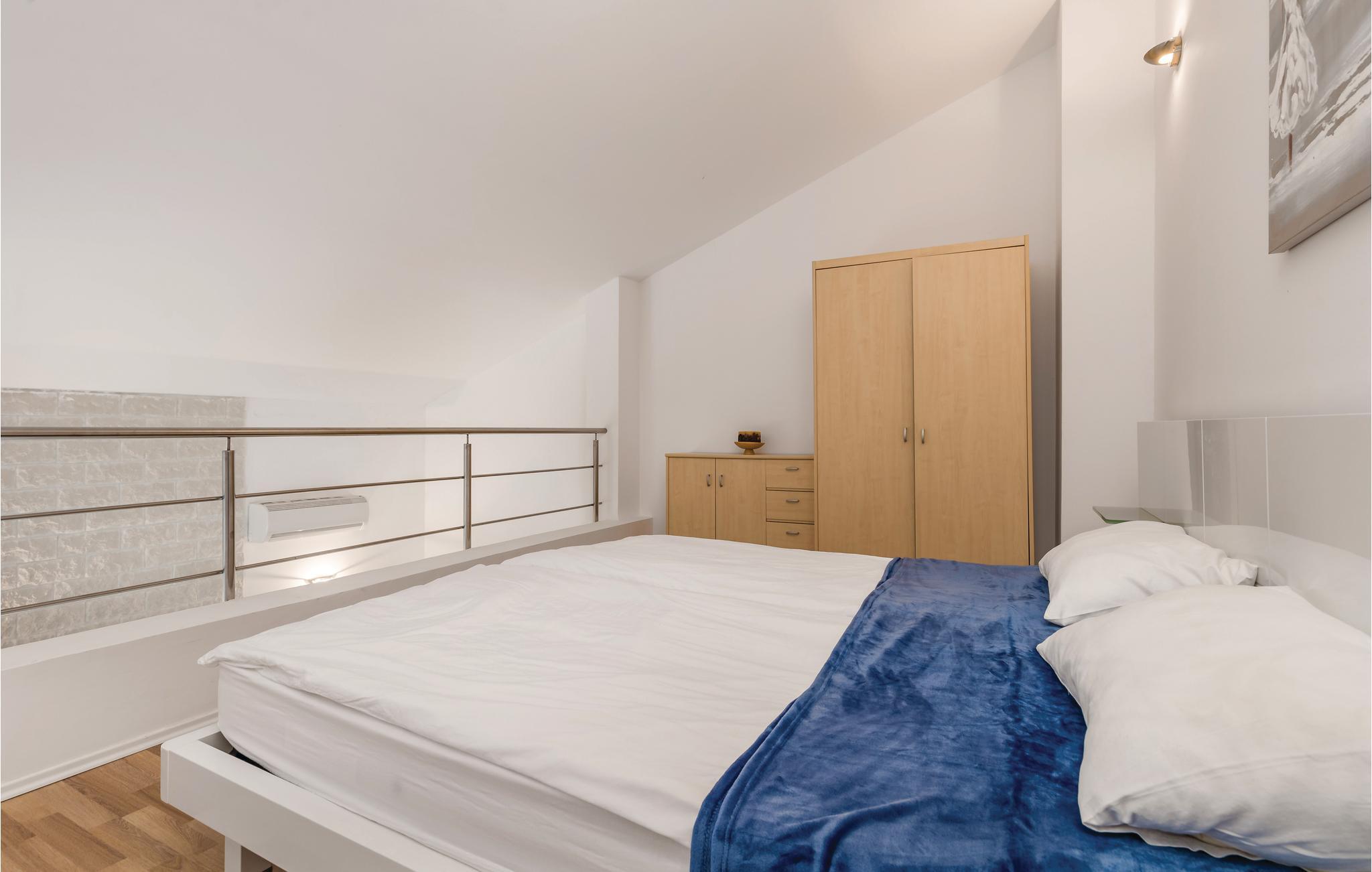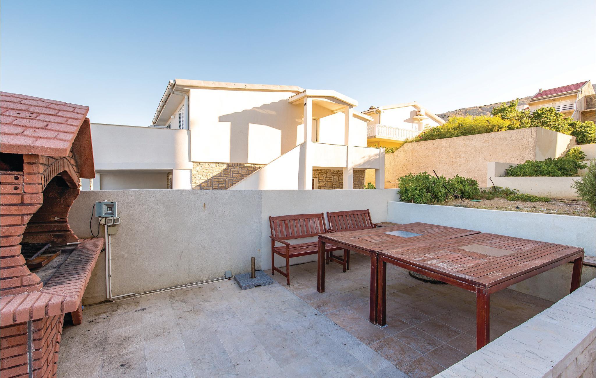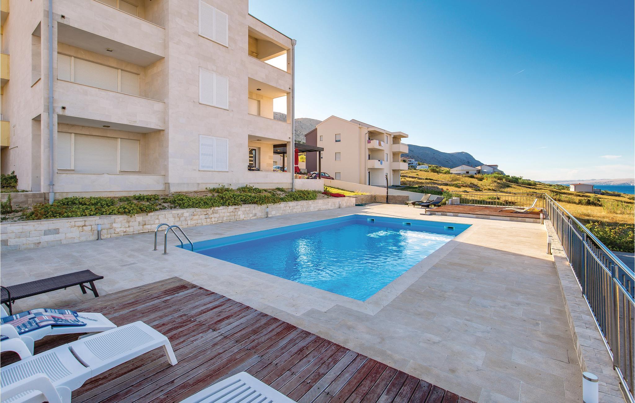 På en af de skønneste kroatiske øer, der er praktisk forbundet til fastlandet med bro, ligger denne ferielejlighed i to plan. Den er moderne indrettet og fra balkonen er der en betagende udsigt over havet. På øverste etage er der et soveværelse med en laveste loftshøjde på 160 cm. Alle beboere i huset har adgang til poolen i haven. Nyd at bo tæt ved havet og besøg den interessante by Pag, med skønne badestrande og et godt udvalg af restauranter at vælge mellem. Se også CKP558.