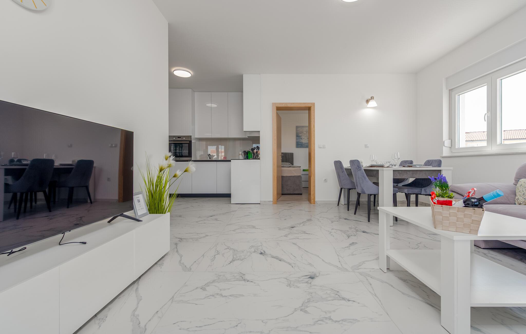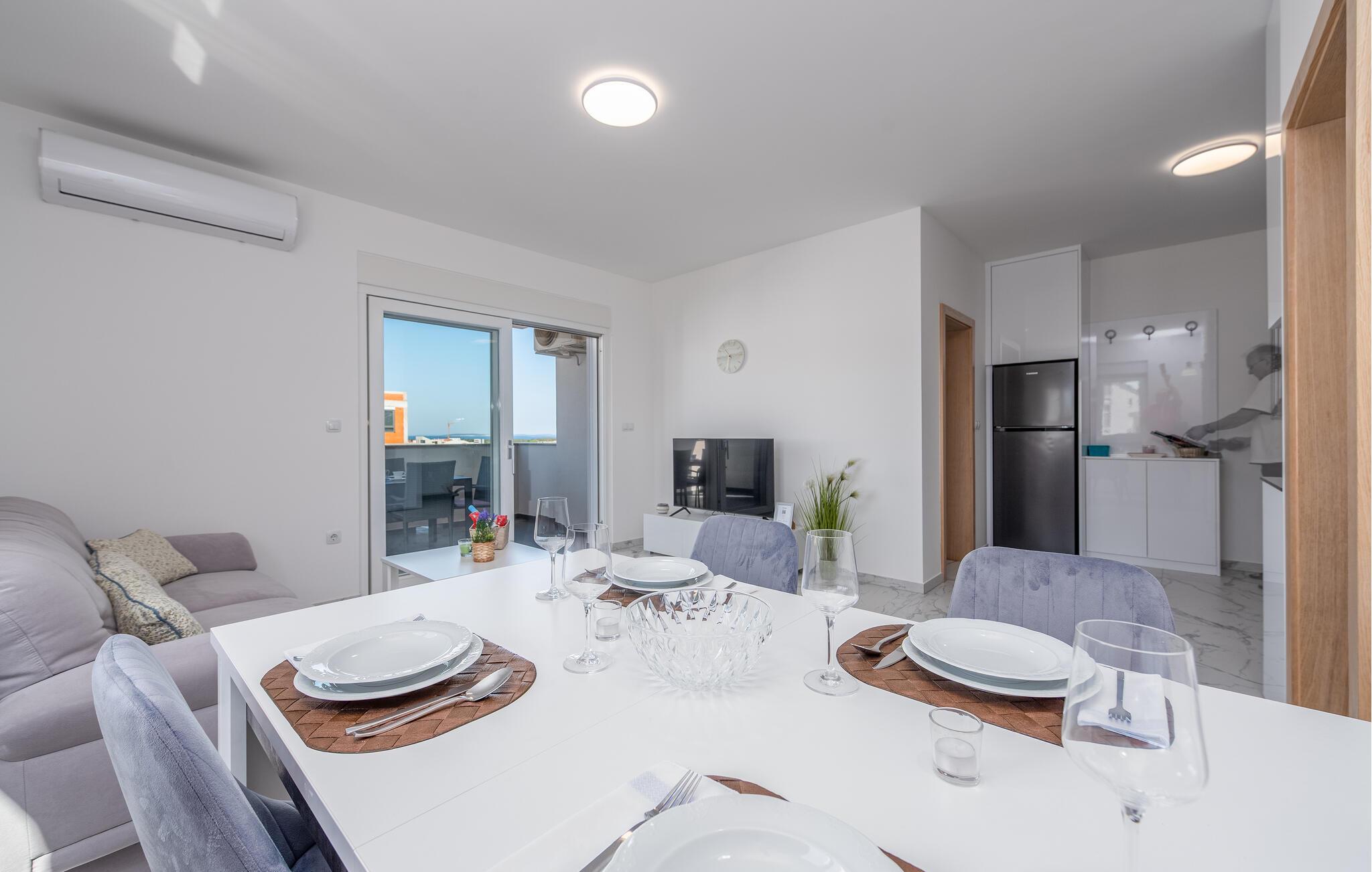 Den moderne møblerede lejlighed byder jer velkommen i ideel beliggenhed tæt på stranden og er perfekt til en ferie med skønne stunder ved vandet. Nyd tiden sammen, og tilbring hyggelige aftener i den indbydende stue på den behagelige sofa, måske med en god film.