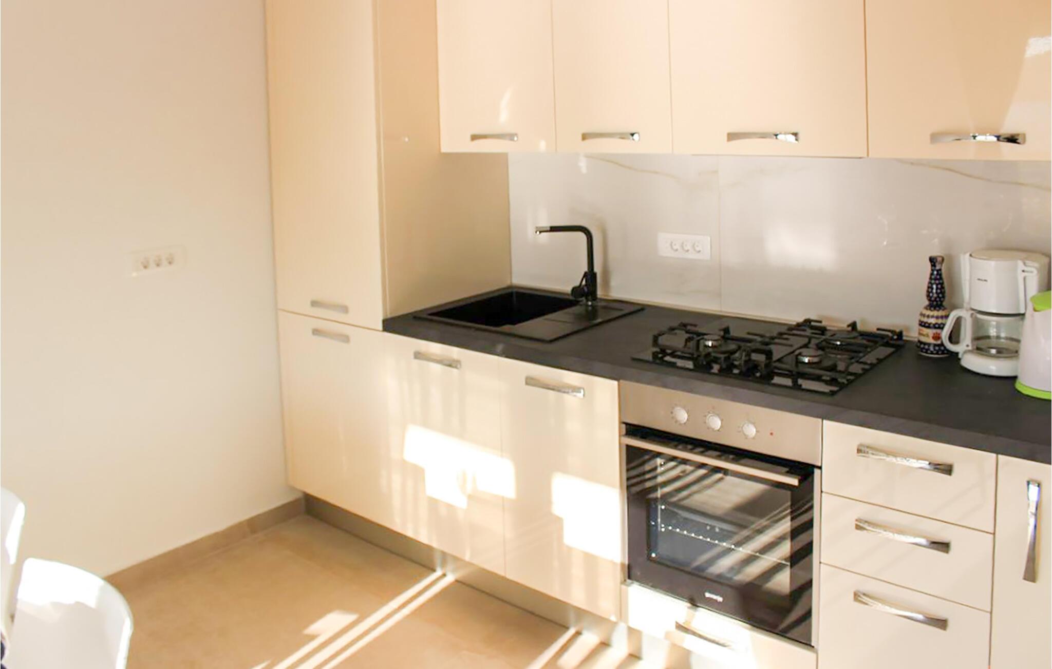 Gå ind i det åbne køkken- og opholdsrum og sæt jer til rette. Brug det funktionelle tekøkken til at tilberede lette måltider og nyde dem ved spisebordet med udsigt udover. Læn jer tilbage i sofaen, der går i ét med opholdsrummet og se tv til en rolig aften.