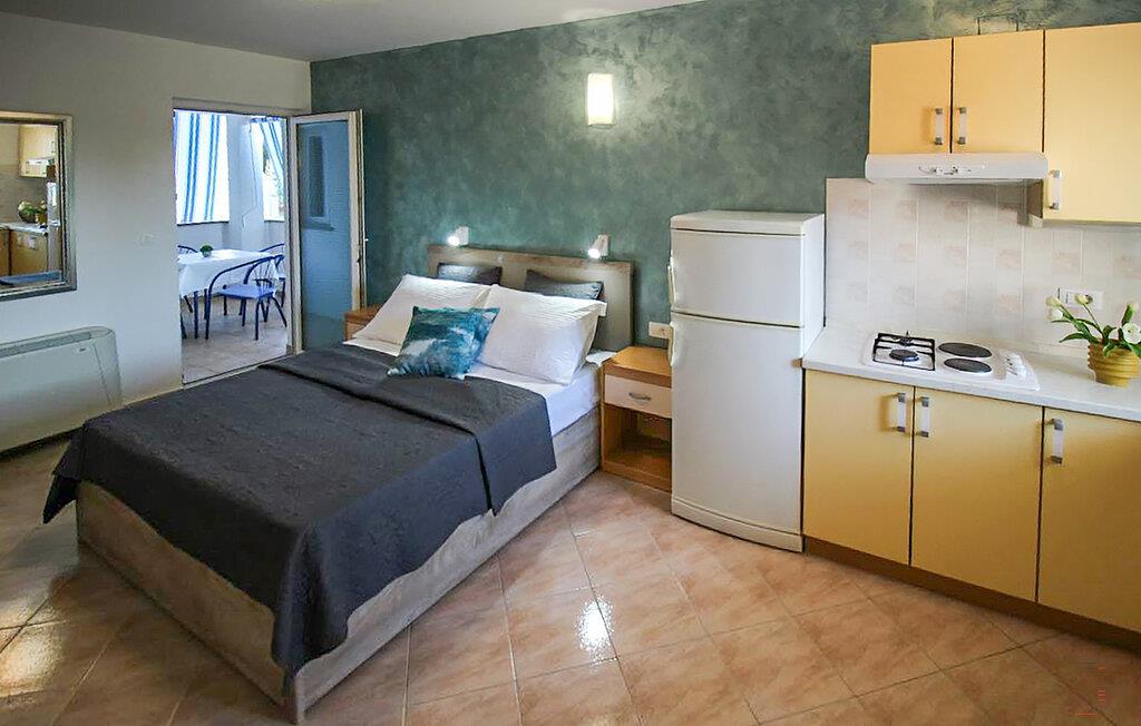 Gå ind i det åbne køkken- og opholdsrum og sæt jer til rette. Brug det funktionelle tekøkken til at tilberede lette måltider og nyde dem ved spisebordet på balkonen. Læn jer tilbage i den komfortable seng, der går i ét med opholdsrummet og se tv til en rolig aften.