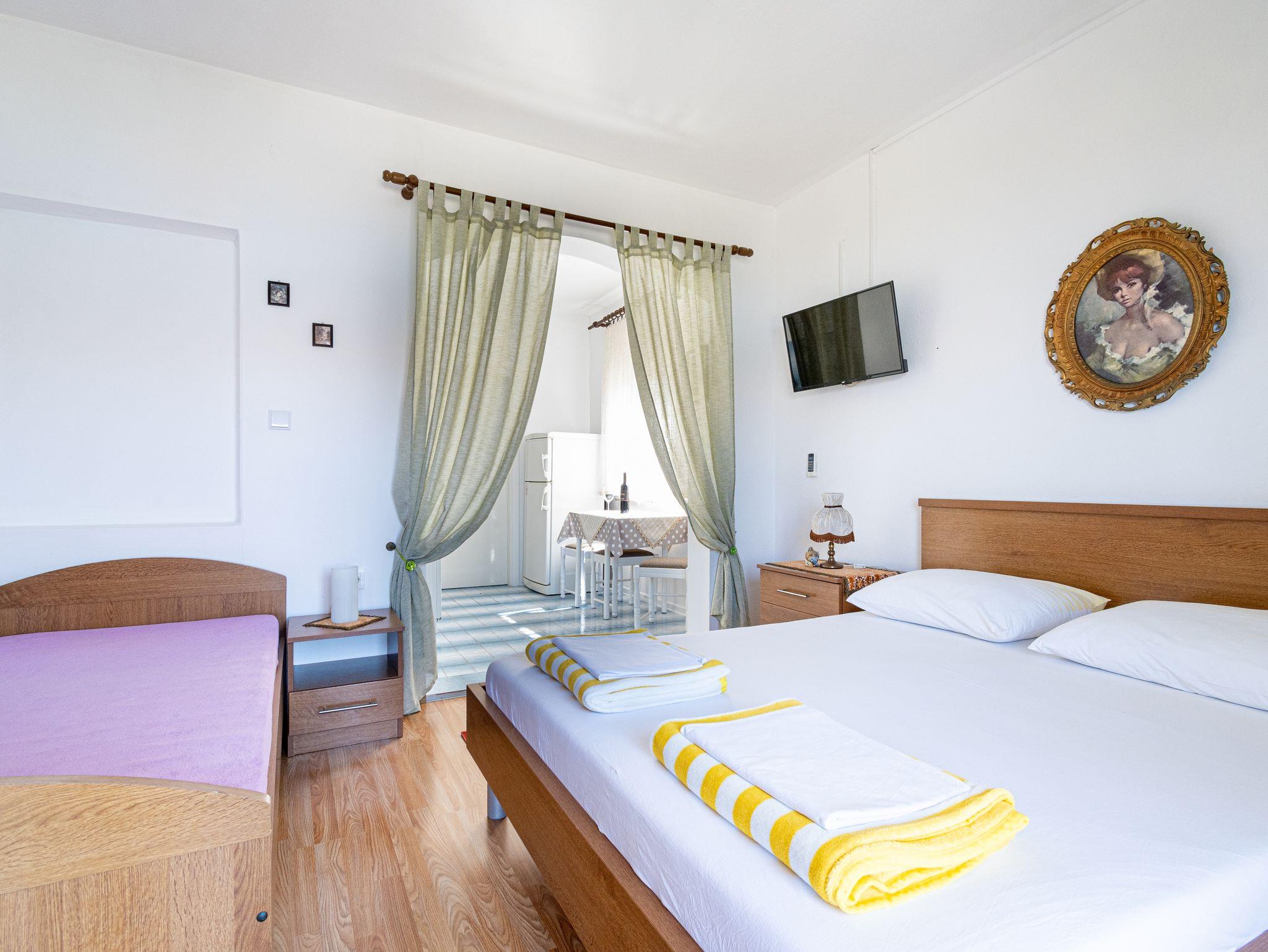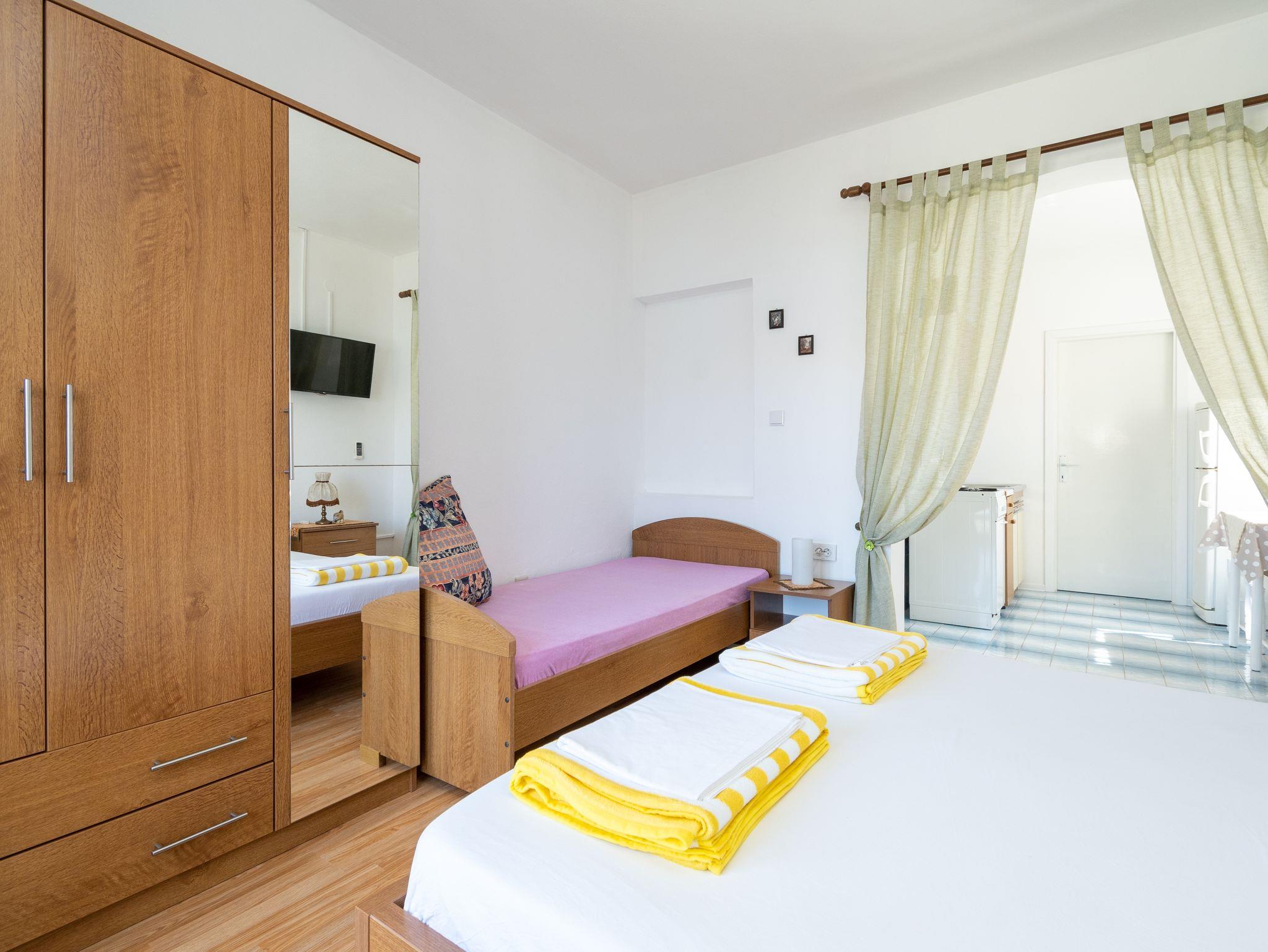 Studio bietet Platz für 3 Gäste. Die Betten sind in Schlafzimmern, die es 1 gibt, innerhalb einer Gesamtfläche von 29m2, angeordnet. Die Gäste haben einen eigenen Balkon zur Verfügung, auf der sie in warmen Sommernächten genießen können. Das Studio-Apartment bietet Meerblick. Es ist erlaubt, Speisen auf dem Gemeinschafts-Grill vorzubereiten. IM PREIS INBEGRIFFEN: Kurtaxe, Endreinigung, Parkplatz, Internet, Kinderbett. VERBINDLICHE ZUSÄTZLICHE KOSTEN: Aufzahlung für Kurzaufenthalte (prozentualer Zuschlag pro Nächtigungsanzahl: 30% - 1, 20% - 2, 10% - 3). UNVERBINDLICHE ZUSÄTZLICHE KOSTEN: Klimatisierung (7,00 € pro Nacht), Bootsanlegeplatz (10,00 € pro Nacht). Die Verfügbarkeit zusätzlicher Dienstleistungen in Ihrem reservierten Termin und die Preise derselben (falls nicht aufgeführt) müssen im Voraus überprüft werden. Zusätzliche Dienstleistungen die in der Zahlungsaufforderung nicht aufgeführt sind werden direkt beim Vermieter bezahlt, angenommen der Gast nutzt auch diese.