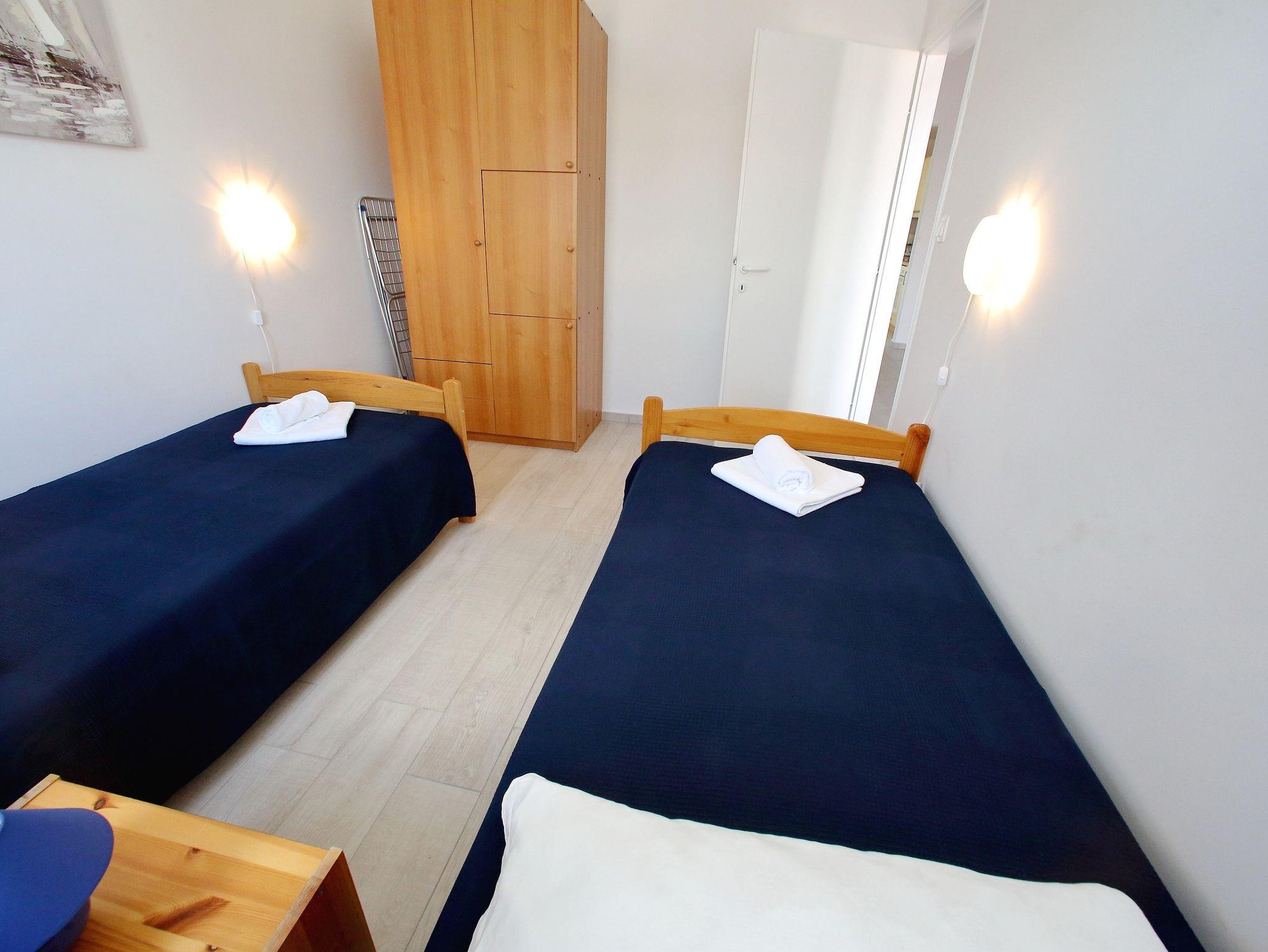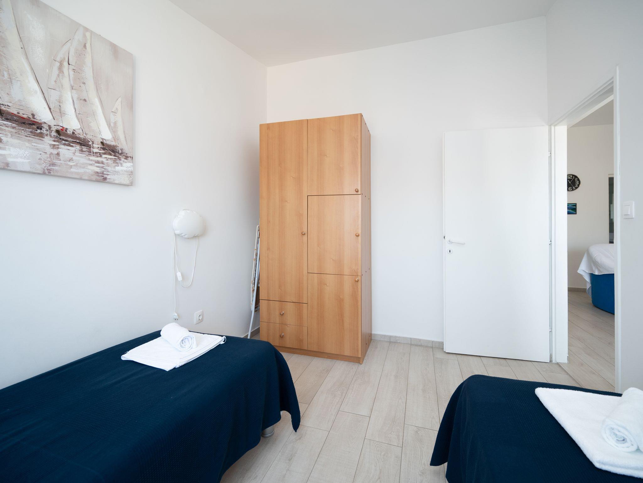Ferienwohnung bietet Platz für 4 Gäste. Die Betten sind in Schlafzimmern, die es 2 gibt, innerhalb einer Gesamtfläche von 44m2, angeordnet. Die Gäste haben eine eigene Terrasse zur Verfügung, auf der sie in warmen Sommernächten genießen können. Das Apartment bietet Meerblick. Es ist erlaubt, Speisen auf dem Gemeinschafts-Grill vorzubereiten. IM PREIS INBEGRIFFEN: Kurtaxe, Endreinigung, Klimatisierung, Parkplatz, Internet, Bügeleisen, Bügelbrett, Föhn. VERBINDLICHE ZUSÄTZLICHE KOSTEN: Aufzahlung für Kurzaufenthalte (prozentualer Zuschlag pro Nächtigungsanzahl: 30% - 1, 20% - 2, 10% - 3). Die Verfügbarkeit zusätzlicher Dienstleistungen in Ihrem reservierten Termin und die Preise derselben (falls nicht aufgeführt) müssen im Voraus überprüft werden. Zusätzliche Dienstleistungen die in der Zahlungsaufforderung nicht aufgeführt sind werden direkt beim Vermieter bezahlt, angenommen der Gast nutzt auch diese. Ermäßigung auf den Grundpreis: Gratistag 14=13 (bei einem Aufenthalt von 14 Tagen oder mehr erhalten Sie einen Gratistag für den Aufenthalt bis 31.12.26).