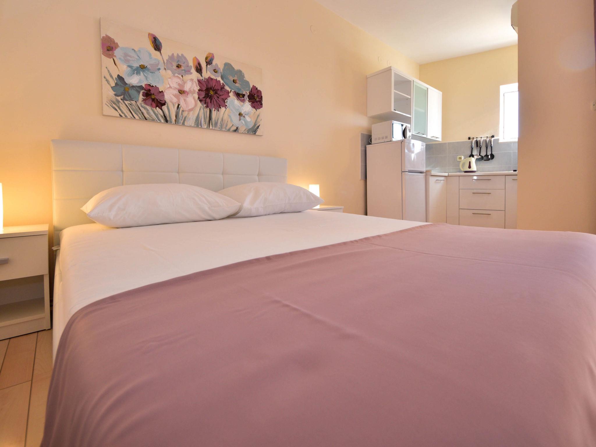 1-room apartment 27 m2, on the upper ground floor. 1 room with 1 sofabed and 1 double bed (2 x 90 cm, length 200 cm), dining table, satellite TV and air conditioning. Exit to the terrace. Kitchenette (2 hot plates). Shower/WC. No heating option. Terrace 4 m2, roofed, south facing position. Terrace furniture. Beautiful view of the sea and the countryside. Facilities: iron, hair dryer. Internet (WiFi, free).