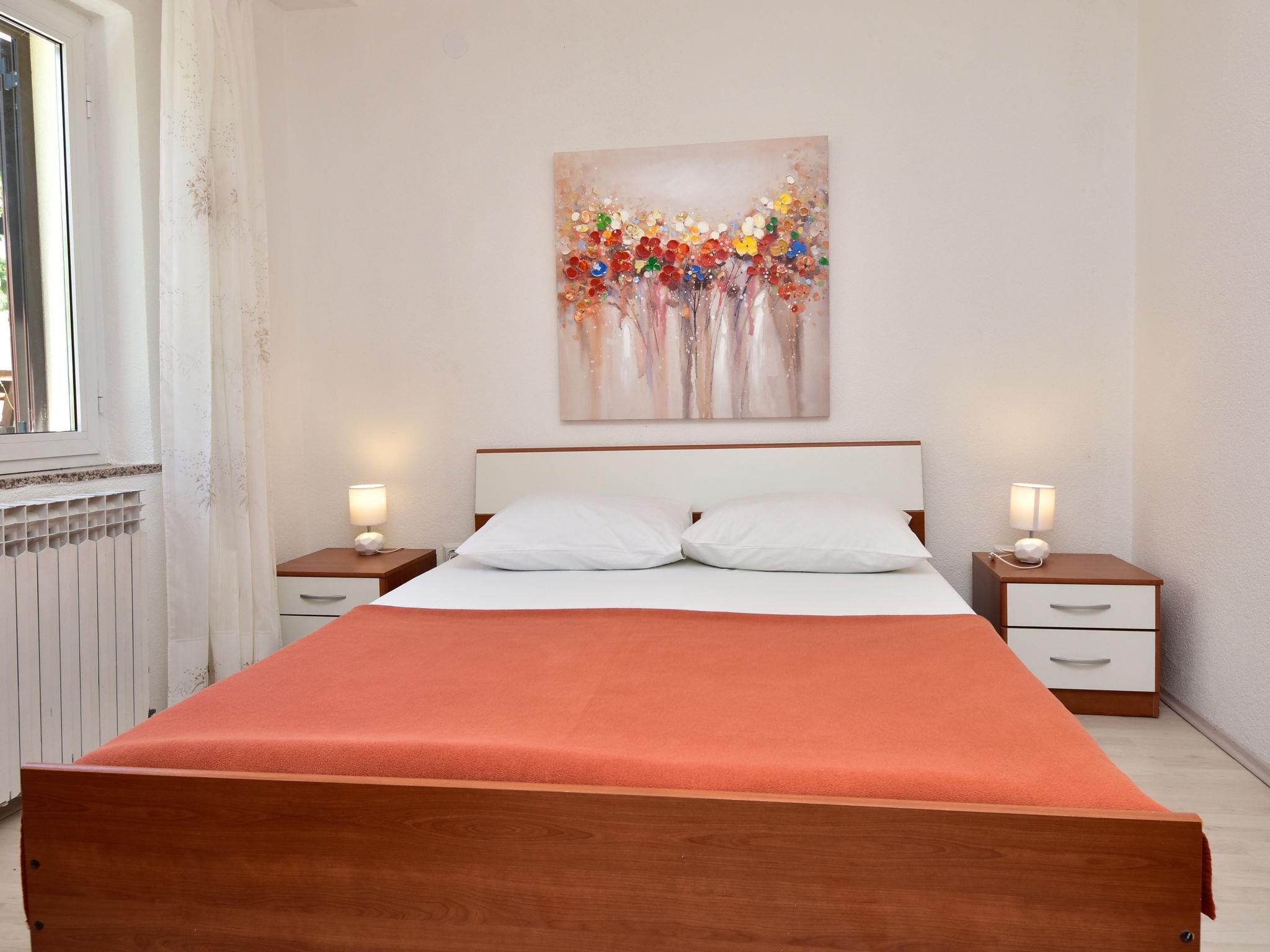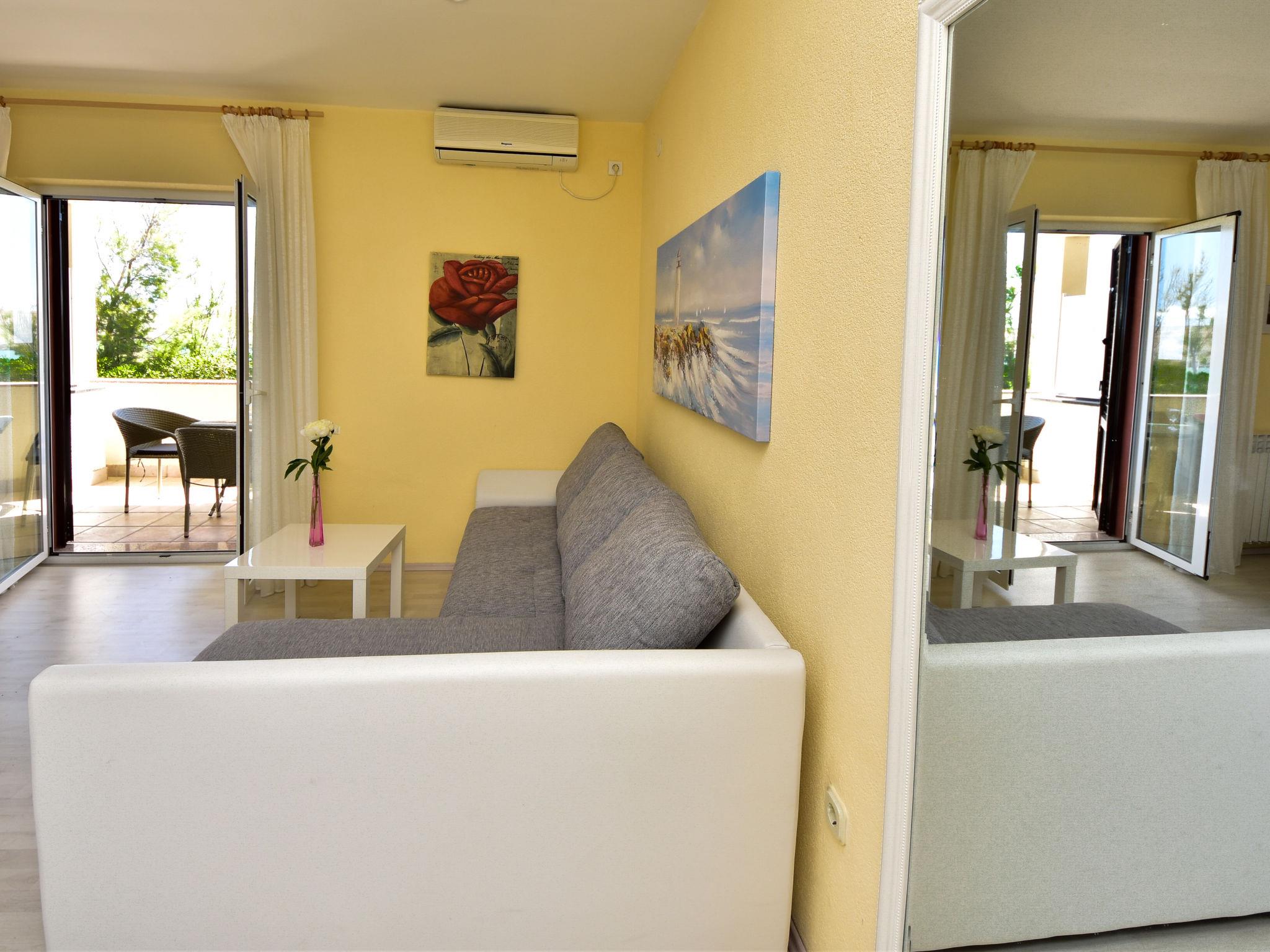 2-room apartment 46 m2, on the upper ground floor, south-west facing position. Living/dining room 20 m2 with 1 double sofabed, satellite TV and air conditioning. Exit to the terrace. 1 room with 1 double bed (2 x 90 cm, length 200 cm). Open kitchen (2 hot plates, dishwasher, microwave). Bath/WC. No heating option. Terrace 11 m2. Terrace furniture. Partial view of the sea and the swimming pool. Facilities: iron, hair dryer. Internet (WiFi, free).