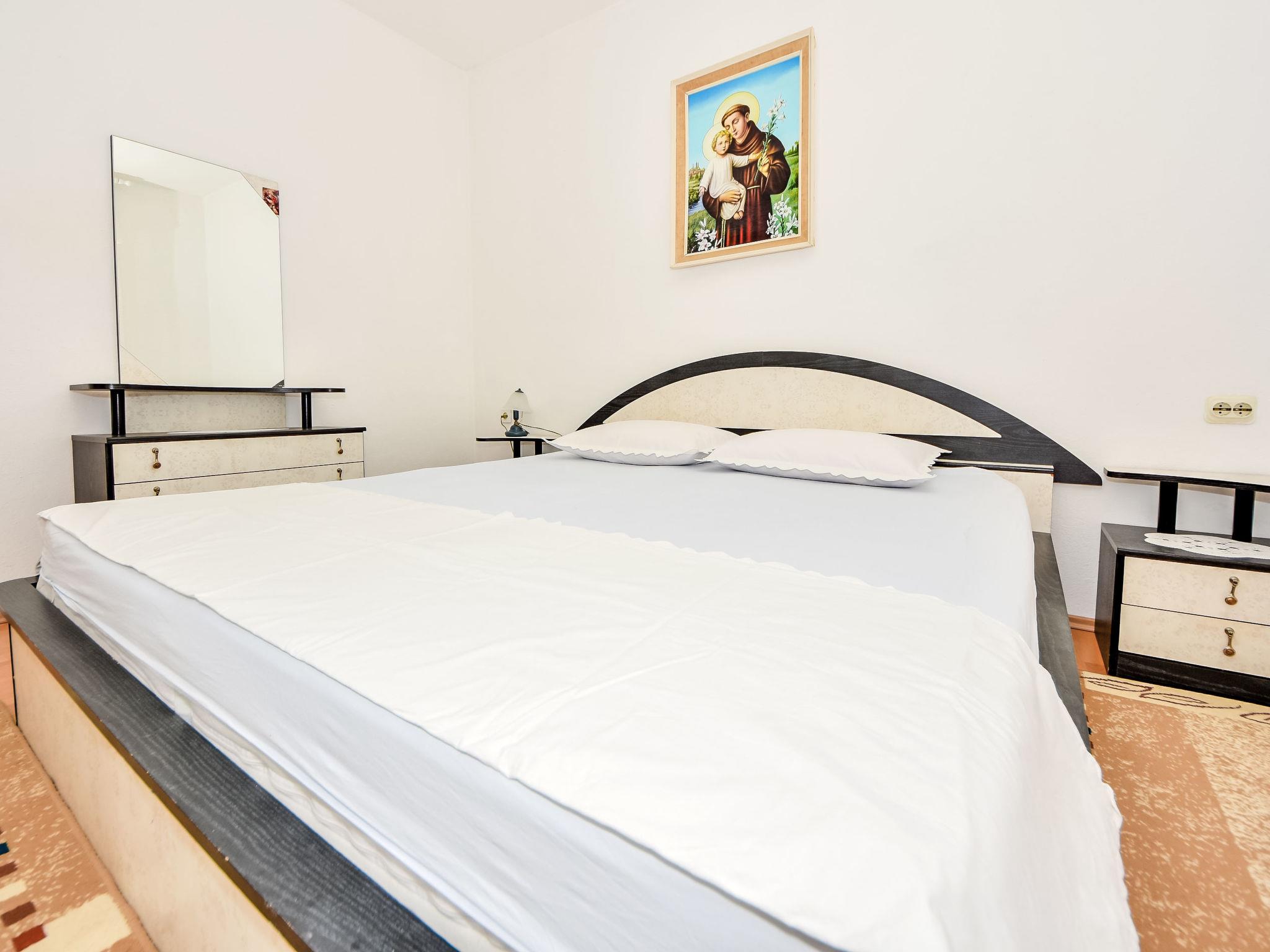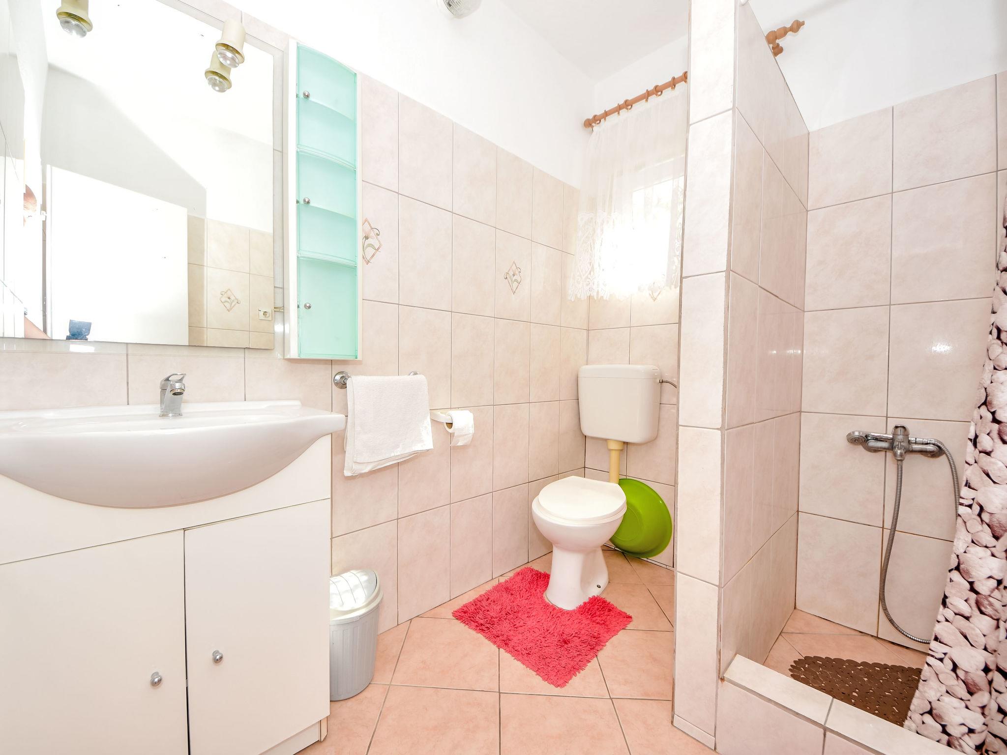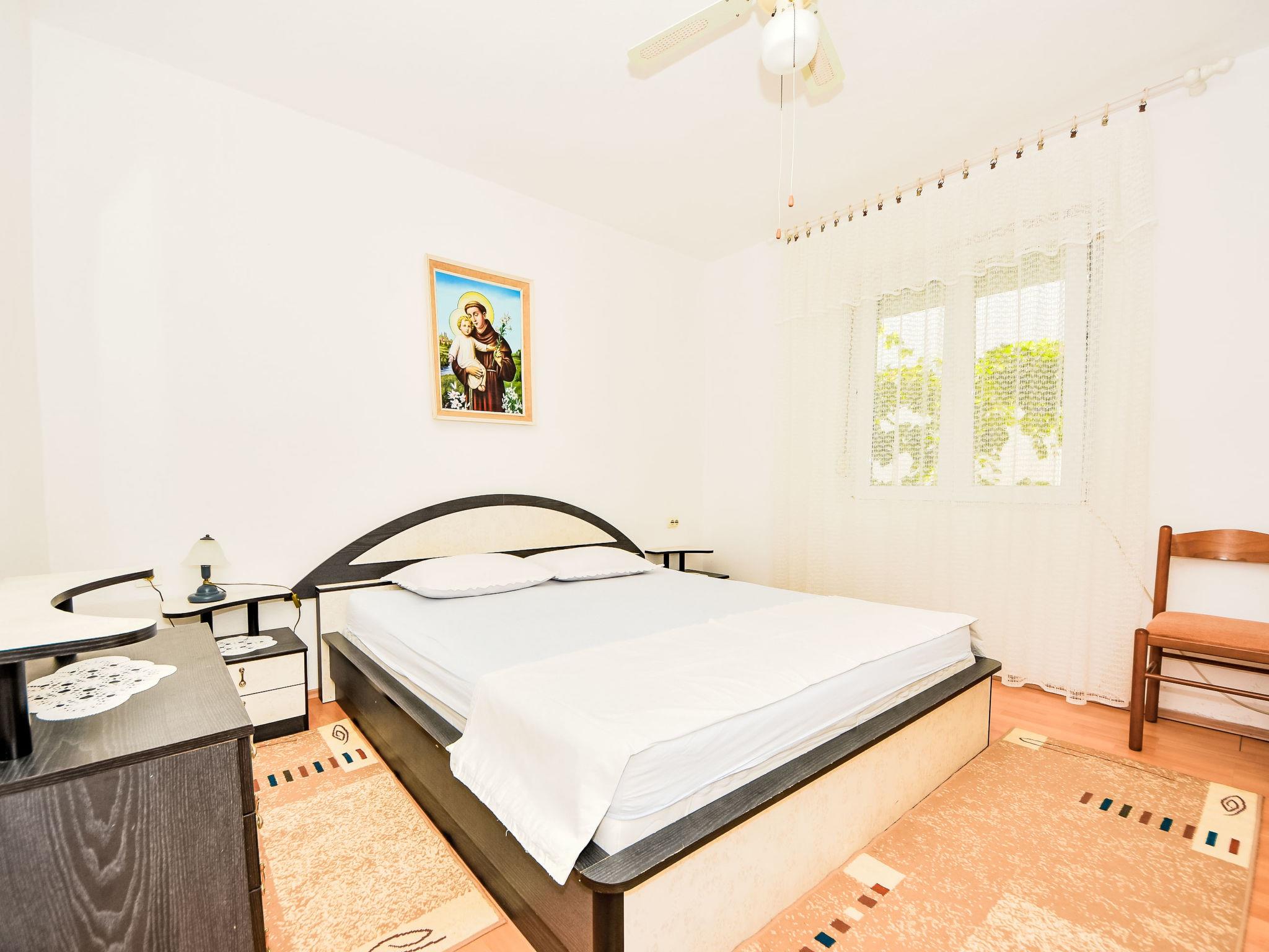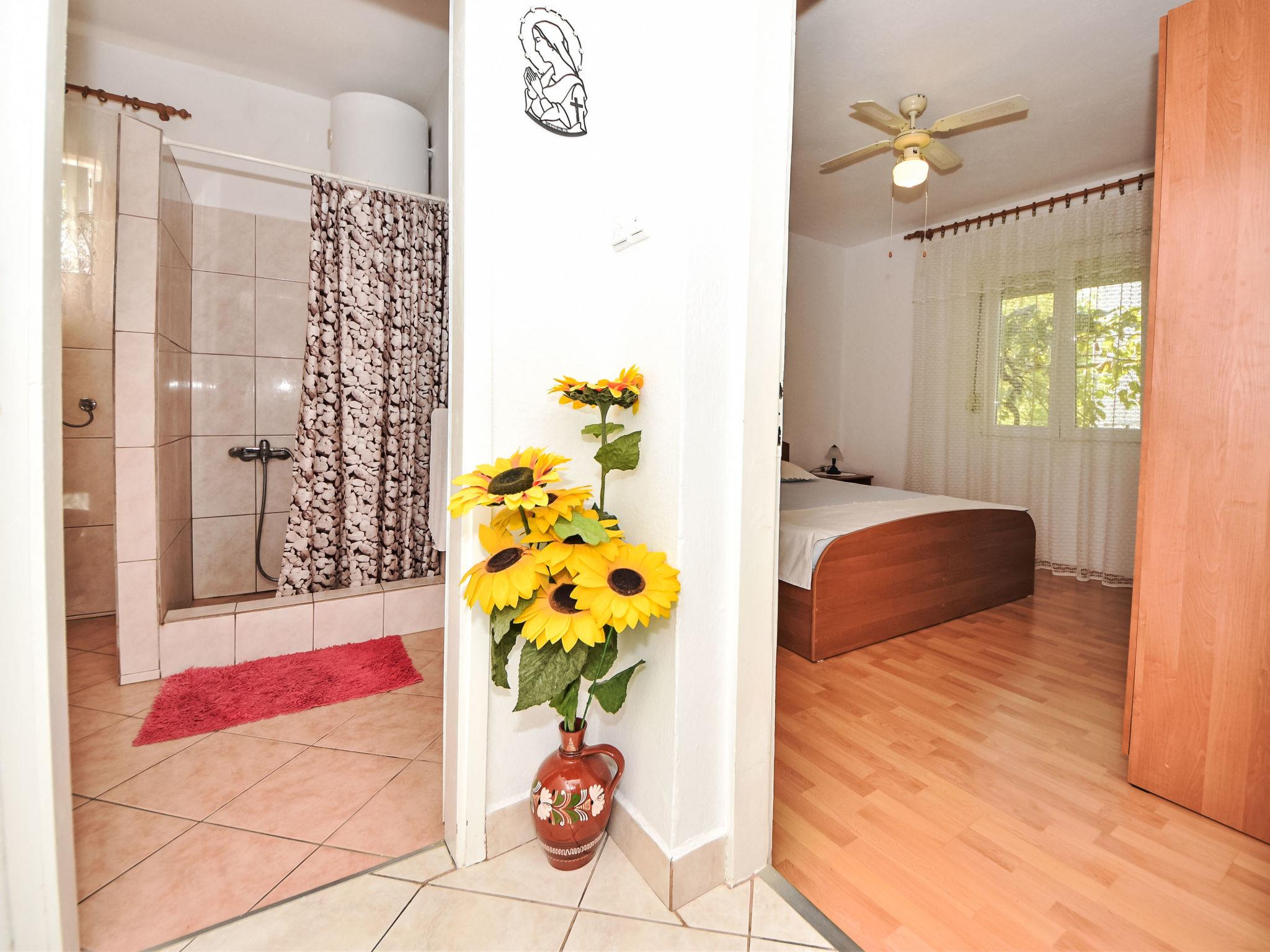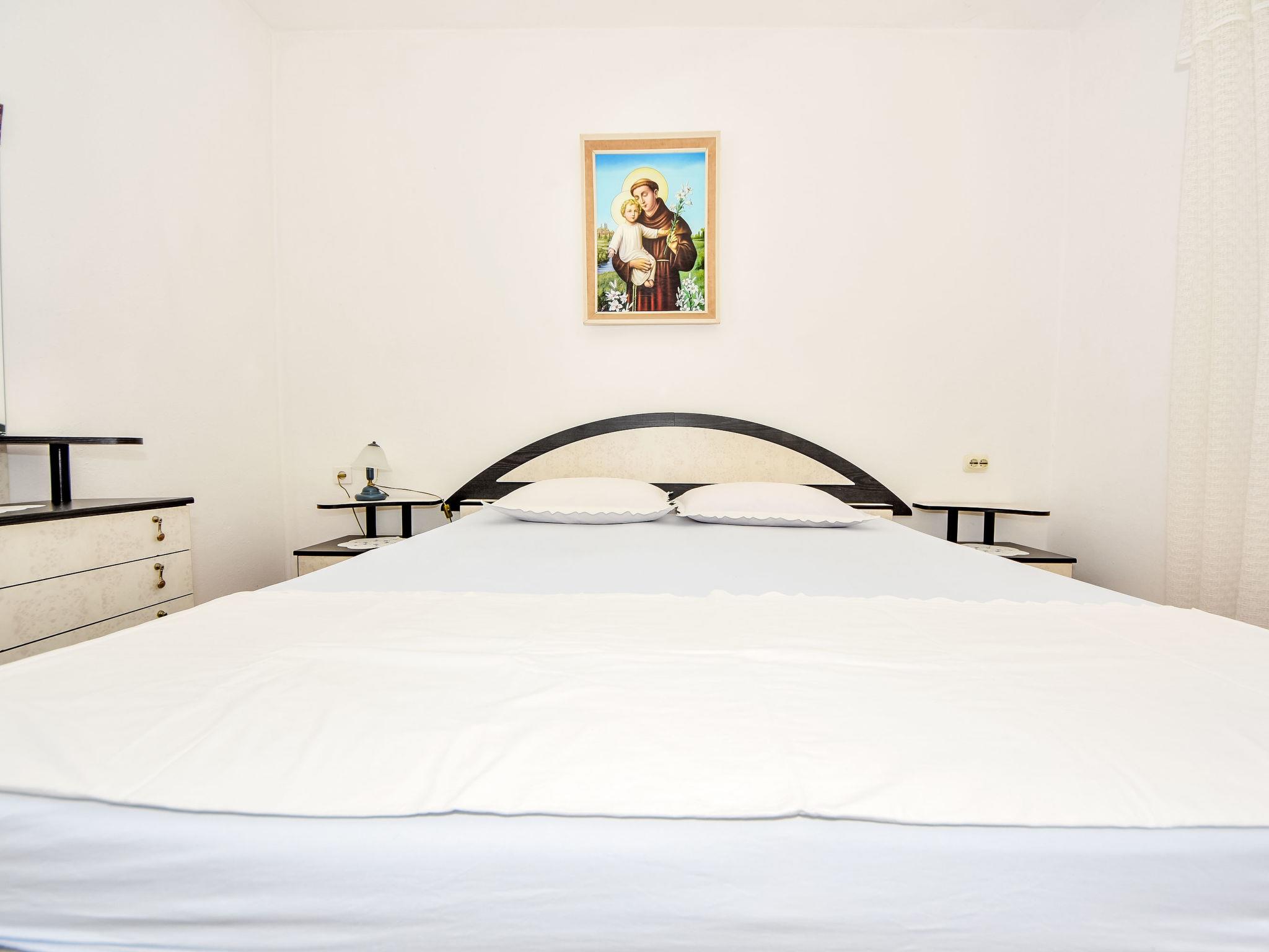 2-room apartment 50 m2, on the ground floor, south-west facing position. Entrance hall with air conditioning. Exit to the terrace. 1 room with 1 double bed (2 x 90 cm, length 200 cm), fan. 1 room with 1 double bed (2 x 90 cm, length 200 cm), fan. Dining room with satellite TV (flat screen). Open kitchen (4 hot plates, oven, freezer). Shower/WC. Air-conditioning (extra). Terrace 14 m2, roofed. Facilities: Internet (WiFi, free).