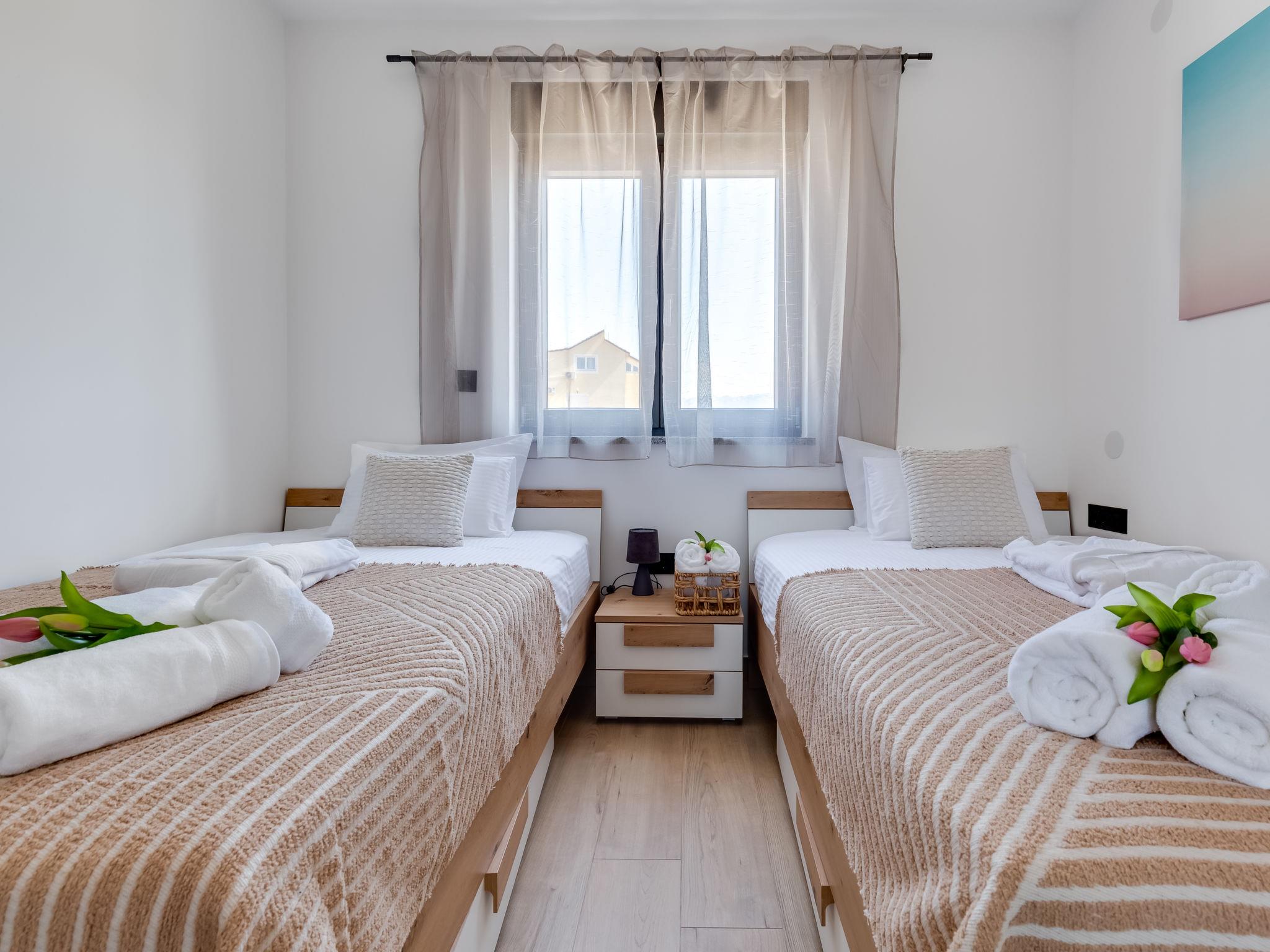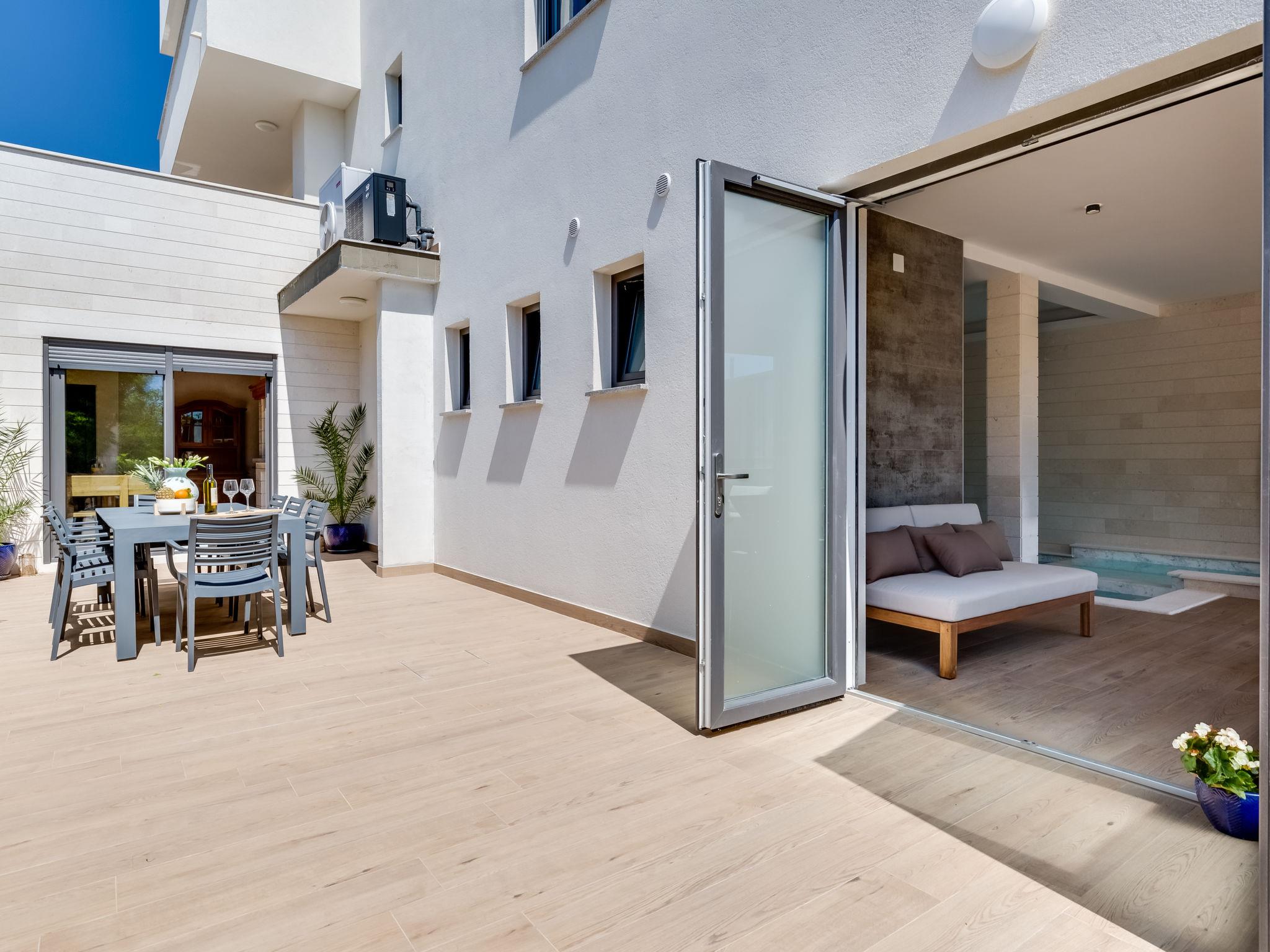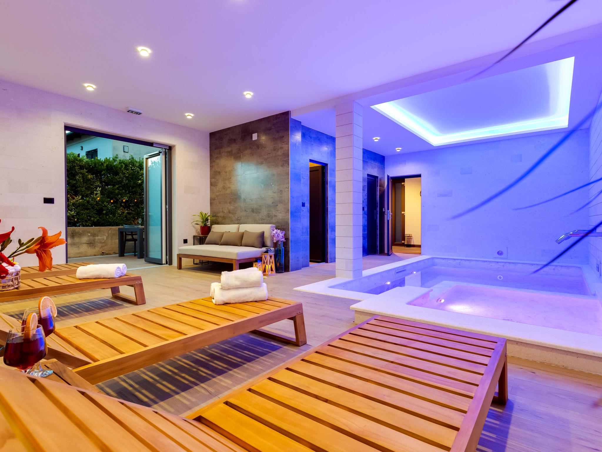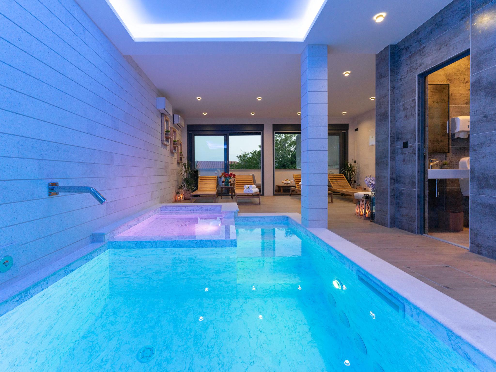 Single-family house "Luxury Villa Terra Maiorum", built in 2024. 100 m from the centre of Povljana, 13 km from the centre of Pag, in a sunny position, 1 km from the sea, 1 km from the beach. Private: property 500 m2, indoor pool heated (17 m2, depth 140 cm, seasonal availability: 01.Jan. - 31.Dec.) with internal staircase. WC in the pool area, paddling pool, garden furniture, barbecue house. In the house: internet access, washing machine. Parking (for 5 cars). Shop 80 m, restaurant 500 m, bakery 170 m, bus stop 14.5 km, sandy beach 1 km pebble beach 1.2 km. Please note: airfield 60 km from the property. The house consists of 3 apartments rented as one unit. Two apartments on the first floor and one apartment on the second floor.