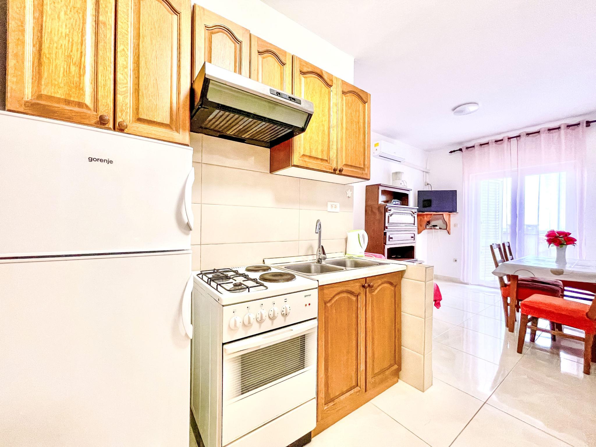 3-room apartment 50 m2 on 2nd floor, south-west facing position. Living/dining room 25 m2 with satellite TV and air conditioning. 1 room with 1 french bed (168 cm, length 200 cm). 1 room with 1 french bed (160 cm, length 200 cm). Open kitchen (2 hot plates, oven, Gas stove, 2 gas rings, kettle, freezer). Shower/WC. No heating option. Terrace 6 m2. Terrace furniture. Distant view of the sea. Facilities: Internet (WiFi, free).