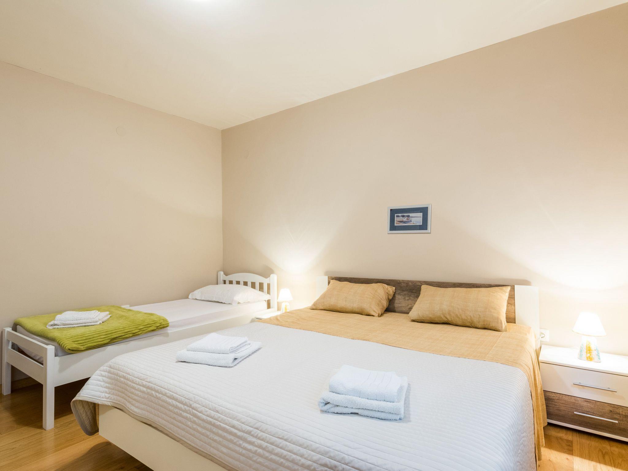 This stylishly decorated ground-floor apartment of around 100m² exudes a sense of well-being. The apartment is accessed from the terrace and you step straight into the living and dining room. This receives plenty of daylight, owing to the large windows. Make yourself comfortable on the sofa (which can also be used as a sofa bed, 160x200, for two people). There is a flatscreen TV with satellite channels in the living room. The air conditioning unit in the living room is powerful enough to cool the other rooms too. The kitchen with an oven, hob and dining table is integrated into the living room. The spacious bathroom has a large bath and high-quality tiles. The two bedrooms each have a double bed (180cm wide) and a single bed (90cm wide).