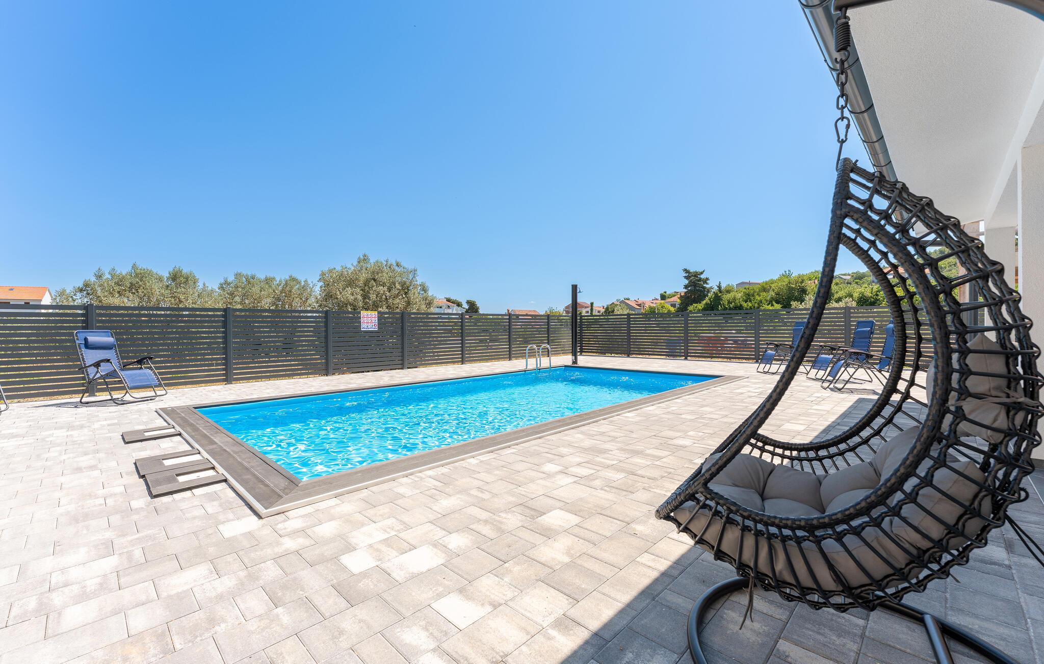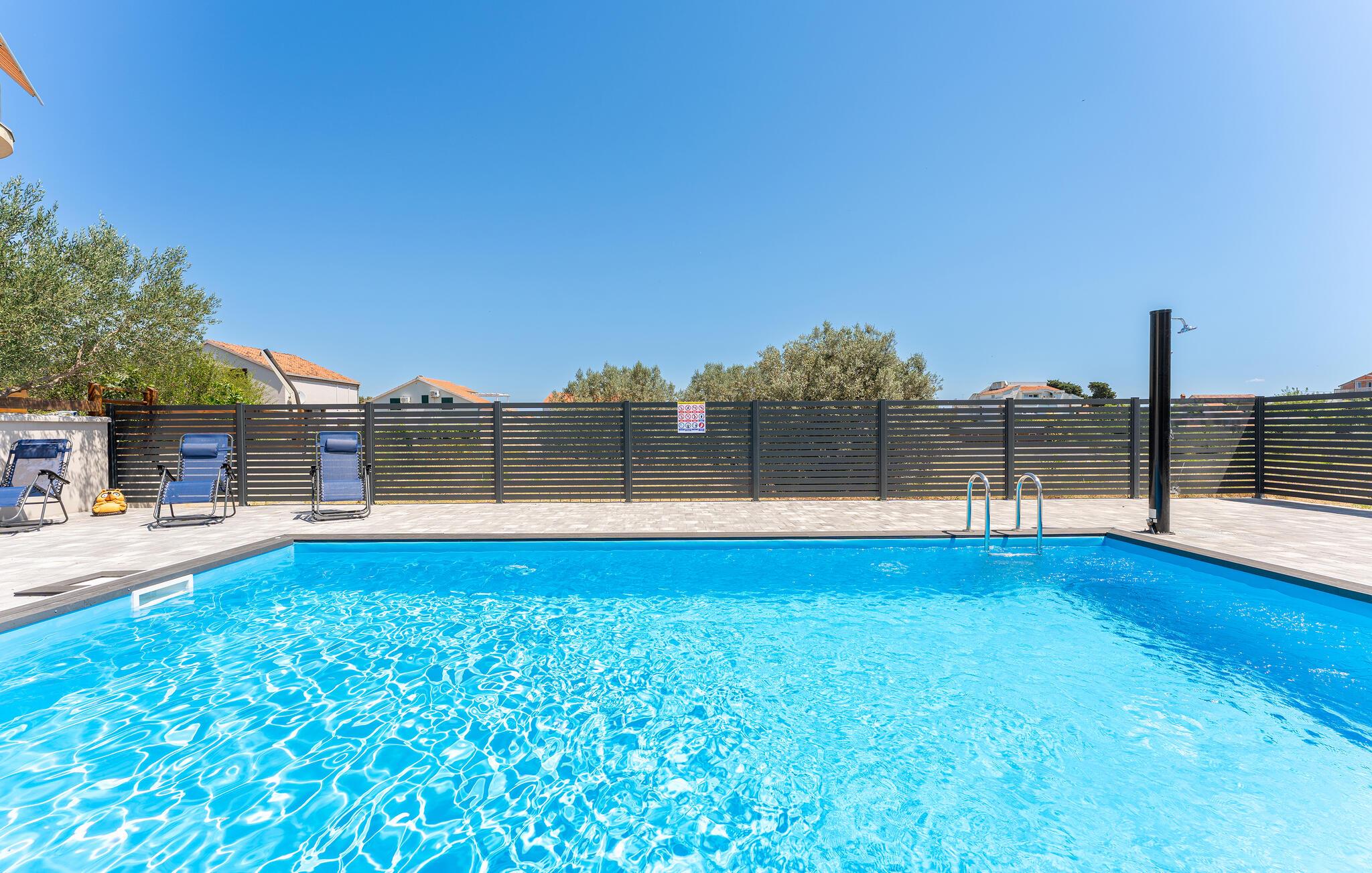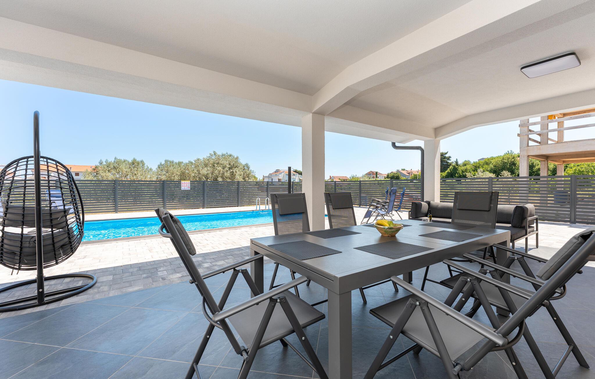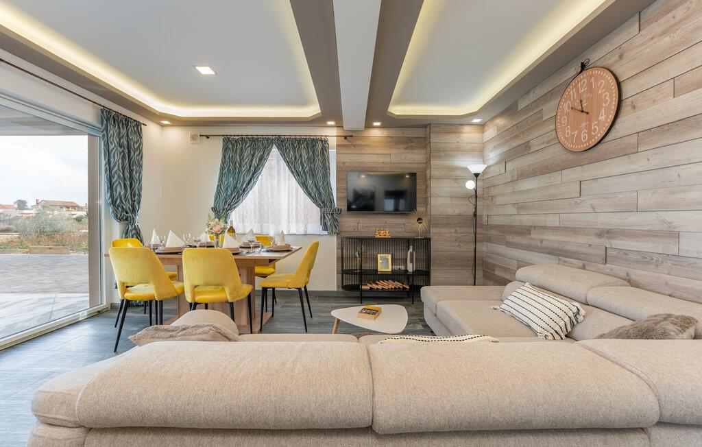 Nyd en uforglemmelig ferie i dette komfortable feriehus med pool og havudsigt. Dette moderne hus tilbyder de ideelle rammer for en afslappende pause fra hverdagen. Slap af og lad batterierne op, omgivet af komfort og en beroligende atmosfære. Det rolige design med et moderne trælook og diskrete farver er behageligt oplivet af friske, solrige accenter. Slap af i den store sofa med en god samtale, lyt til jeres yndlingspodcast, eller forkæl familien med et hjemmelavet måltid. Gå ud på terrassen om morgenen med en kop kaffe og nyd havudsigten. Forfrisk jer selv med en dukkert i poolen eller et spil vandpolo, før I slapper af på liggestolene med en kølig drink. Saml jer til en hyggelig grillaften og afslut dagen med en flaske kroatisk vin. Stranden ligger kun et stenkast væk og inviterer jer til at svømme, snorkle eller slappe af i det krystalklare vand. Oplev middelhavslandskabet omkring Banj på en vandretur med havudsigt eller en cykeltur gennem olivenlunde. Prøv friskfanget fisk og dalmatiske specialiteter i de hyggelige taverner ved vandet. Tag en dagstur til fastlandet eller naboøen Ugljan og oplev de kroatiske øers mangfoldighed.