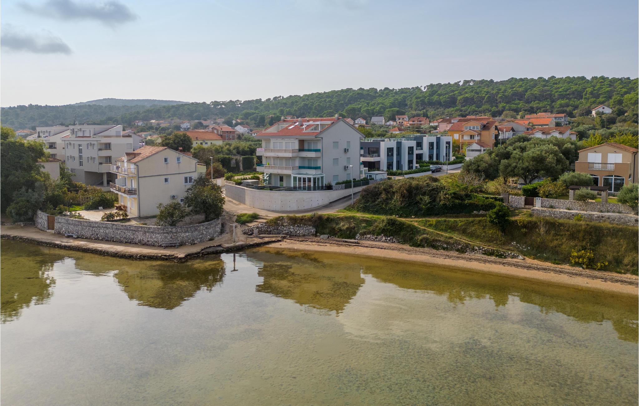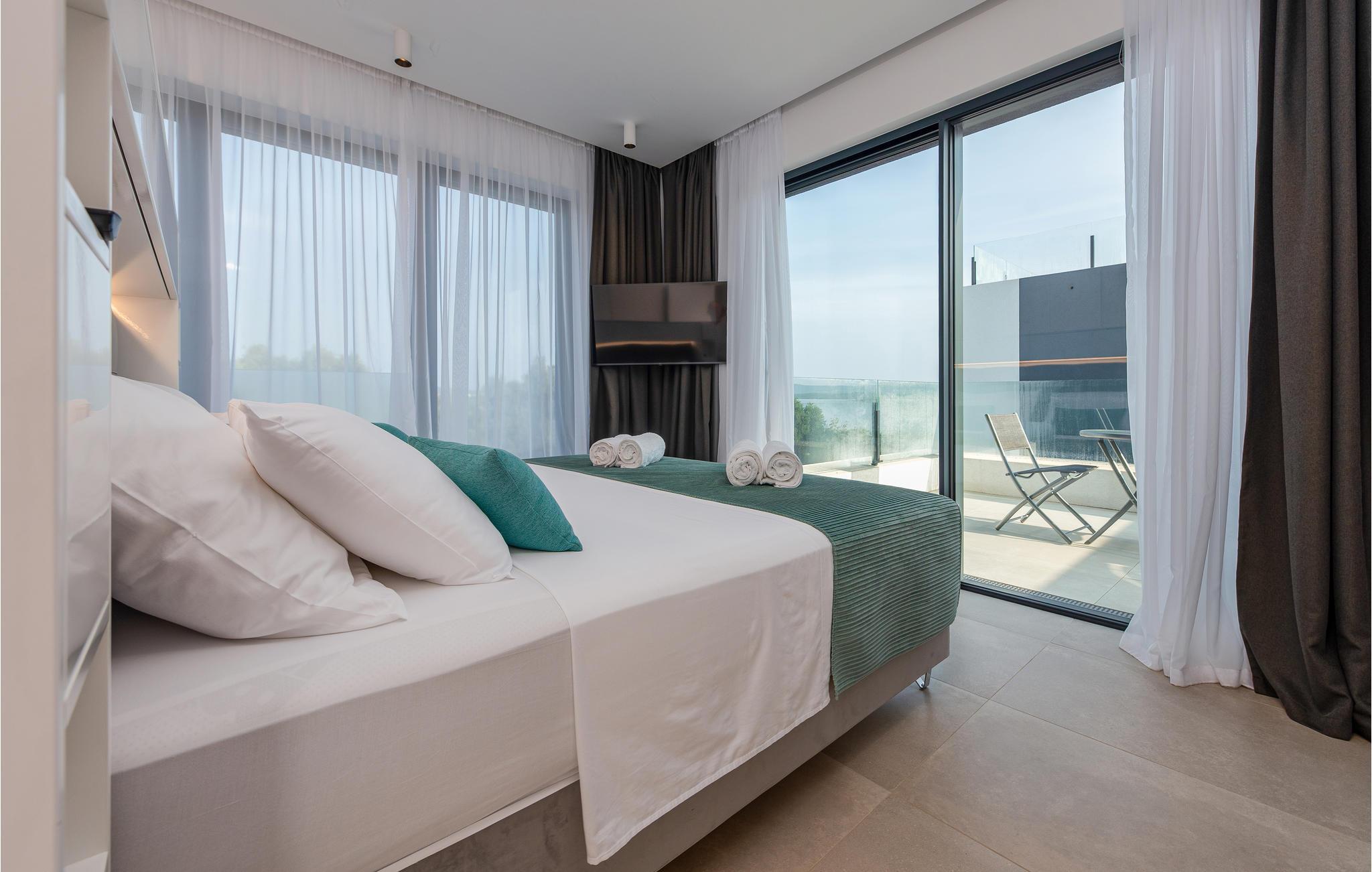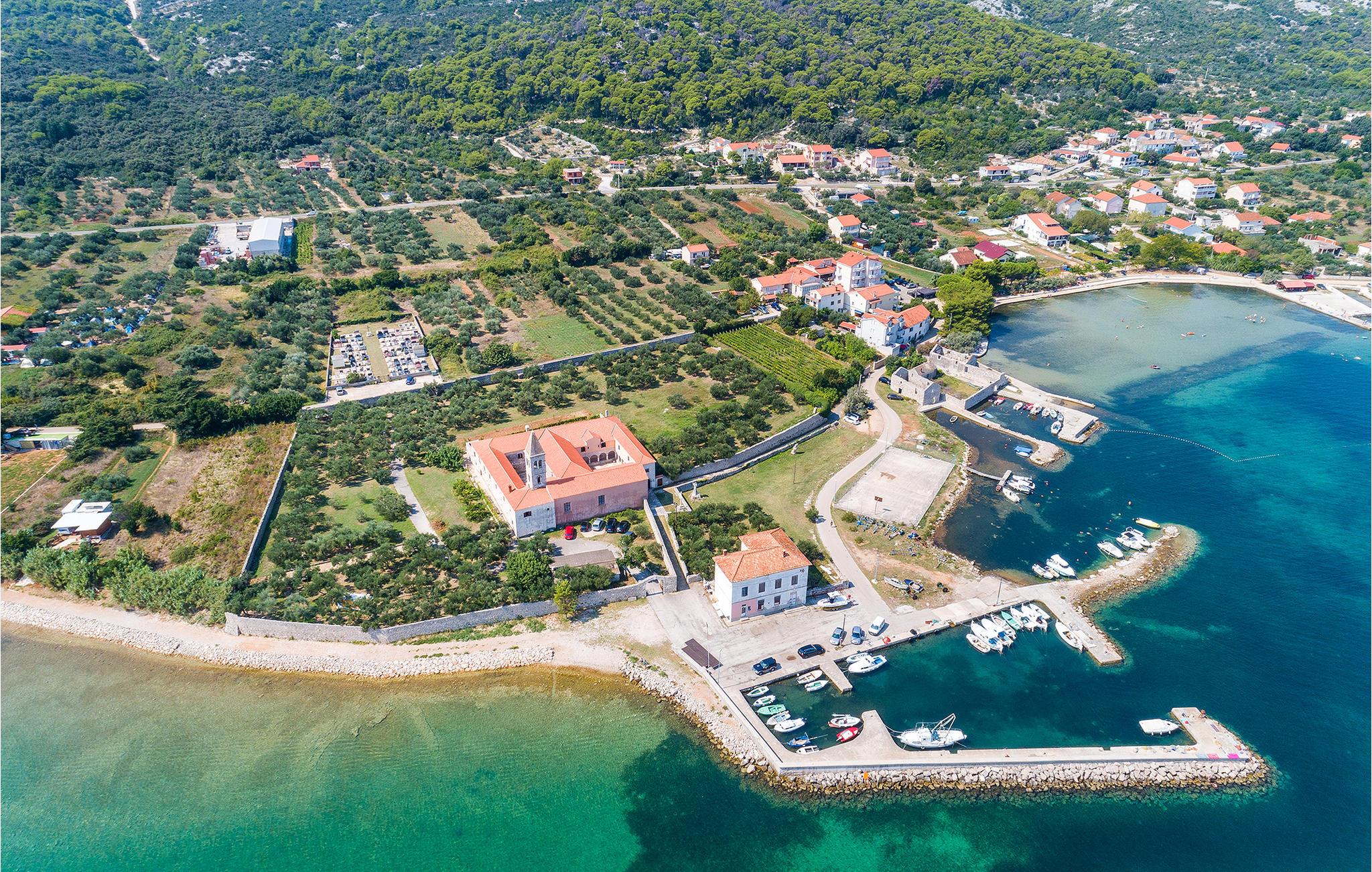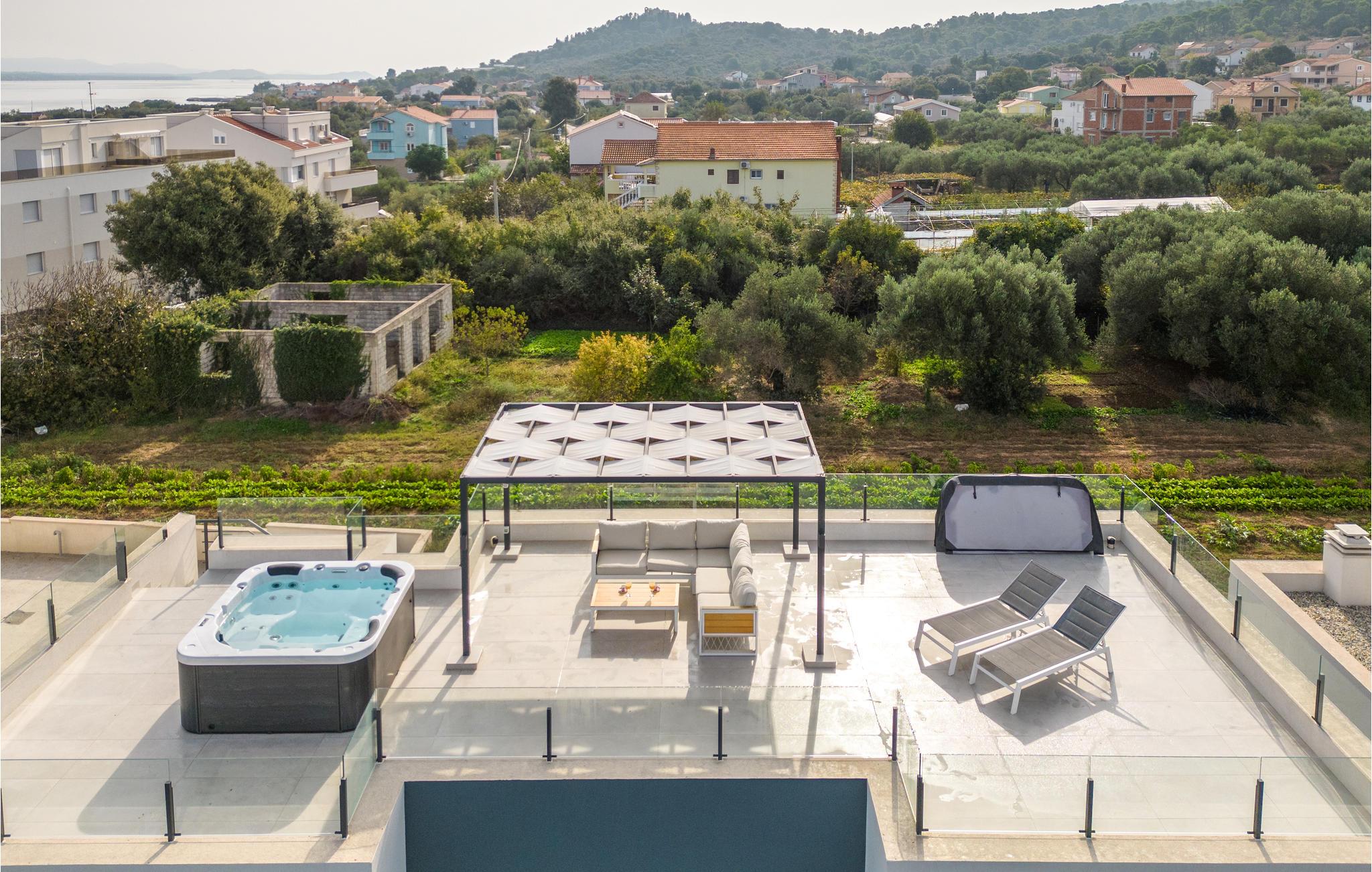 Dette moderne og rummelige feriehus med pool og jacuzzi ligger på øen Pasman, ikke langt fra stranden. Tilbring en uforglemmelig ferie i dette store og komfortable feriehus sammen med din udvidede familie eller par, du er venner med. Drømme går i opfyldelse her, for du kan fuldt ud nyde den højkvalitets indretning, den indbydende atmosfære og mange værelser og nyde socialt samvær og privatliv. Ikke alene har du det store opholdsrum til din rådighed, men hvis du træder udenfor, har du en smuk swimmingpool til din rådighed. Om aftenen kan I tilberede jeres yndlingsretter i udekøkkenet og spise dem sammen. Der er endnu et højdepunkt på taget, da en skøn tagterrasse strækker sig over hele gulvets areal, hvor I kan slappe af sammen i jacuzzien og havemøblerne og se ud over havet. Om natten kan du beundre den magiske himmel med dens stjerner. Rejser du med en stor familie eller med flere familier, der er venner, kan nabohuset også lejes. Grib din strandtaske og gå de få meter til stranden, som er en blanding af sand, beton og småsten. Dyk ned i det krystalklare vand og spil derefter beachvolley på stranden eller se dine børn lege på legepladsen. Pašman er synonymt med landskabets vilde skønhed, bugter og undervandsverden. Vandretur til Veliki Bokolj, et udsigtspunkt i sten, der giver et glimt af de fortryllende Kornati-øer. Du kan udforske offshore-øerne med båd og besøge den livlige havneby Biograd na Moru eller Zadar. Udforsk den historiske gamle bydel, mens du går gennem de små gader, er der mange smukke steder og attraktioner at opdage. Glæd dig til en afslappende ferie ved havet!