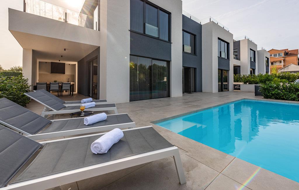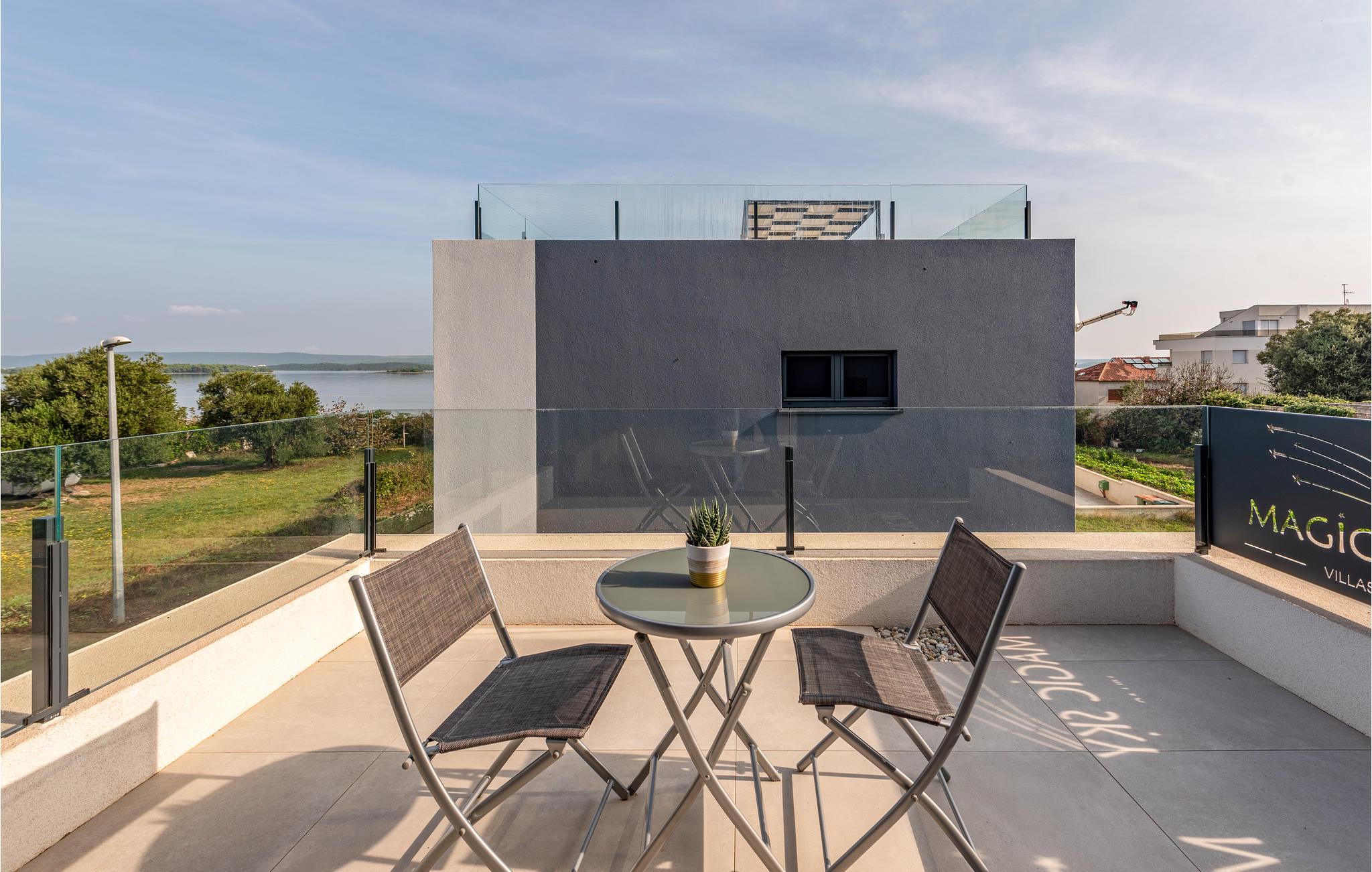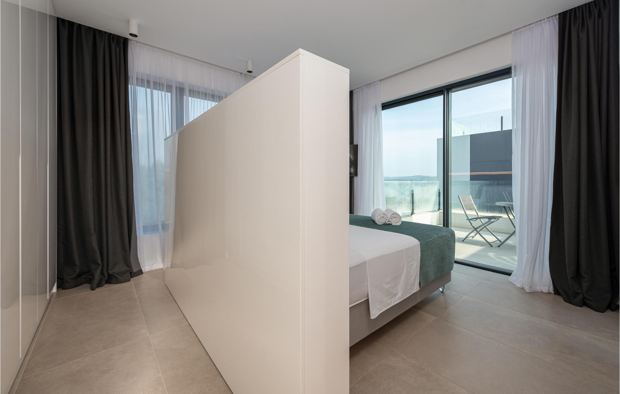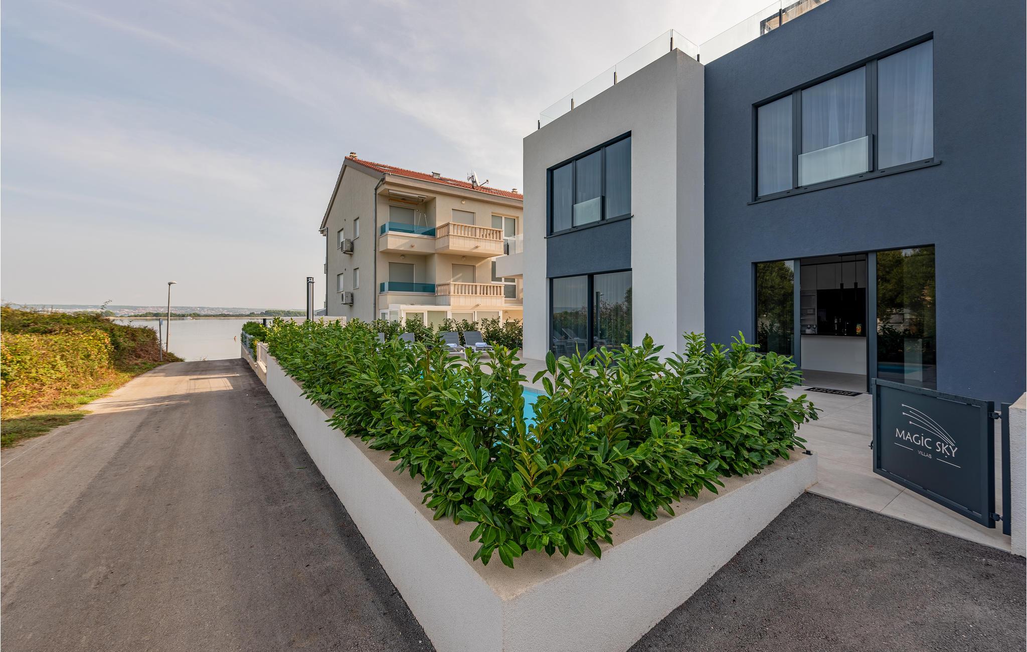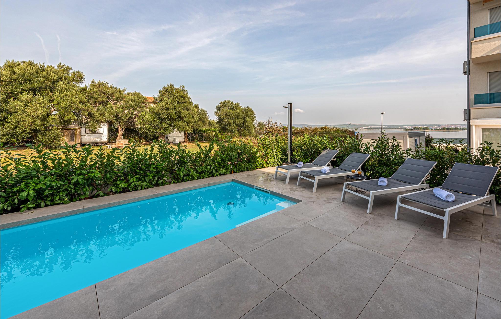 Dette moderne og rummelige feriehus med pool og jacuzzi ligger på øen Pasman, ikke langt fra stranden. Tilbring en uforglemmelig ferie i dette store og komfortable feriehus sammen med din udvidede familie eller par, du er venner med. Drømme går i opfyldelse her, for du kan fuldt ud nyde den højkvalitets indretning, den indbydende atmosfære og mange værelser og nyde socialt samvær og privatliv. Ikke alene har du det store opholdsrum til din rådighed, men hvis du træder udenfor, har du en smuk swimmingpool til din rådighed. Om aftenen kan I tilberede jeres yndlingsretter i udekøkkenet og spise dem sammen. Der er endnu et højdepunkt på taget, da en skøn tagterrasse strækker sig over hele gulvets areal, hvor I kan slappe af sammen i jacuzzien og havemøblerne og se ud over havet. Om natten kan du beundre den magiske himmel med dens stjerner. Rejser du med en stor familie eller med flere familier, der er venner, kan nabohuset også lejes. Grib din strandtaske og gå de få meter til stranden, som er en blanding af sand, beton og småsten. Dyk ned i det krystalklare vand og spil derefter beachvolley på stranden eller se dine børn lege på legepladsen. Pašman er synonymt med landskabets vilde skønhed, bugter og undervandsverden. Vandretur til Veliki Bokolj, et udsigtspunkt i sten, der giver et glimt af de fortryllende Kornati-øer. Du kan udforske offshore-øerne med båd og besøge den livlige havneby Biograd na Moru eller Zadar. Udforsk den historiske gamle bydel, mens du går gennem de små gader, er der mange smukke steder og attraktioner at opdage. Glæd dig til en afslappende ferie ved havet!