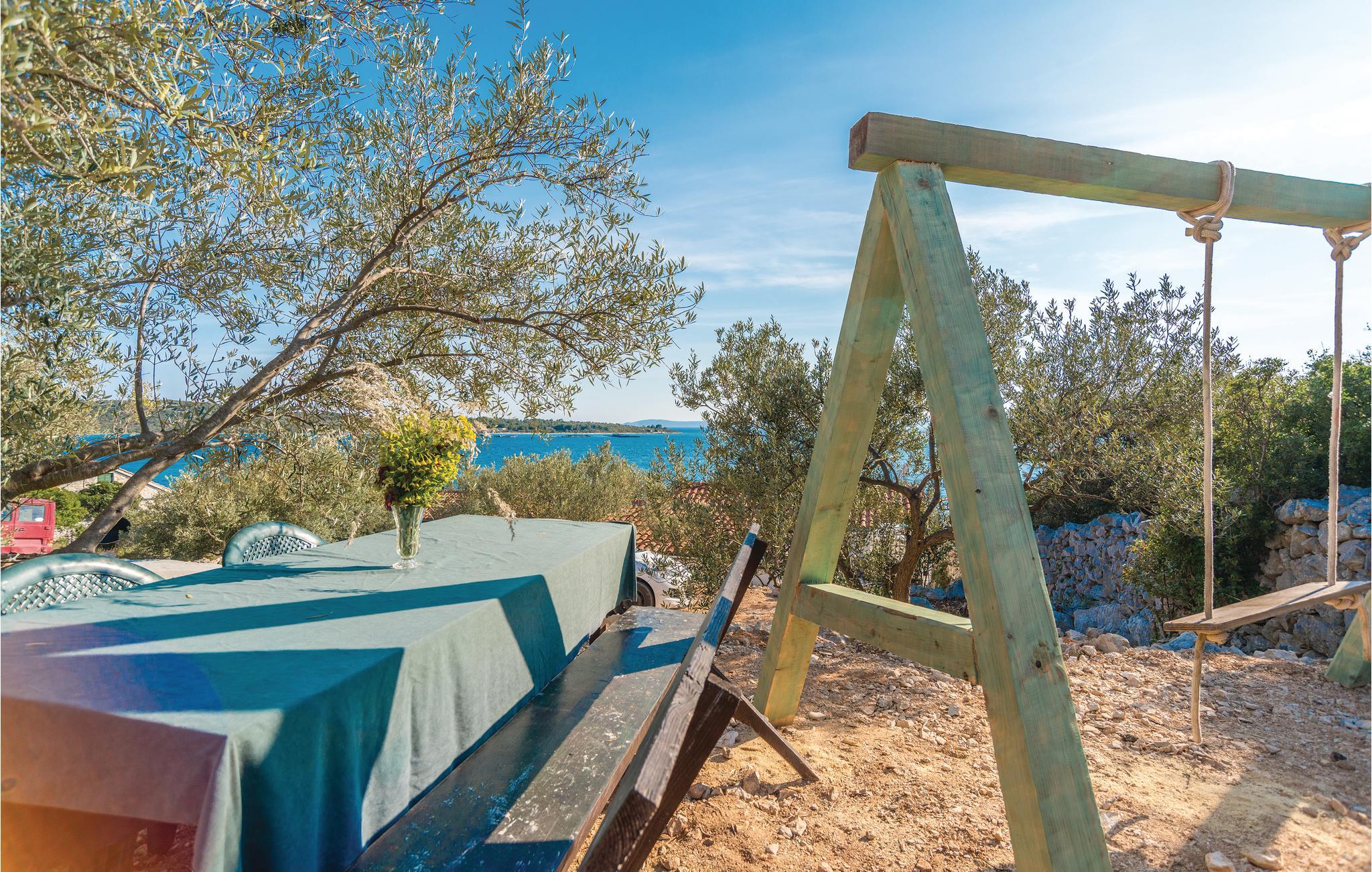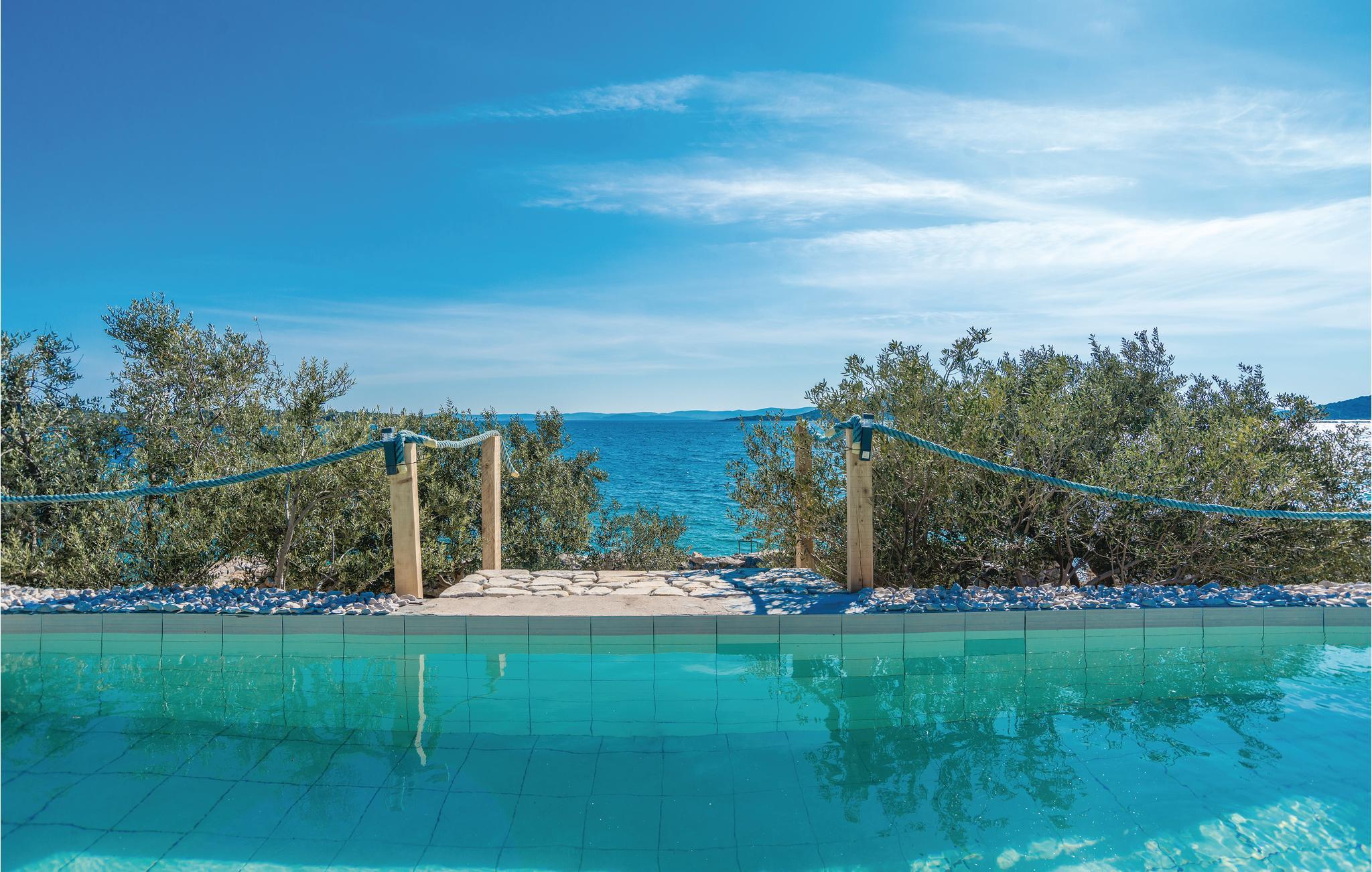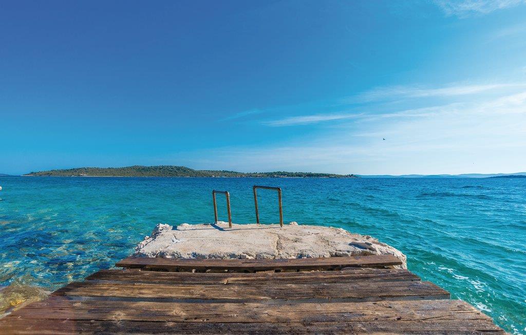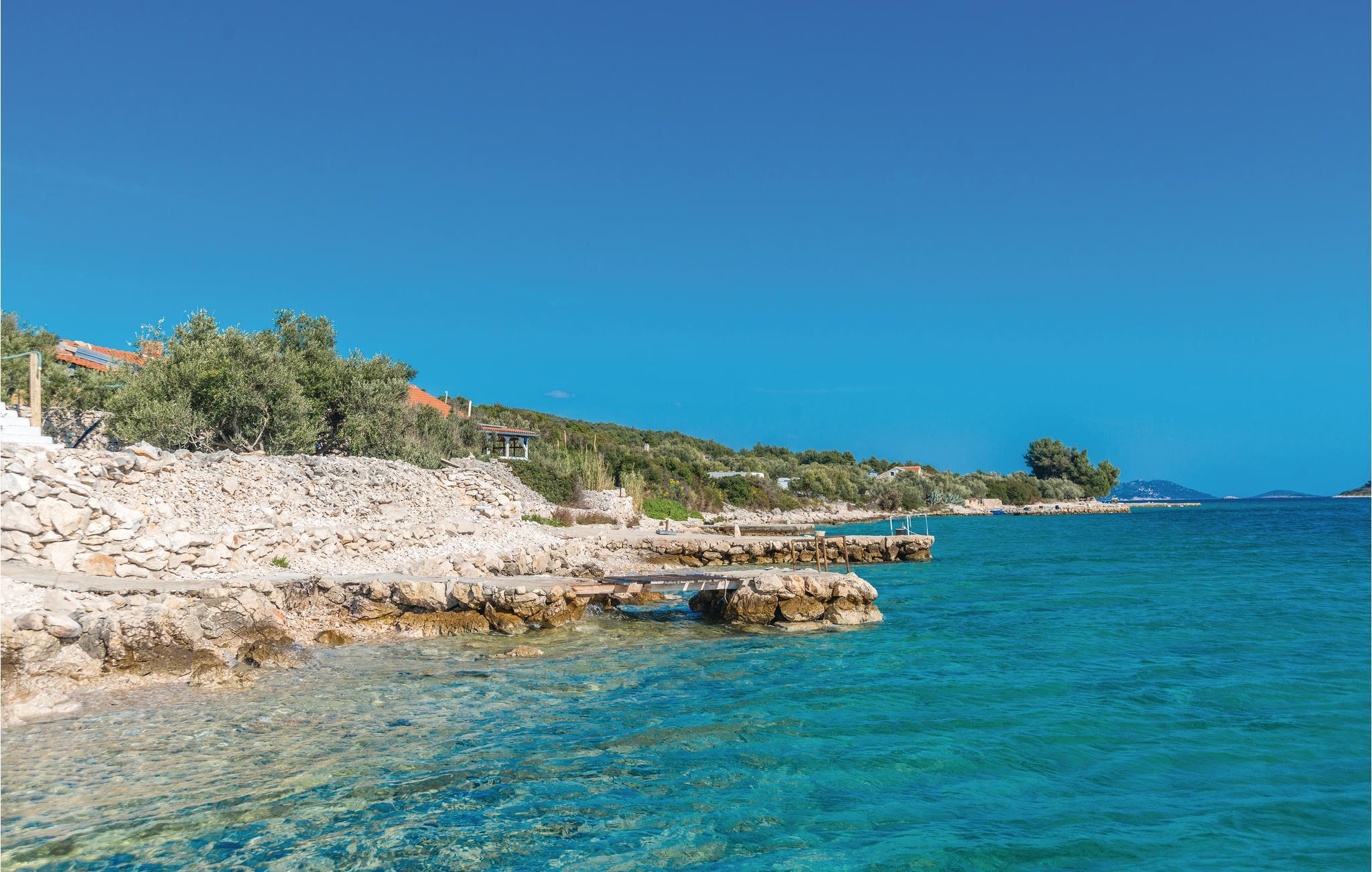 En helt paradisisk beliggenhed lige ved stranden, der udelukkende tilhører gæsterne i dette robinsonhus, vil tage mælet fra jer. Udendørs er der både en olivenlund, legeplads og pool med havvand. Feriedomicilet rummer tre soveværelser, køkken og to badeværelser, det ene med indgang udefra og fra soveværelset. Det er skønt at sidde på den overdækkede terrasse beskyttet mod sol og regn. Strømmen kommer fra solceller og det varme vand fra en gasopvarmet kedel. Efter aftale og mod betaling, kan der lejes båd hos ejer. Oplev jeres helt særlige ferie på øen Pašman.