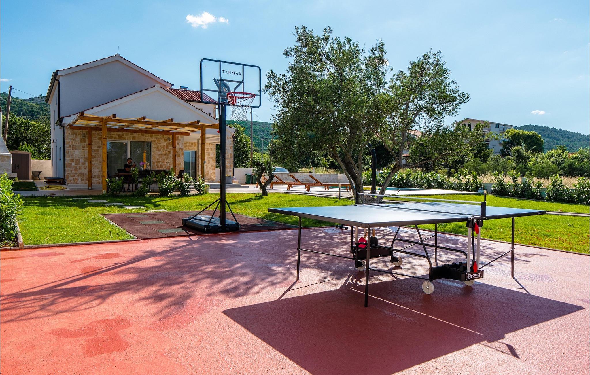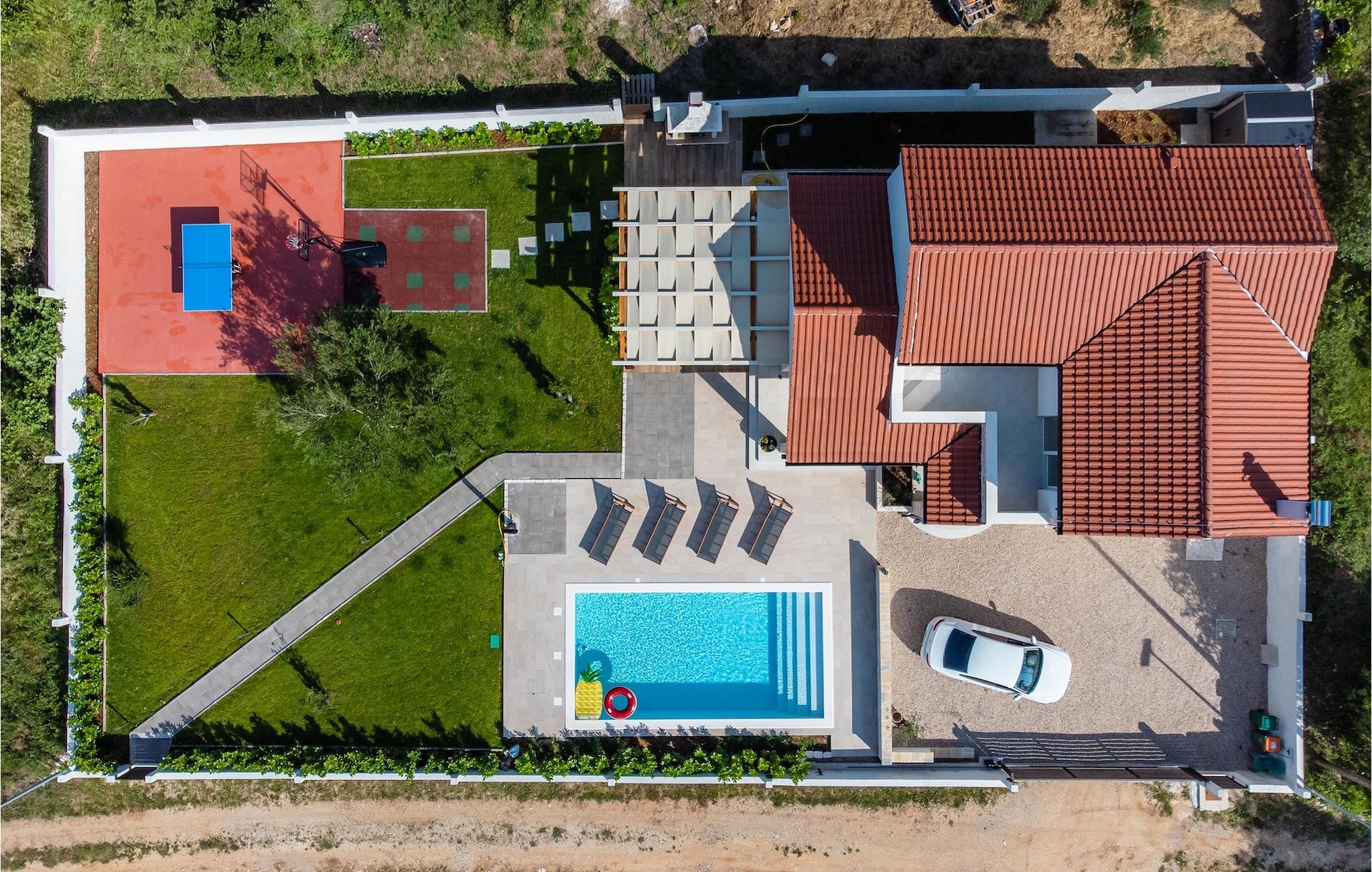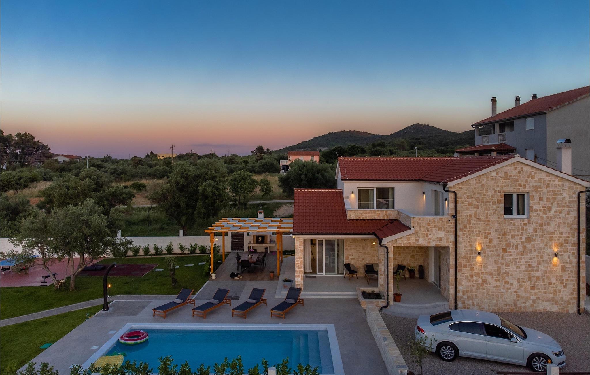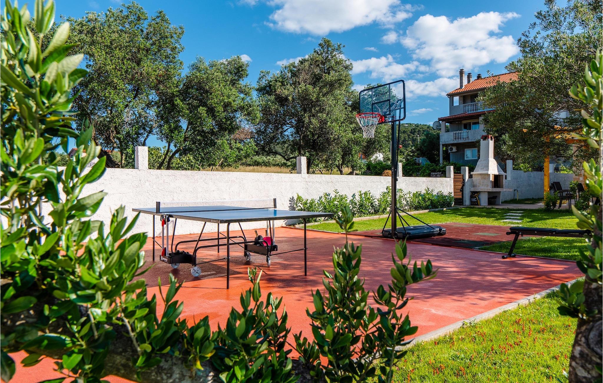 Tre lyse og komfortable værelser med aircondition er placeret på første sal. Et soveværelse har en dobbeltseng og eget badeværelse. De to andre har en dobbeltseng, som i et af værelserne kan skilles ad til to enkeltsenge, hvis det er nødvendigt, og de benytter badeværelset, der er placeret ovenpå. To værelser har udgang til terrasse. I stueetagen finder du endnu et soveværelse med aircondition med en seng til en person, der kan forvandles til en dobbeltseng efter anmodning og derfor giver mulighed for at rumme en ekstra person. Der er også et badeværelse mere, en opholdsstue med et tv og en pejs, som er forbundet med spisestuen og et fuldt udstyret køkken. Hele rummet har aircondition. Fra stuen har du adgang til haven, hvor du finder en swimmingpool og liggestole, hvor du kan slappe af og nyde den varme dalmatiske sol. Ved siden af huset er der en terrasse med spisebord, hvor du sammen med familie og venner kan nyde at smage de retter du har tilberedt på grillen, som også står til din rådighed. For gæster, der leder efter en aktiv ferie, er der et bordtennisbord og en basketballkurv til rådighed. Ejendommen er helt indhegnet og har privat parkering til 4 biler. Book din bolig i Villa Holiday Home Bodula og tilbring en afslappende ferie med familie og venner.Villa Holiday Home Bodula ligger på øen Pašman i Zadar-øgruppen. Du kan nå øen med færge fra Zadar eller Biograd. Det er en smuk ø med rige urter og fyrretræer, der er ansvarlige for de intense og uimodståelige middelhavsdufte i luften. Øen er dog ikke kun kendt for sin smukke natur og strande, men også for sin rige kultur og arkitektur helt tilbage til det 12. århundrede. Øen er bestemt et besøg værd, og den er forbundet med øen Ugljan med en bro, så der er meget mere at udforske. Pašman-kanalen er kendt for sit ekstremt rene hav på grund af havstrømmene i området. De nærmeste strande ligger kun en kort gåtur fra villaen. Pašman er et godt valg for fans af ekstremsport og cyklister, hvilket er en god måde at udforske denne øs naturlige skønhed. Vi anbefaler dig også at besøge nærliggende byer som Zadar, Nin eller Šibenik. Hvis du er i Zadar, så besøg kirken St. Donat, Salutation to the Sun og Havorgel. I Nin finder du smukke sandstrande, en saltpande og helbredende mudder. Besøg forlystelsesparken i Biograd, og er du naturelsker, så gå ikke glip af en tur til naturparken Vrana-søen, og nationalparkerne Kornati, Krka eller Paklenica.