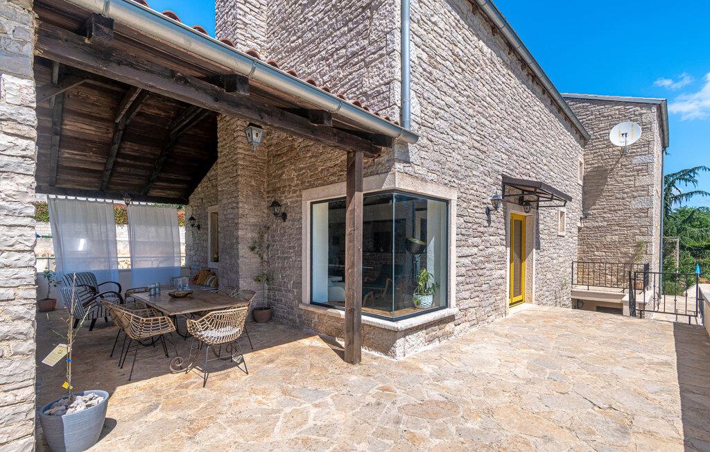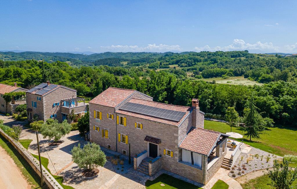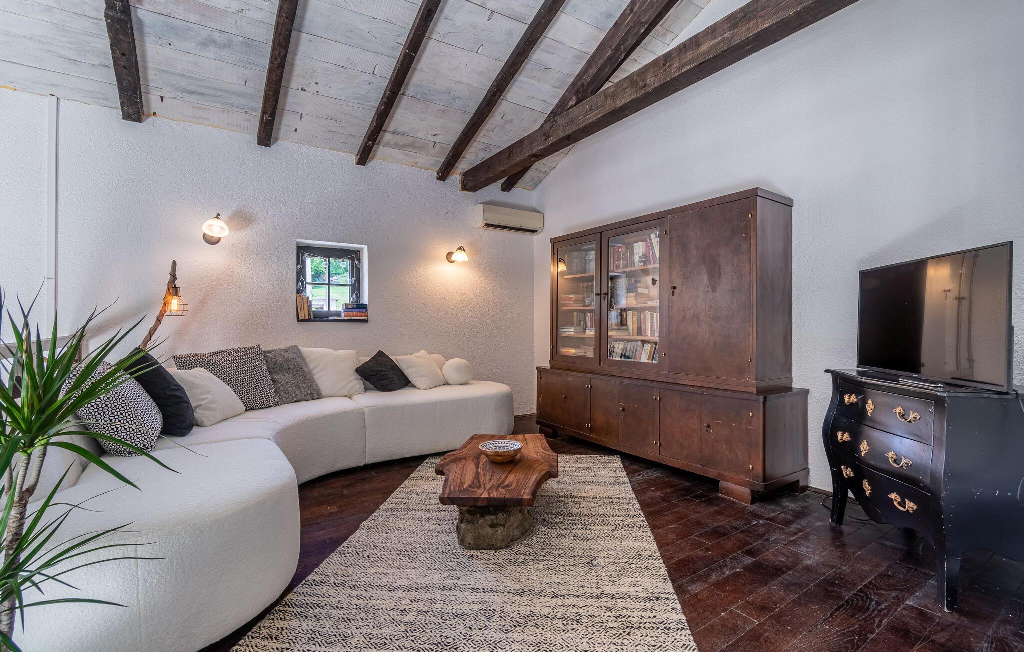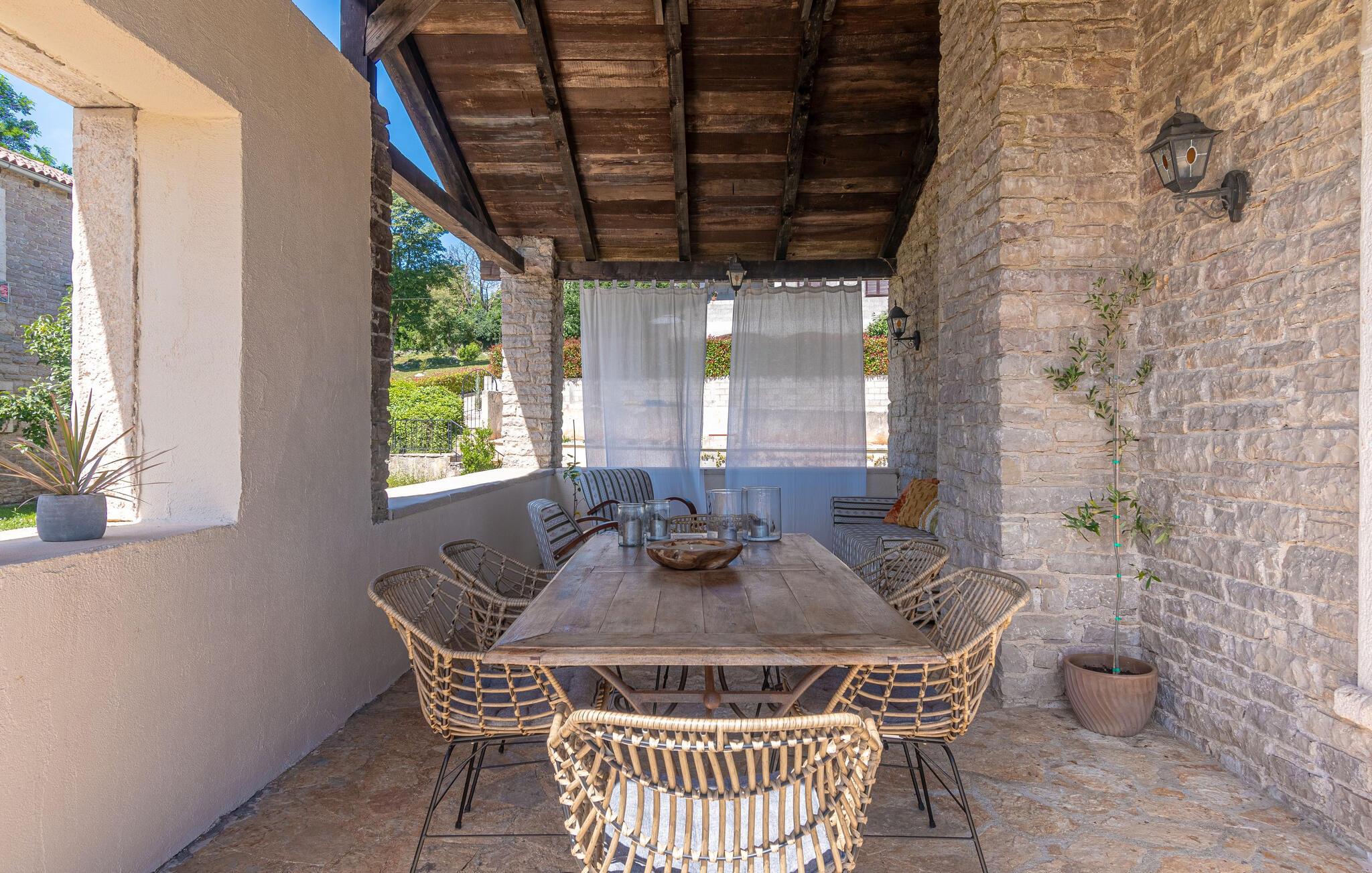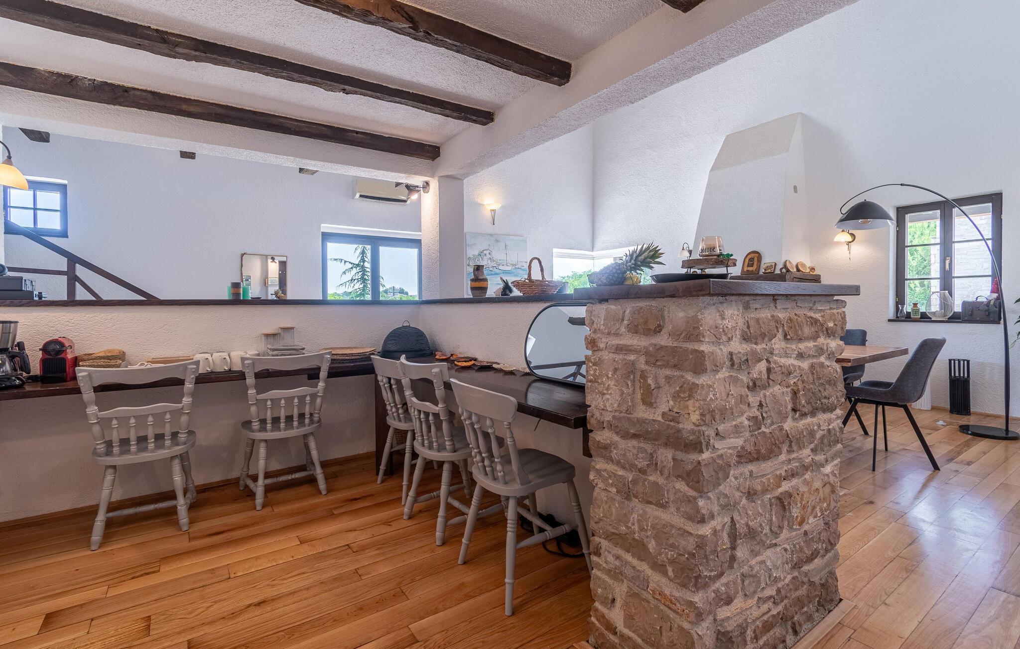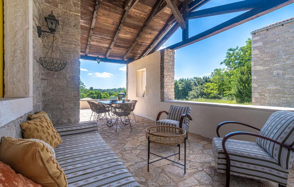 Jeres moderne feriehus i Brajkovici nær Pazin byder på rustik elegance og maksimal komfort. Slå jer ned på den solrige terrasse, udstyret med komfortable udendørsmøbler, og nyd den fredelige atmosfære. For en forfriskende dukkert kan I hoppe i poolen, mens saunaen giver afslapning for både krop og sind. Start dagen med en afslappet morgenmad på den store overdækkede terrasse, og afslut aftenen med en hyggelig grillaften. Det rummelige opholdsrum i huset indbyder til afslapning, hvor den rustikke charme i indretningen skaber den perfekte stemning for velvære.