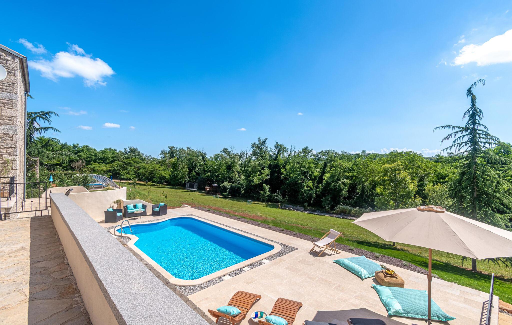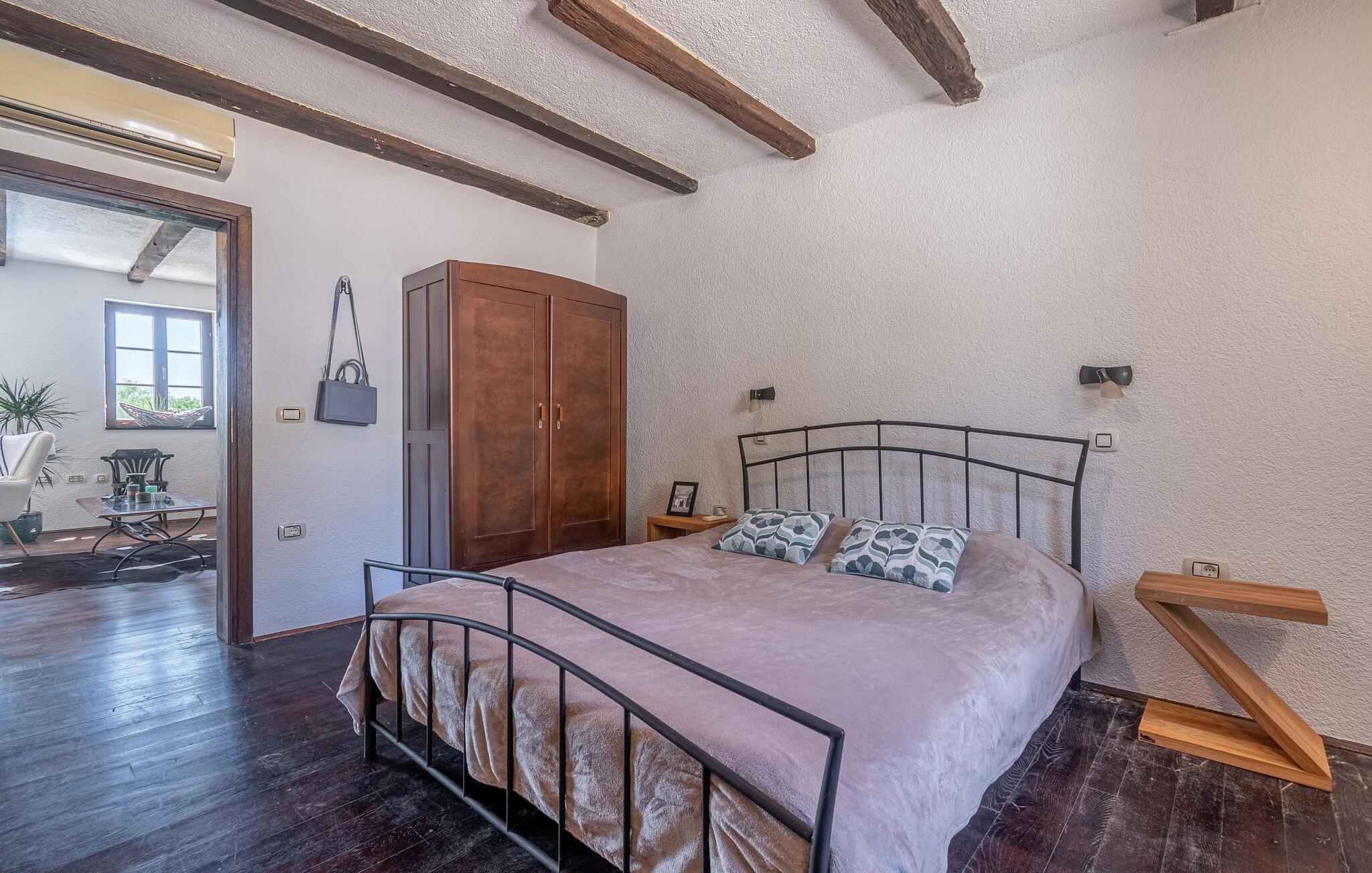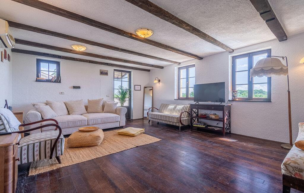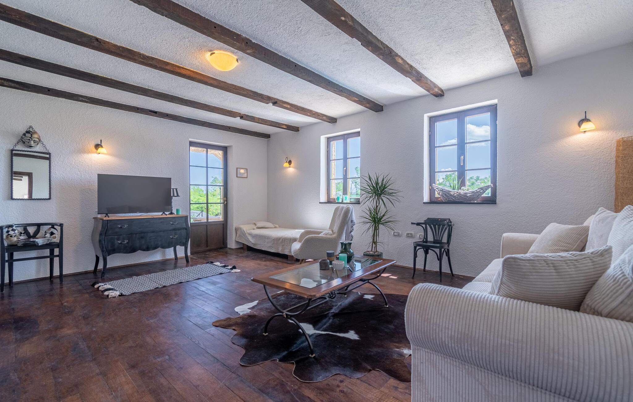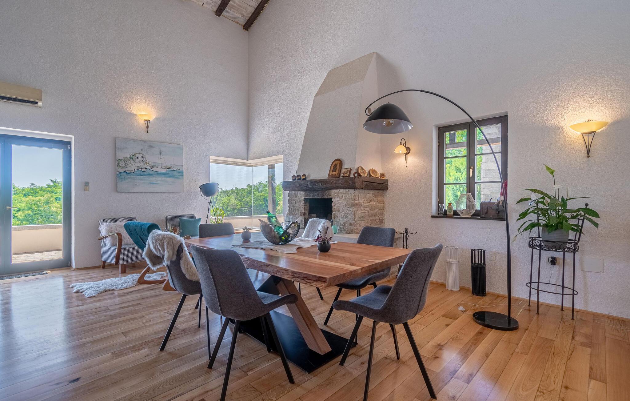 Jeres moderne feriehus i Brajkovici nær Pazin byder på rustik elegance og maksimal komfort. Slå jer ned på den solrige terrasse, udstyret med komfortable udendørsmøbler, og nyd den fredelige atmosfære. For en forfriskende dukkert kan I hoppe i poolen, mens saunaen giver afslapning for både krop og sind. Start dagen med en afslappet morgenmad på den store overdækkede terrasse, og afslut aftenen med en hyggelig grillaften. Det rummelige opholdsrum i huset indbyder til afslapning, hvor den rustikke charme i indretningen skaber den perfekte stemning for velvære.